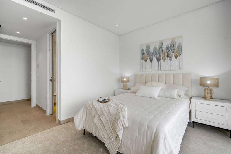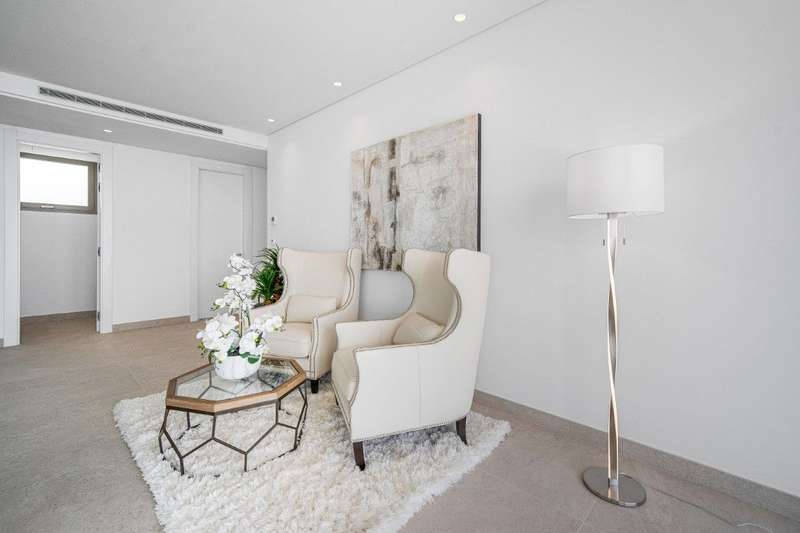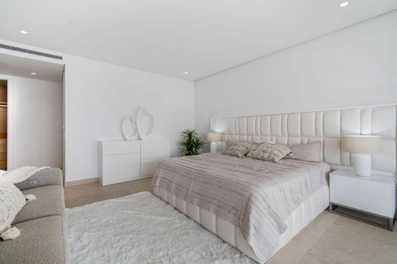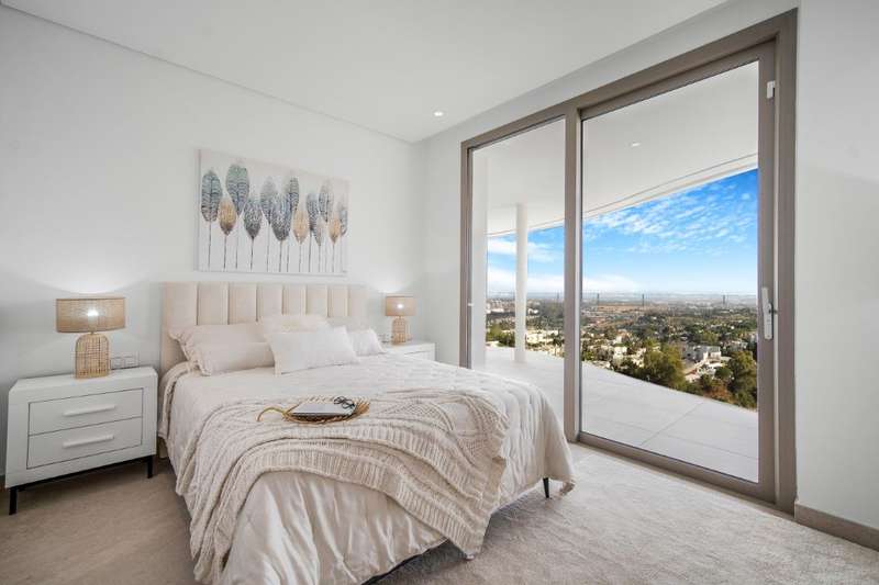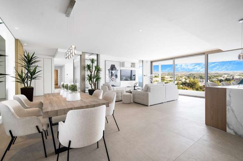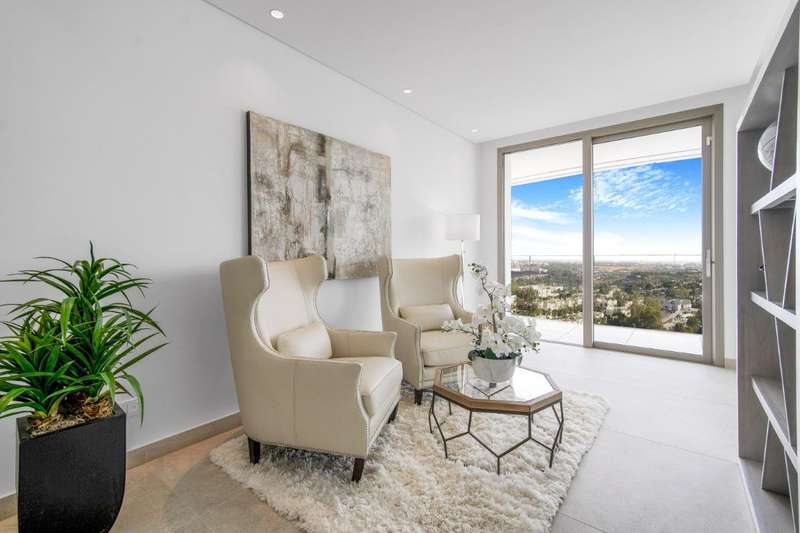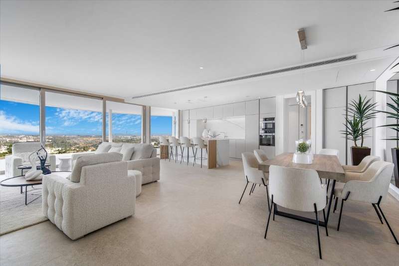 This luxurious three bedroom apartment is located in the brand new exclusive community in Benahavis. Situated in an elevated position above Marbella's famous Golf Valley, this property offers breathtaking panoramic views of the Mediterranean sea and beyond. With its prime location, it is just a ten-minute drive to San Pedro and fifteen minutes to Puerto Banús. This development is an award-winning gated community that offers a range of amenities to its owners. These include 24-hour security, a concierge service, a health club with a full spa, gym, indoor and outdoor pools, and lush gardens. It is truly a haven for those seeking luxury and tranquility. Designed to optimize natural light, this apartment features spacious open plan living and dining areas. The fully fitted kitchen is equipped with top-of-the-range appliances, making it a chef's dream. The apartment boasts two master suites, each with access to the terrace, offering stunning views. There is also a guest suite, a gue