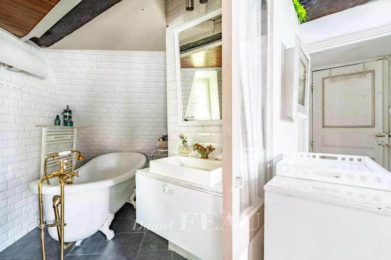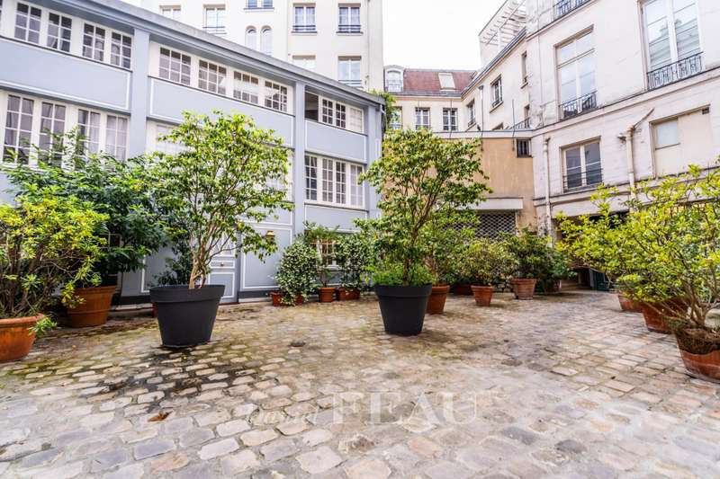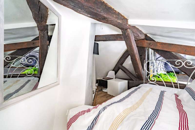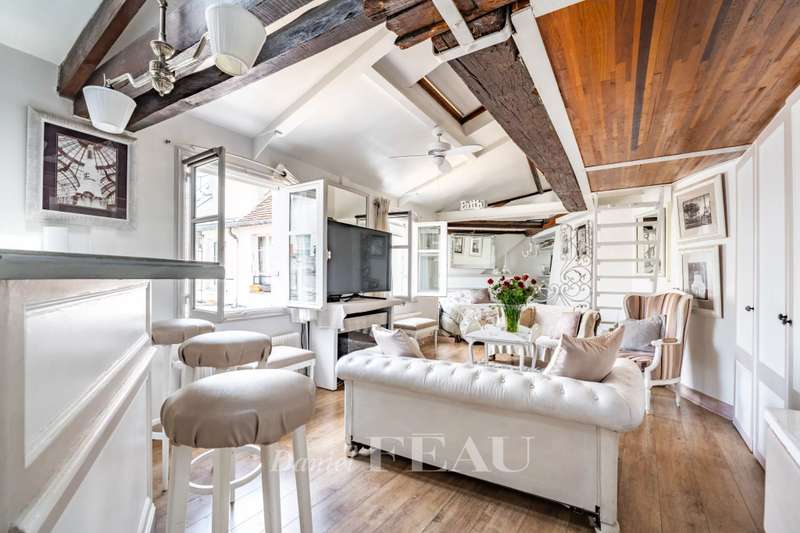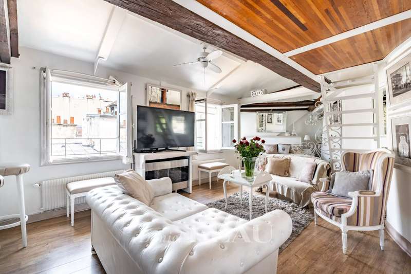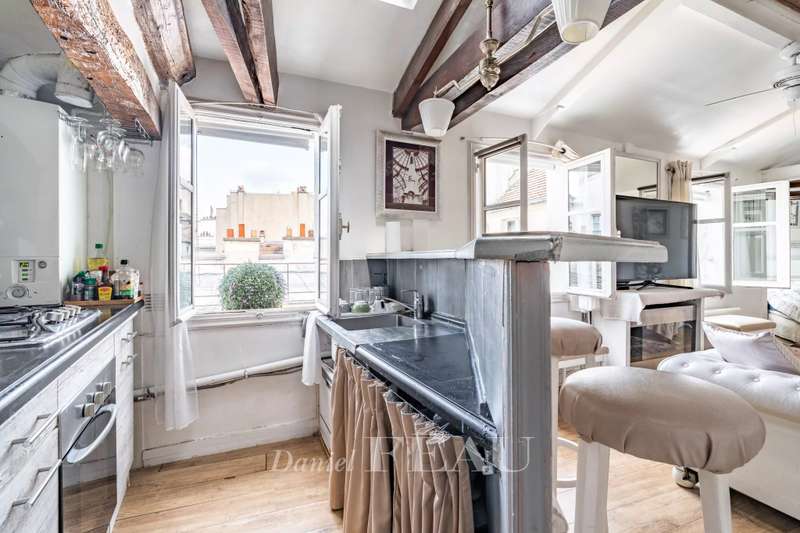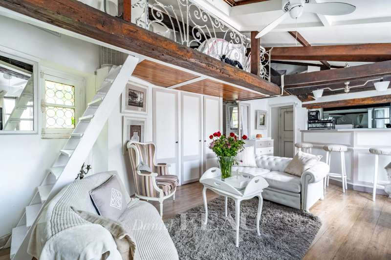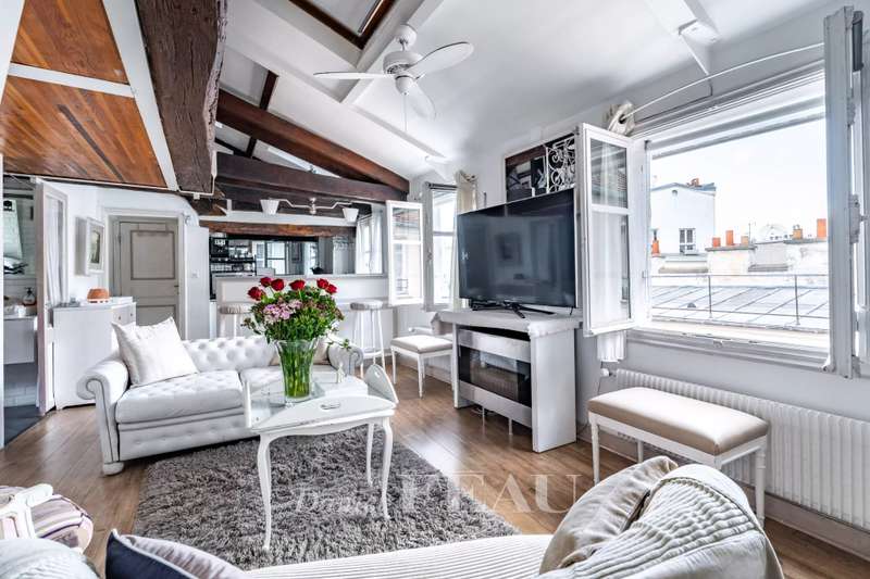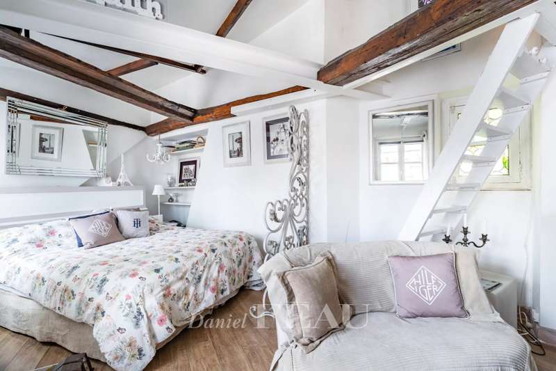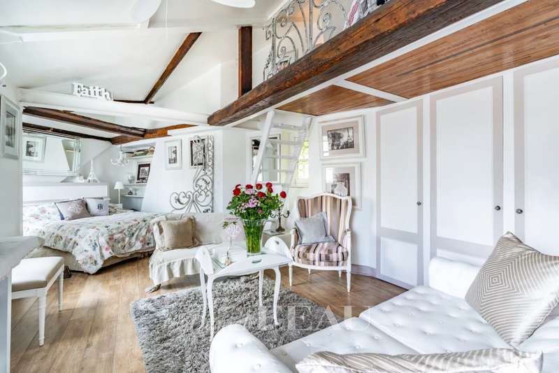 Rue de Seine, Saint-Germain-des-Prés. This apartment in perfect condition and bathed in sunshine is on the 4th and top floor of a fine 19th century building. Overlooking a peaceful courtyard, it includes a bright main room with an open-plan kitchen, a mezzanine bedroom area, a bathroom and wc.