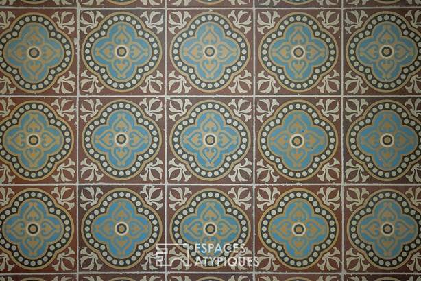 The beautiful front door of the small condominium of 4 lots opens onto a wooden staircase, flanked by a very pretty stone wall completely renovated, and a floor made of antique cement tiles.