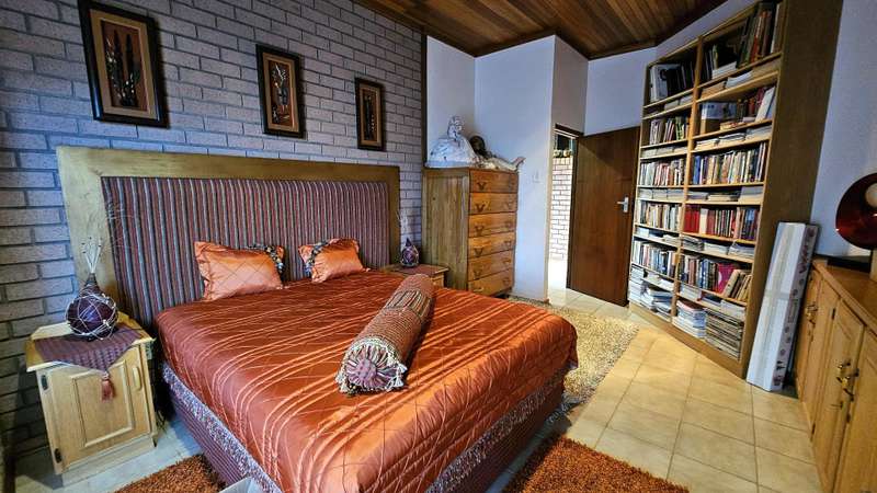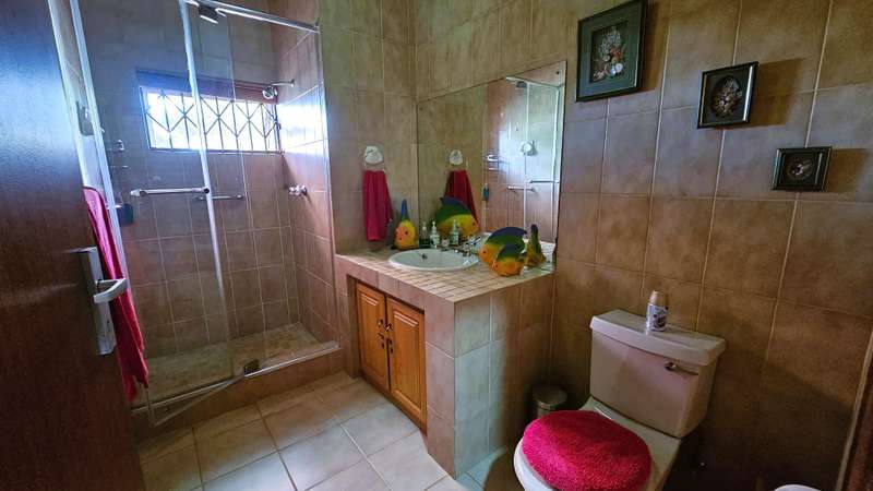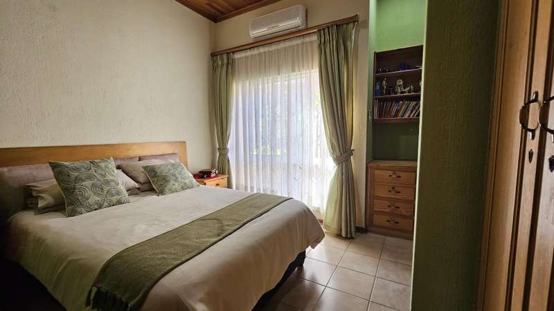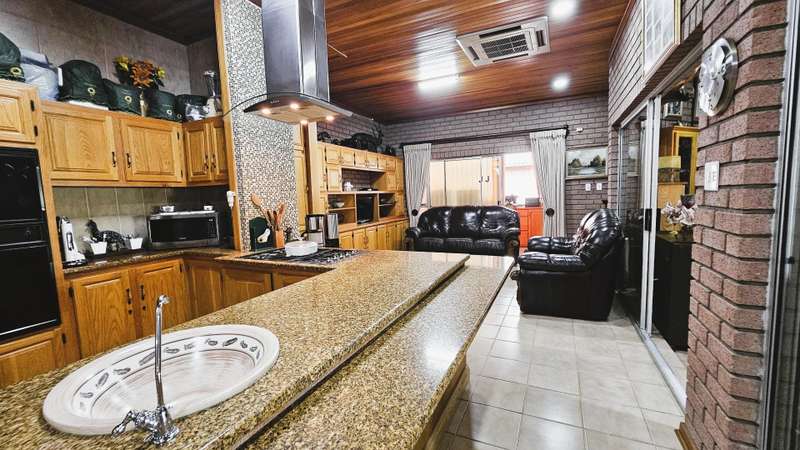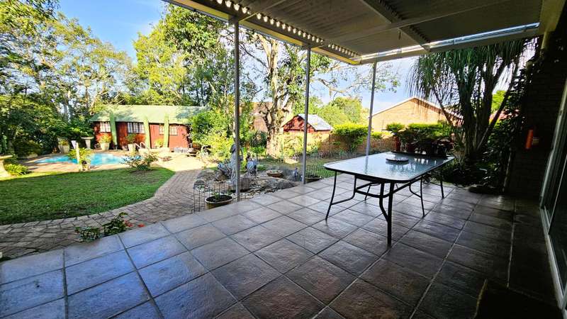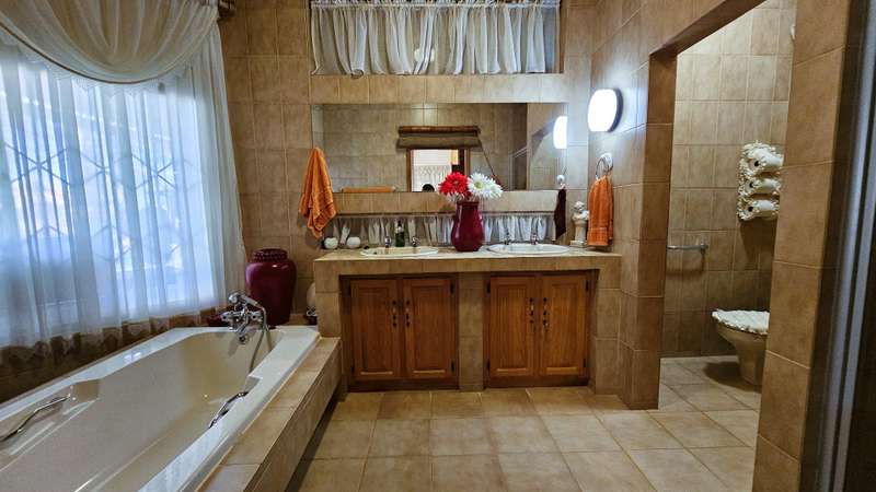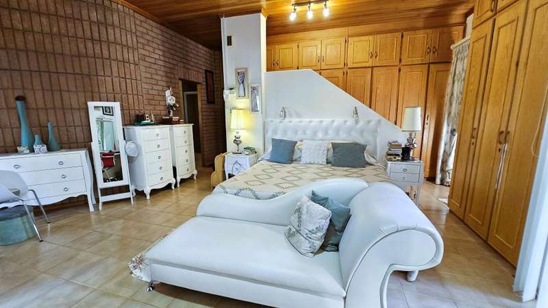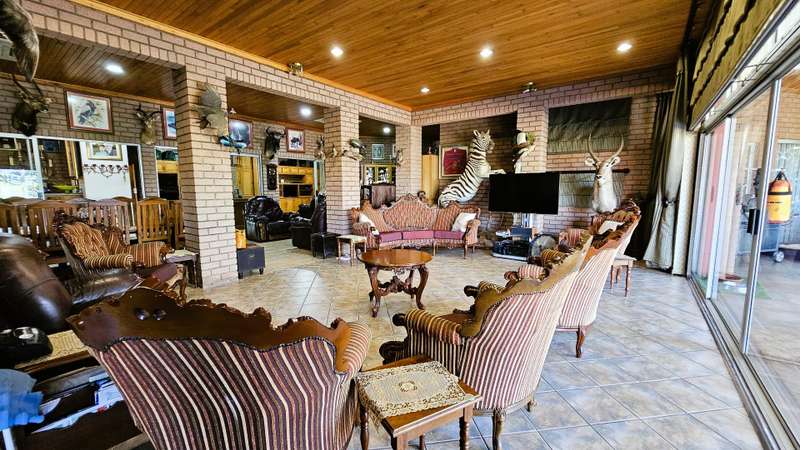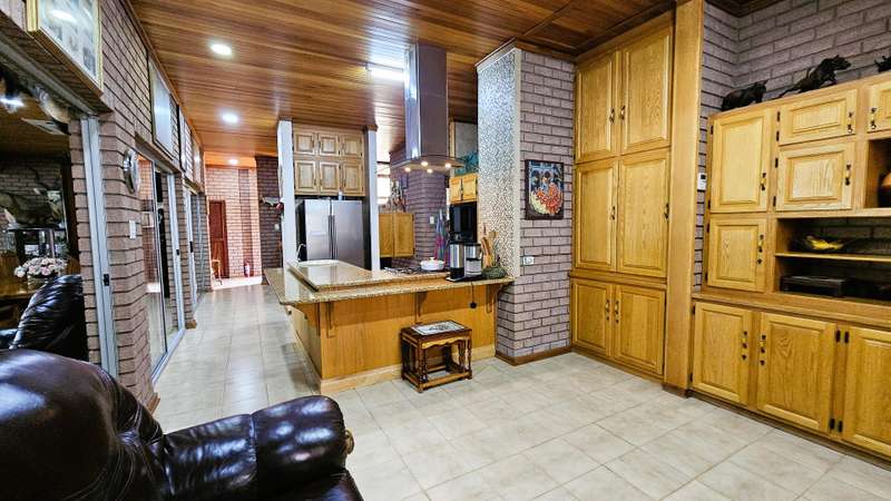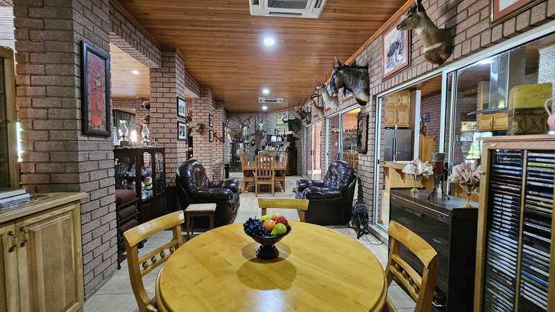 This impressive fully walled family home offers space, security and style. Boasting 5 bedrooms, 3 bathrooms and 2 guest toilets, makes it perfect for a large family or those who love to entertain. The welcoming entrance features a custom sleeper-wood door leading into expansive living and dining areas, complemented by an open-plan kitchen with granite tops, walk-in pantry and oak timber finishes throughout. Enjoy seamless indoor-outdoor living with a covered patio overlooking a sparkling pool and beautifully landscaped garden filled with indigenous trees. Extras include a coffee/liquor bar, three automated garages, double shadenet carport, air-conditioning, a 32 Kva generator, full staff accommodation, and two wendy houses (one for storage and one for additional living space with a bathroom). A large workshop also offers ample storage space. Security is top-notch with electric fencing, an alarm system and trellidoors. This home is a rare find ?Çô spacious, secure and truly inviting.