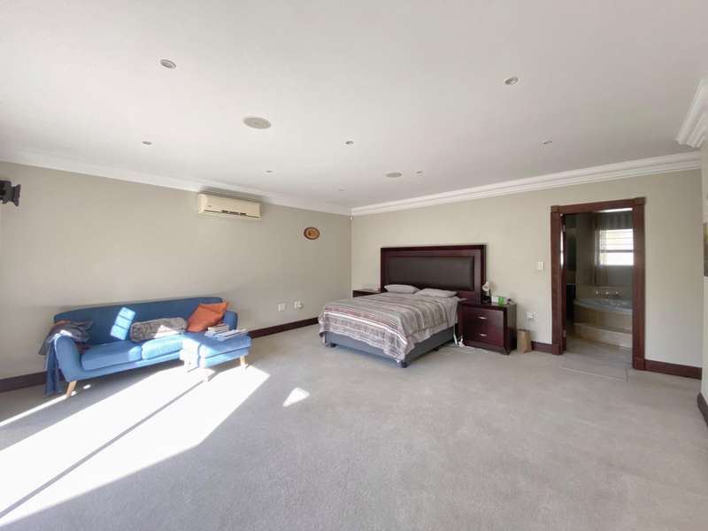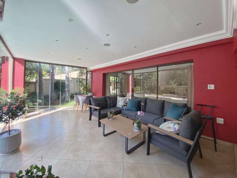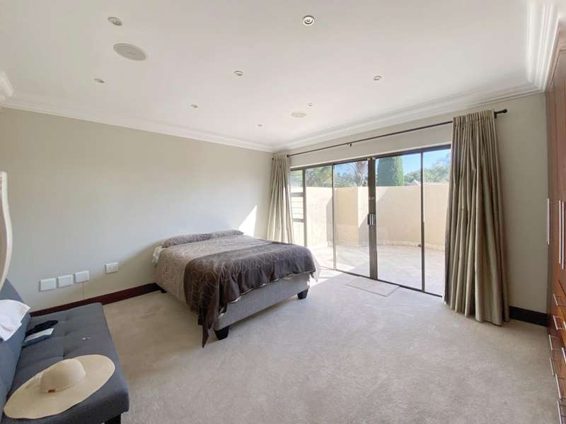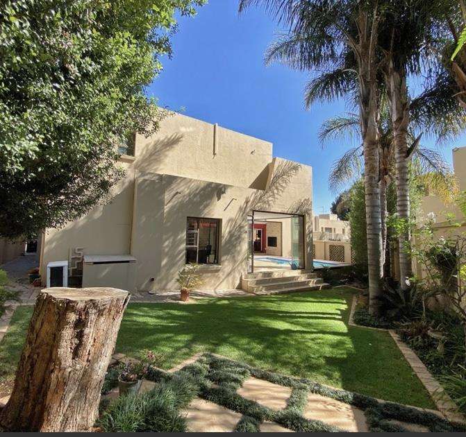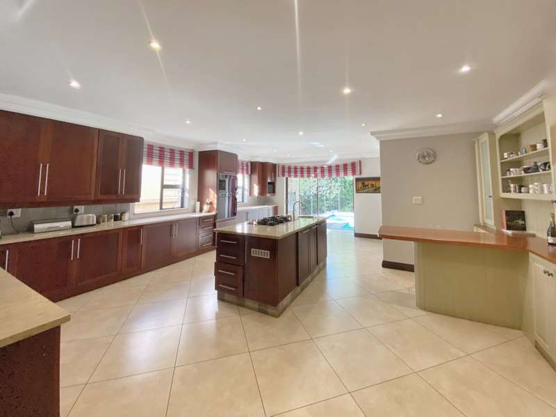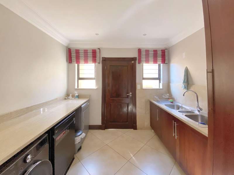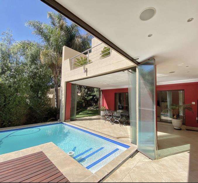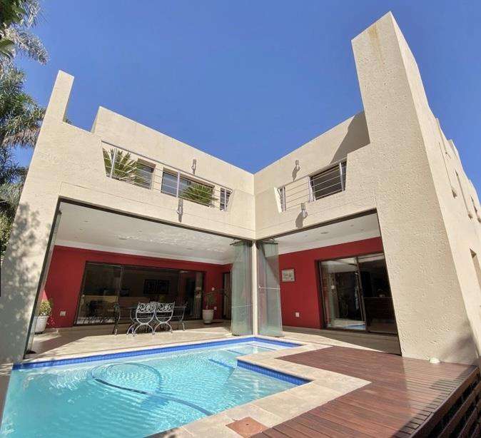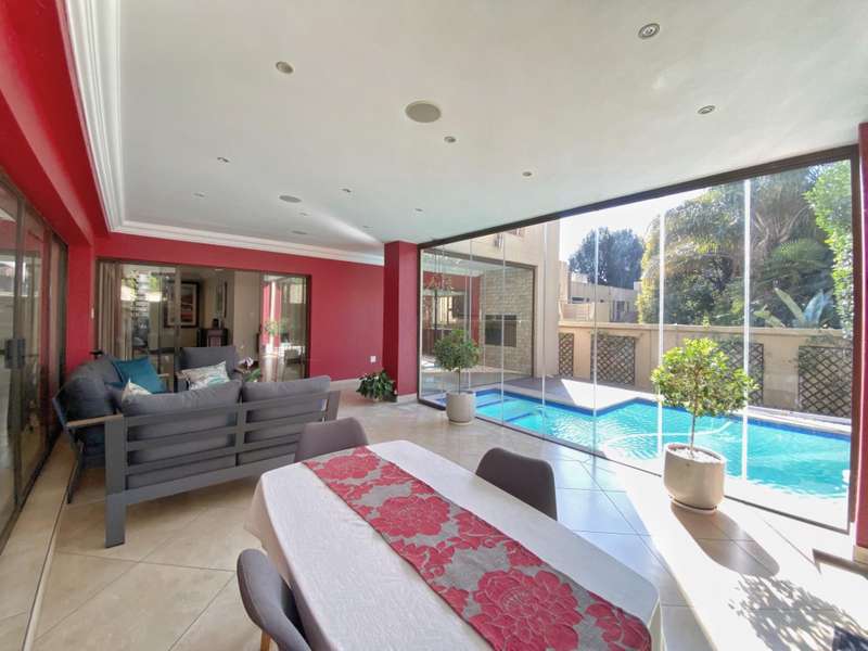 Set within an access-controlled cluster complex in a prominent position in Upper Bedfordview, this bright and modern family home boasts refined finishes throughout. Welcome upmarket living with well-proportioned, open plan receptions flowing effortlessly onto a brightly-lit covered patio. The entrance hall leads onto the spacious dining room leading onto the formal lounge and expansive warm wood kitchen. The kitchen is complimented with quartz tops, chrome finishes and a separate scullery. The kitchen offers good cupboard space and windows and doors leading onto the manicured surrounds with a sparkling pool. The 4 bedrooms are all located upstairs and offer 3 bathrooms (2 en suite) PLUS a family room with fitted study area. This generous home is also solar-powered and features piped sound, air-conditioning, staff accommodation and triple automated garages - all within a small cluster-style complex!