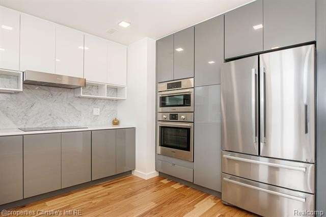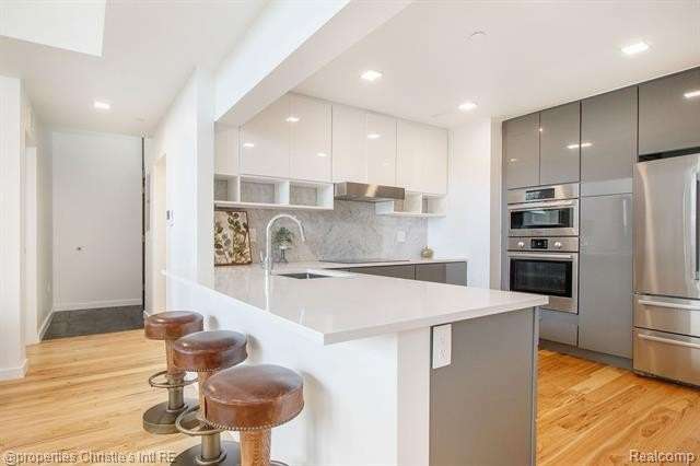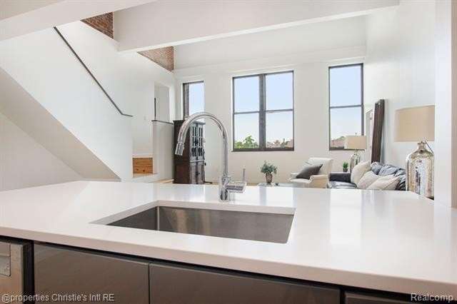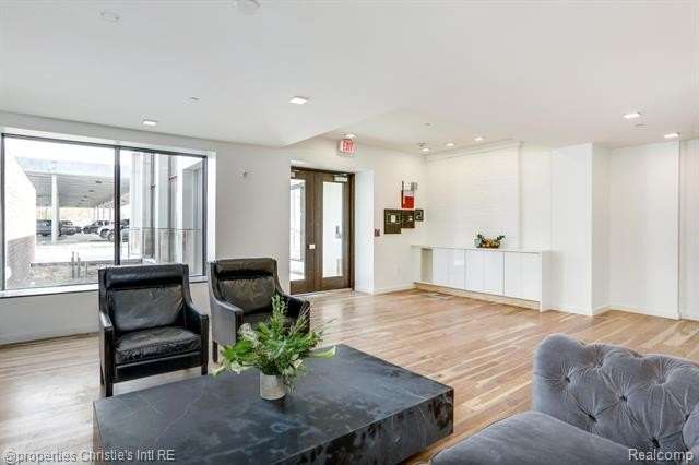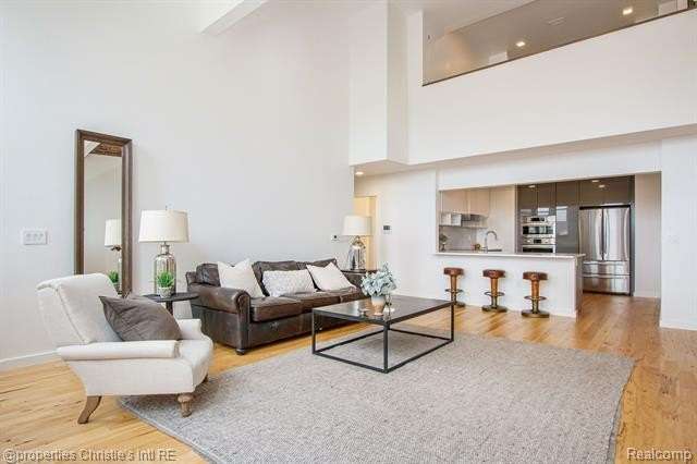 The Saint Charles Residences! This 3 bed 2.5 bath space offers hickory wood flooring throughout, large windows w/ tons of natural light and soaring 25 ft. ceilings! The entry level has an open living and dining area with views of the Detroit skyline. The first floor also offers gracious bedroom and 1.5 baths. Walk up to the mezzanine level to the master suite with private walk in closet and full bathroom. The kitchen is equipped with bright white quartz countertops, marble backsplash, Kraftmaid cabinets, Bosch stainless appliances and Grohe fixtures. In-unit washer/dryer and assigned parking! The common areas on each floor display specially curated art collections. Close to downtown with many neighborhood parks, shops, and dining