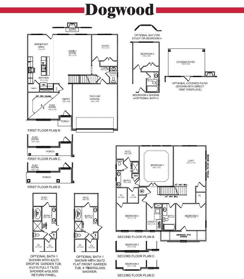 The two-story Dogwood plan offers lots of room to spread out, with an optional guest suite on the first floor and a primary bedroom suite plus two bedrooms and loft on the second floor. The flex room off the entry can serve as an office or formal living or dining room. The kitchen includes a step-in pantry and island with counter dining, opening to the large central Family Room. The first-floor guest suite also includes a bay window and a full bath. The hall from the garage offers semi-private access to the guest suite area. The upstairs primary bedroom includes a trey ceiling, and the bath has a double bowl vanity, 5' shower, linen closet, and dual closets. An option for a garden tub or whirlpool and separate shower stall is also offered. Two bedrooms with generously sized closets, a hall bath, a utility room with folding counter, and large loft complete the upstairs. This plan includes a walk-in unfinished attic storage area off bedroom #2.