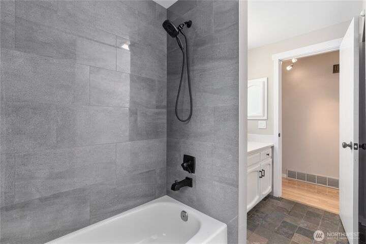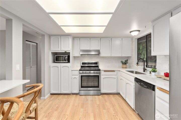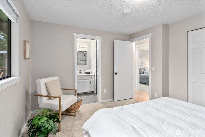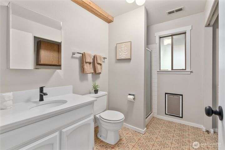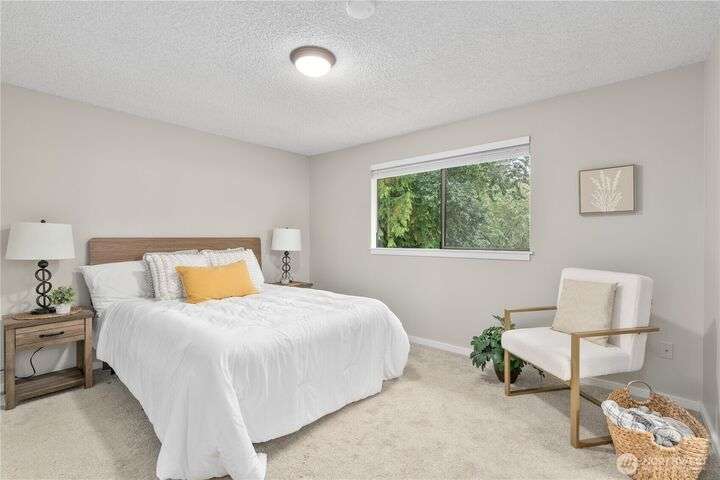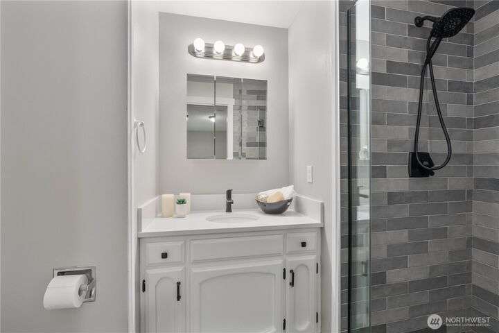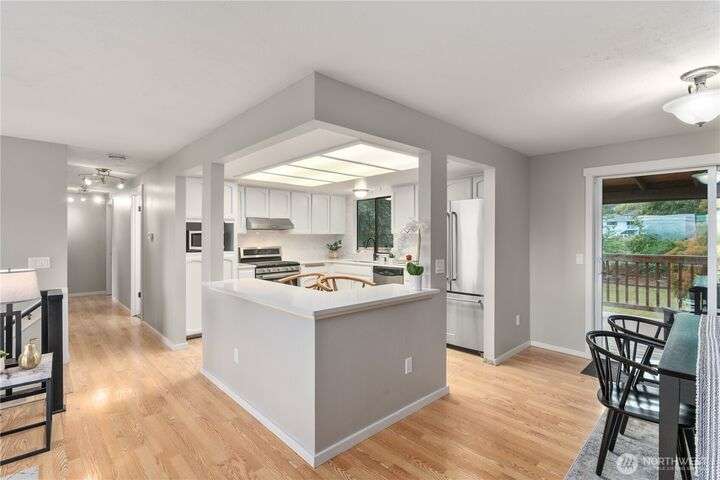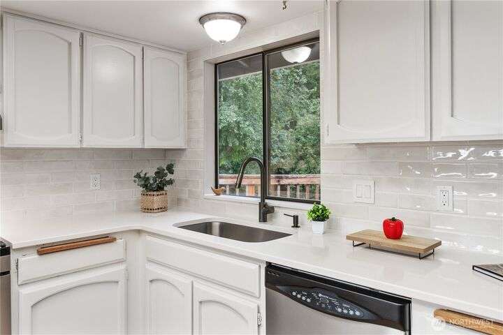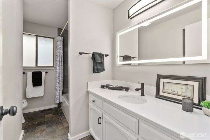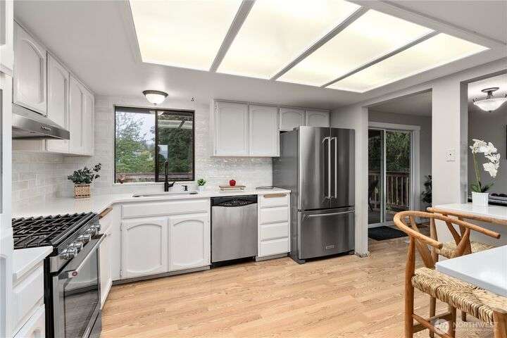 Nicely updated home on a gorgeous ½-acre with mountain and valley views. Warm hardwoods and a fireplace anchor the living room; the dining area opens to an expansive deck. The open kitchen has quartz counters, breakfast bar & stainless appliances. 3 bedrooms/2baths on main level including owners en-suite. Upgraded baths, with new fixtures, premium tile floors and shower walls, and sleek quartz countertops. Spacious lower-level family room with a 3rd bath. Large deck overlooks the fully fenced, private level backyard with room for pickleball/basketball & gardens. Oversized 2-car garage, covered RV parking & a mature apple tree and new roof! Quiet dead-end street with a rural feel, yet minutes to amenities & commuter routes.