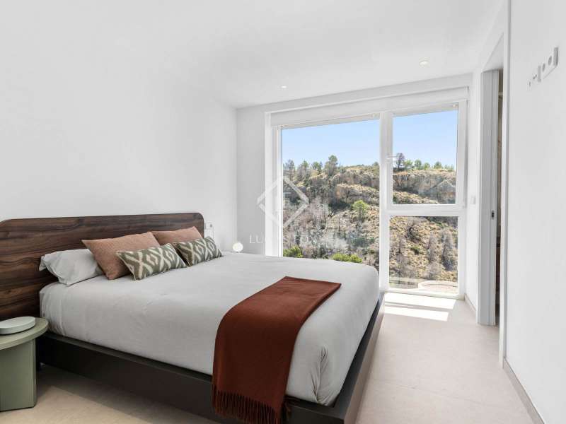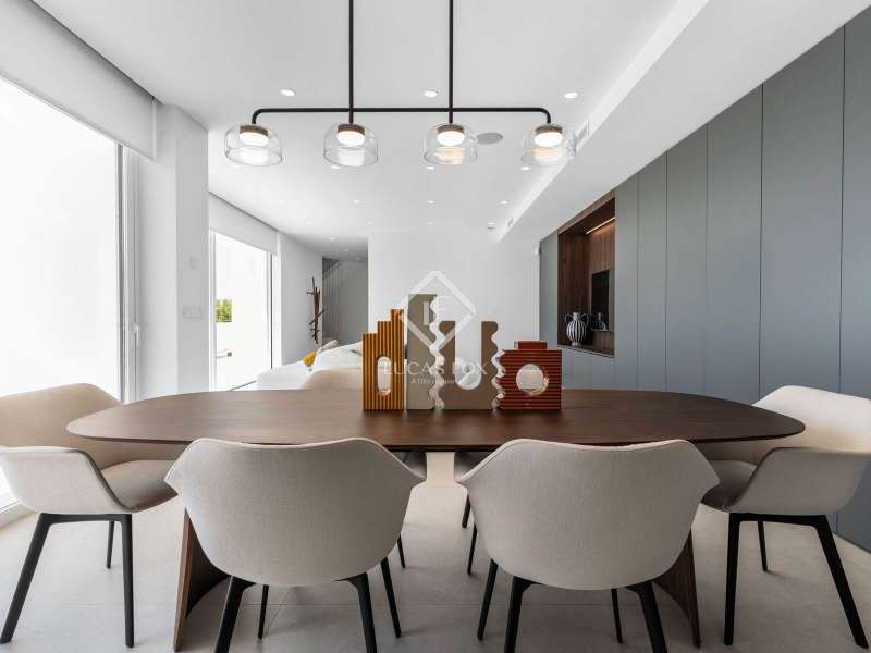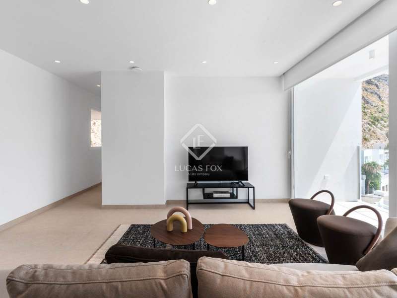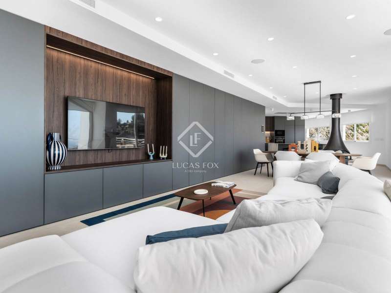 In Altea, you'll find an impressive four-story property that combines contemporary design, elegance, and unparalleled views. From any point in the house, you can admire the Mediterranean Sea, the surrounding pine forests, and the Benidorm skyline. Every sunset becomes a spectacle that reflects the essence of the Mediterranean lifestyle. The interior design is clean and modern, with white tones, sandy-colored flooring, and large open spaces that allow plenty of natural light to enter. The layout of the rooms has been carefully designed to offer functionality and comfort in every corner. Among its main features is a large garage with capacity for three vehicles and pre-installed electric charging stations. The jewel of the property is the master suite , located on the solarium floor , which features a large dressing room, a luxurious bathroom , and a private terrace with spectacular sea views, ideal for enjoying moments of privacy and relaxation. The property has four bedrooms, all with private bathroom, and the possibility of adding a fifth. It also features a billiard room, several living rooms, an study , and a large day area that occupies an entire floor and connects directly to the terrace and pool. A lift provides access to all levels of the property. On the main floor , a spacious dining room living room opens onto the terrace and a large kitchen with a center island and breakfast bar. Walnut finishes, gray accents, a freestanding fireplace , and retractable windows integrate the interior and exterior, creating a perfect space to enjoy the Mediterranean climate and light year-round.
