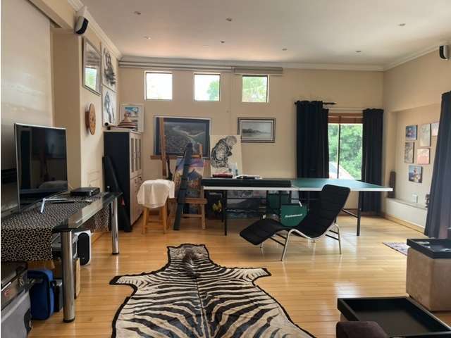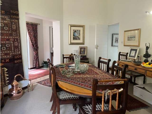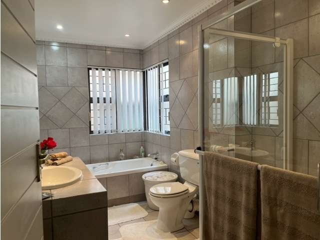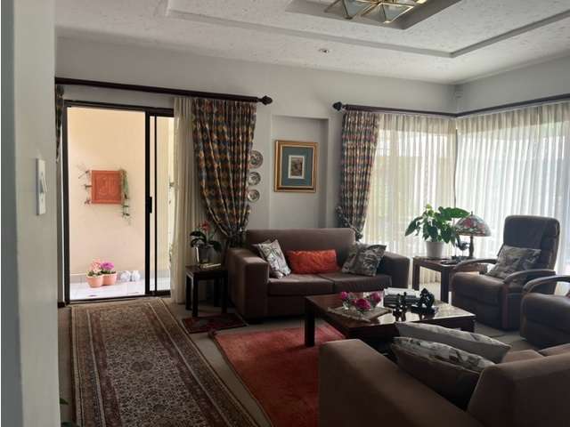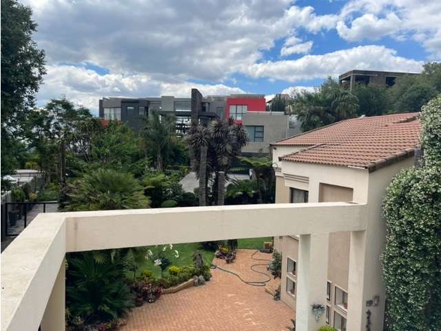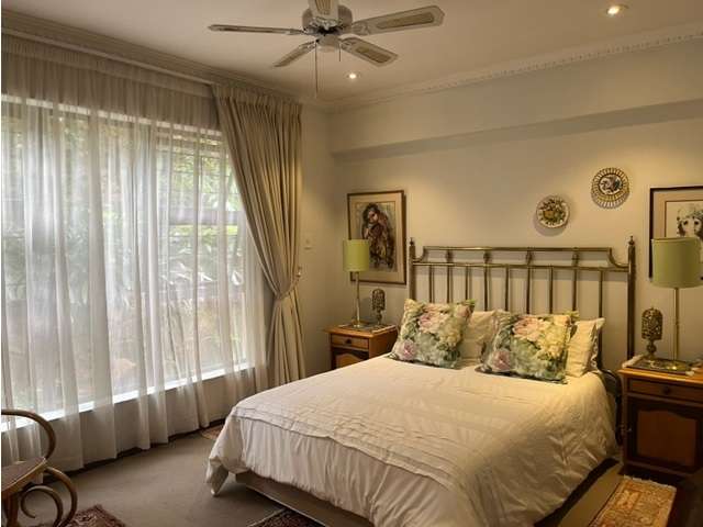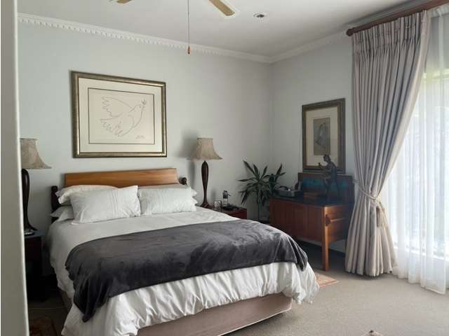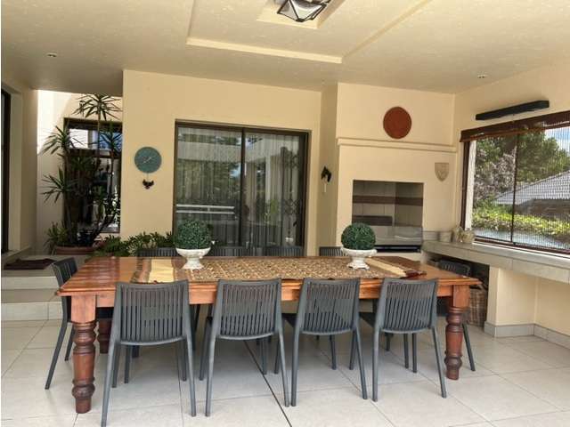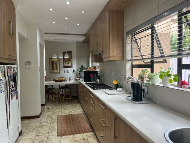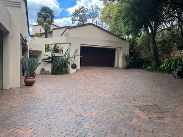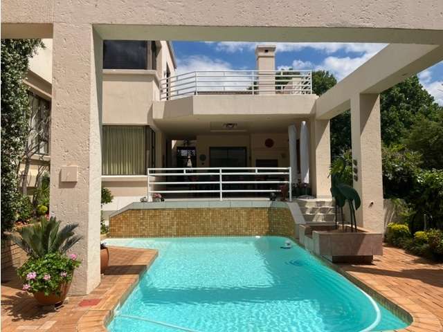 Be dazzled by this impeccable family home in prime position, refined in appearance and generous in accommodation. A welcoming entrance with it's tranquil ambience which flows throughout this home. Formal lounge and family room open onto the covered patio. The dining room is adjacent to a open plan well equipped kitchen with large pantry, separate laundry /scullery. Private fitted study. 4 sunny bedrooms, 3 bathrooms, 2 en-suite. The home boasts a lift which gives access to the upstairs private entertainment games room with bathroom or guest suite, private patio with skyline views. Basement temperature controlled wine cellar, with wine tasting area. Dedicated garden tool room, plus hobby room. Outdoor entertainment patio overlooks the sparkling pool set in an exotic tranquil featured garden. Staff accommodation,4 garages, 2 carports. This exceptional home also offers a borehole, generator, inverter, solar panels. Situated in secure 24/7 access controlled road.