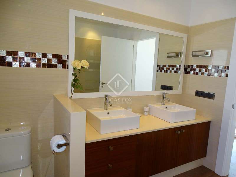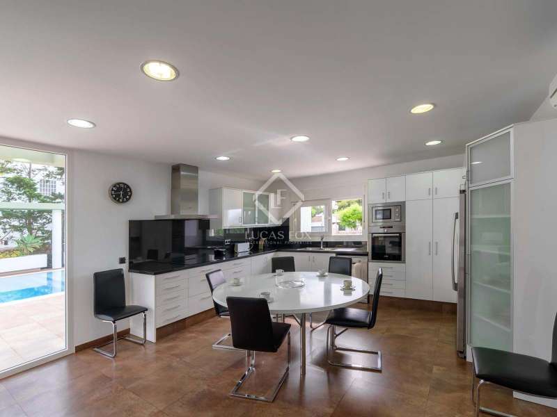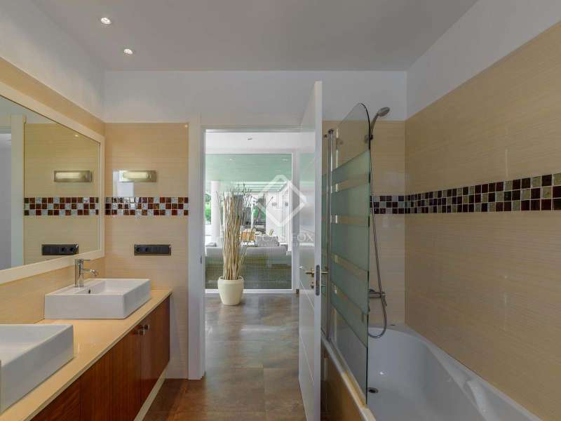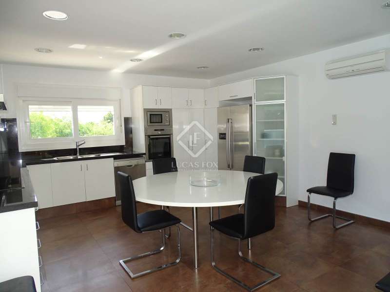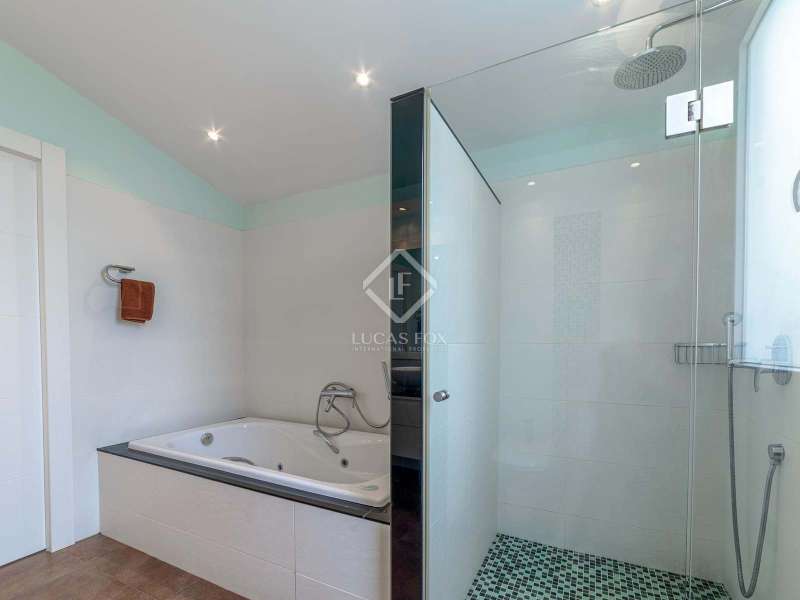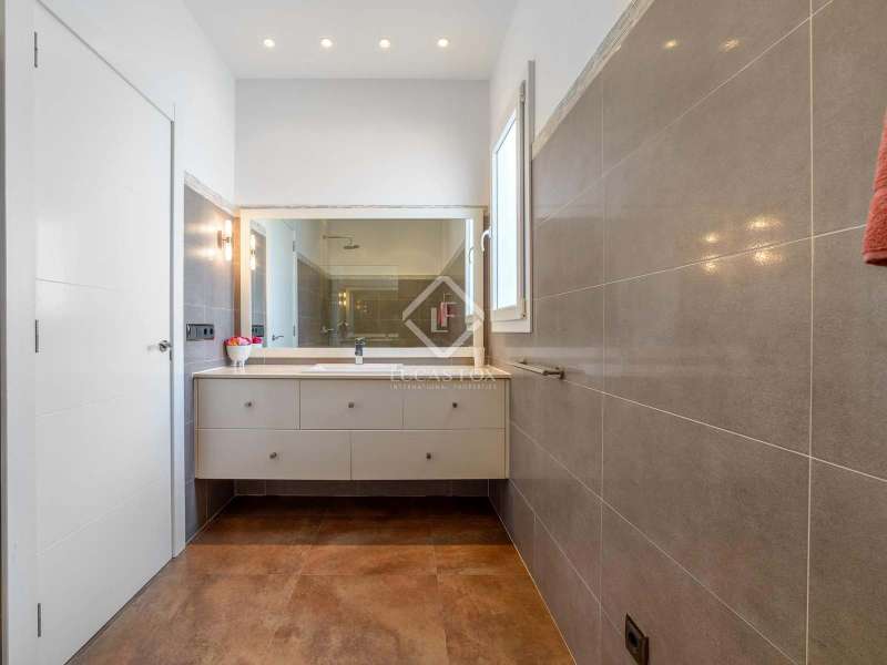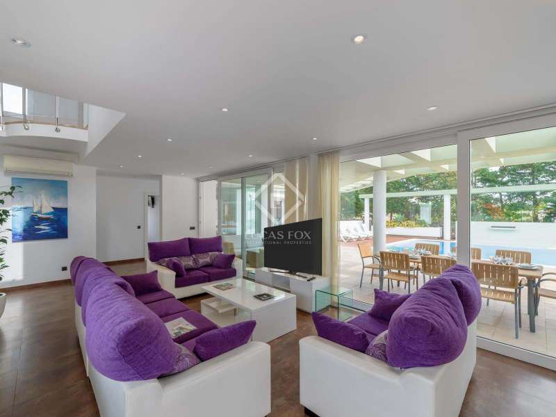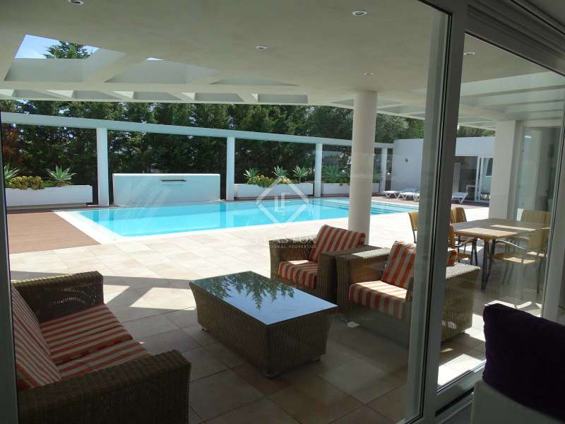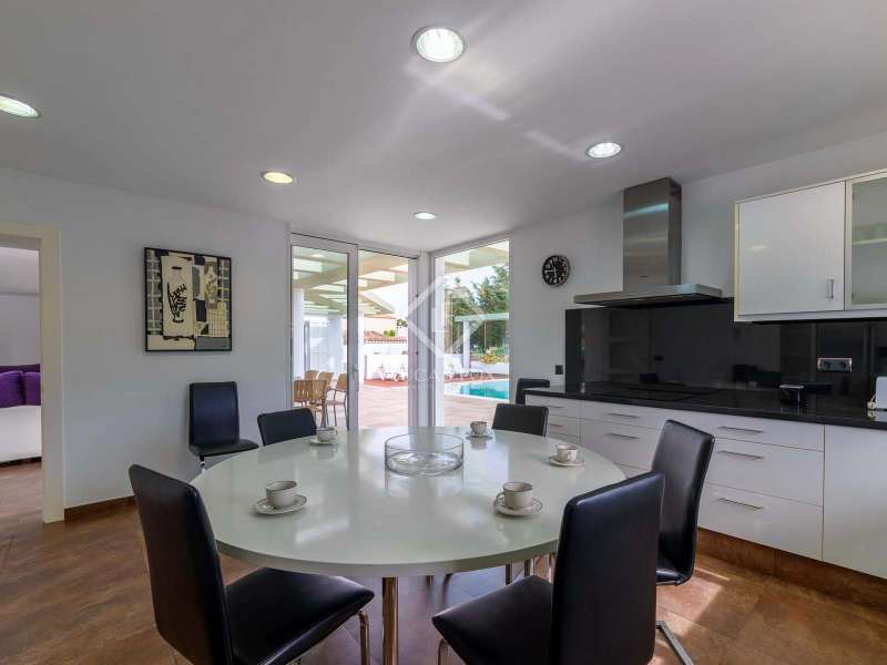 Contemporary style villa of 408 m² built located on a 1,095 m² plot located between the Sa Caleta and Santandria urbanizations, just a few minutes from Ciutadella, Menorca. The 253 m² house offers spacious and very bright spaces. It welcomes us with a hall that leads to a living room with large windows that open onto a fantastic terrace with a porch with white columns and dining and chill-out spaces. This is followed by a designer kitchen with a fully equipped dining area. Both from the kitchen and from the living room, there is access to the spectacular swimming pool with ceramic and teak flooring and an area with loungers for sunbathing. On this same floor is the night area that has two bedrooms with private bathrooms, a double bedroom and another bathroom, all with fitted wardrobes. Via a beautiful staircase we access the first floor where the master suite with fitted wardrobes, private bathroom and access to the terrace is located. In addition, the house has a 155 m² garage on the lower ground floor, in front of the 55 m² pool, a closed barbecue area with a 35 m² kitchen and bathroom and a 25 m² shed in the garden. The finishes are of high quality, and it also has air conditioning, heating and a tourist licence. Undoubtedly a unique property to live all year round, or spend time with family and/or friends. Contact us for more information or to arrange a visit.