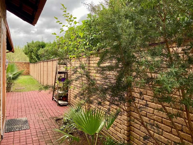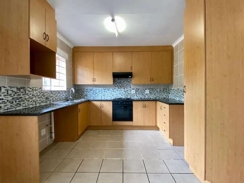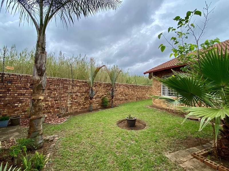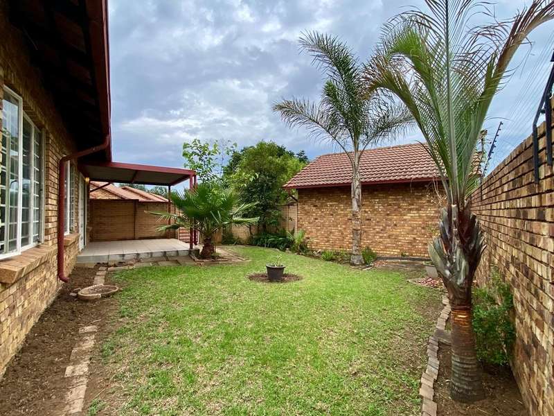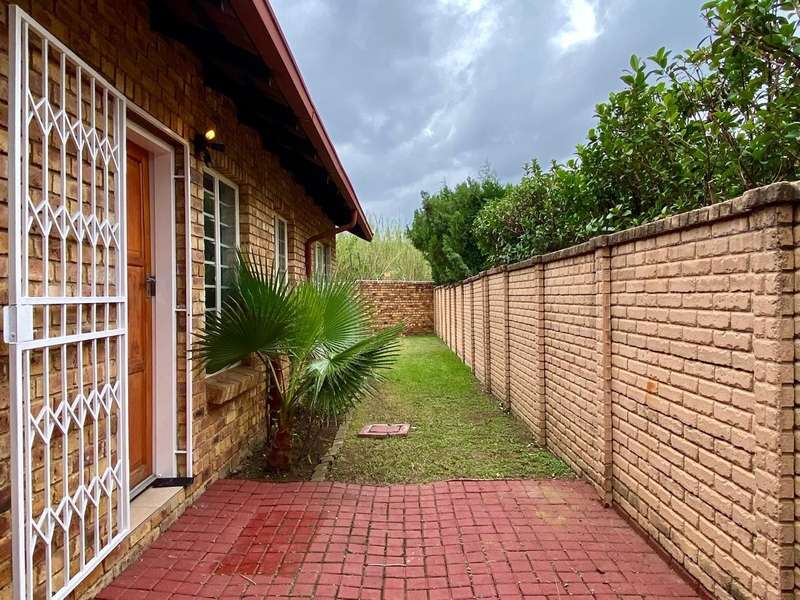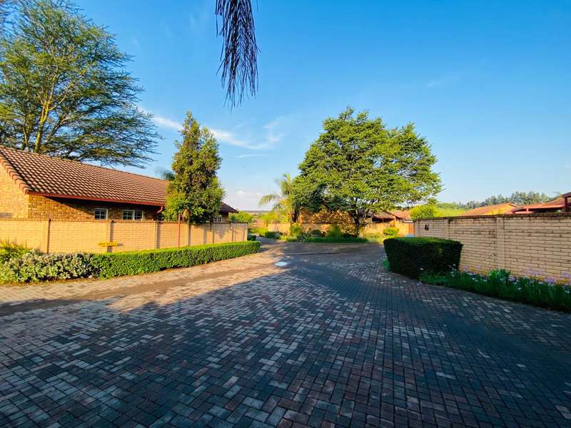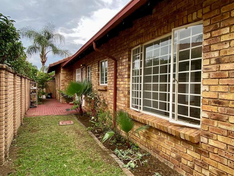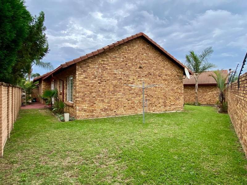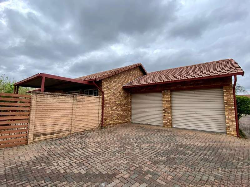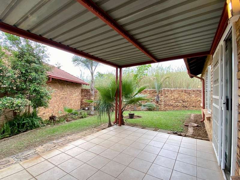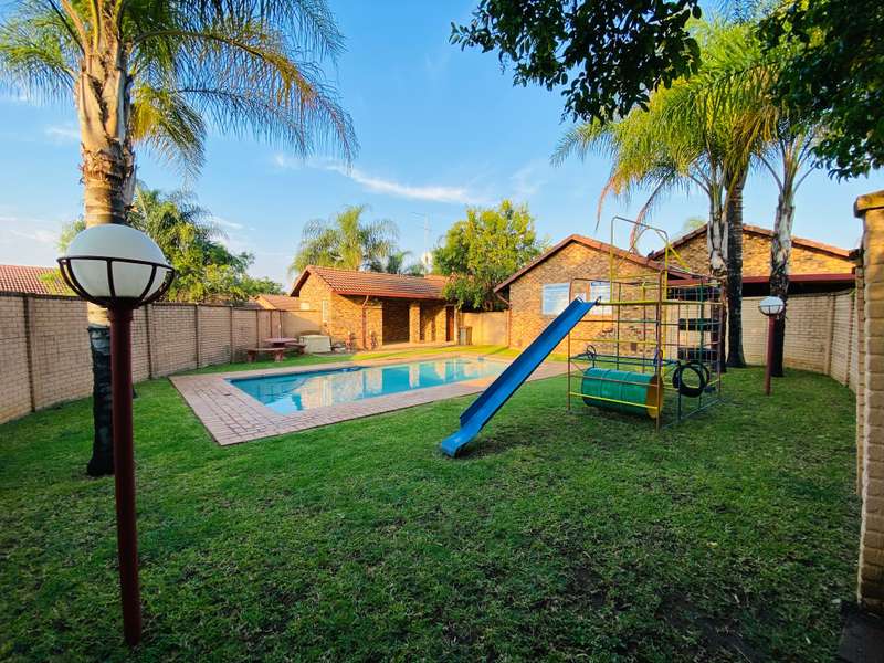- Corner unit provides big, private, wrap-around-style garden. - Unit is in great condition and has recently been painted and deep-cleaned throughout. - 3 Spacious bedrooms with built-in-cupboards. - 1 Full bathroom. - Kitchen with granite countertops, ample cabinetry and offers space for 2 washing appliances and a single-door fridge. - Spacious, separate lounge and dining areas. - Lounge leads to covered patio, overlooking the manicured private garden. - Double garage and 2 open parking spaces adjacent to the unit. - Ample visitors parking. - Located in a quiet, very well-maintained security complex with 24hr access control, communal swimming pool and kids' play area. - Conveniently close to essential amenities with easy access to main roads. Linton's Corner, Makro Silver Lakes, Solomon Mahlangu and the N4, all within a 5 minute drive. - Water and sewer charges are included in the monthly levy.