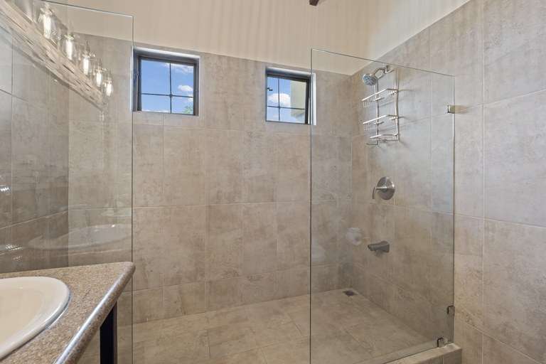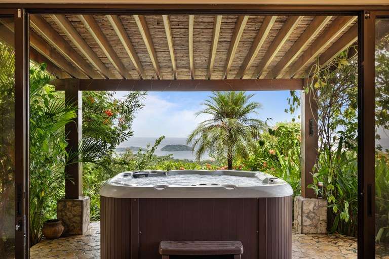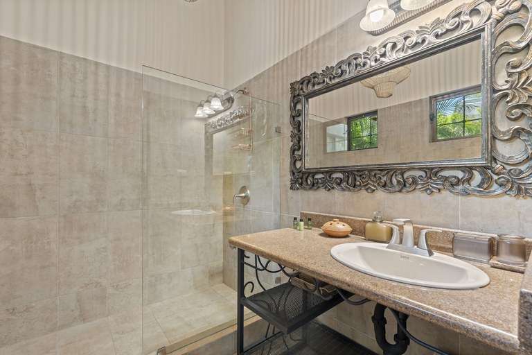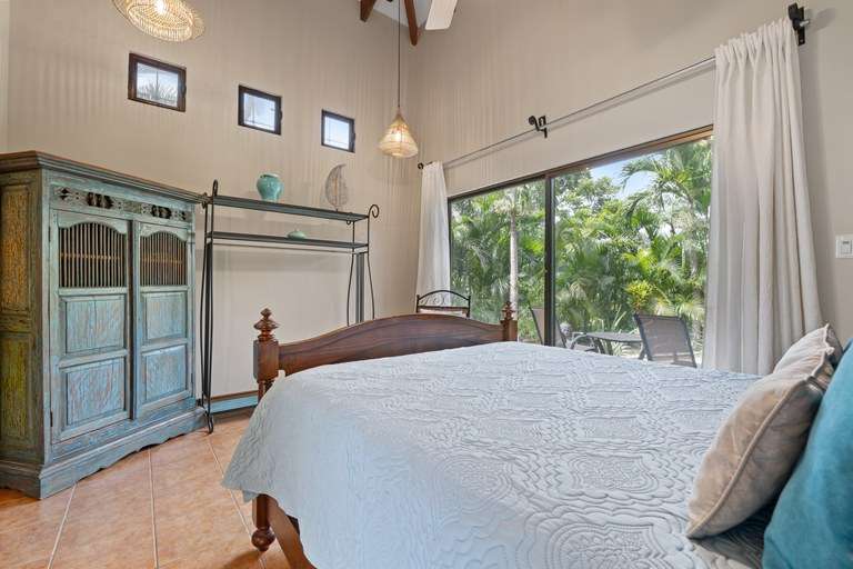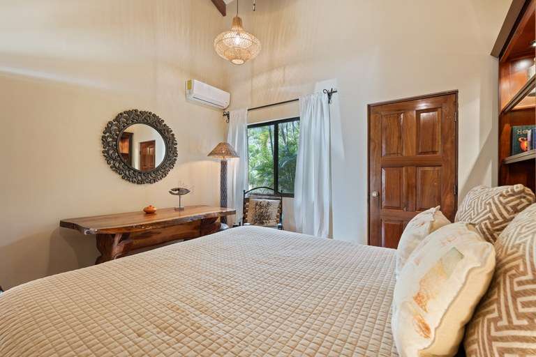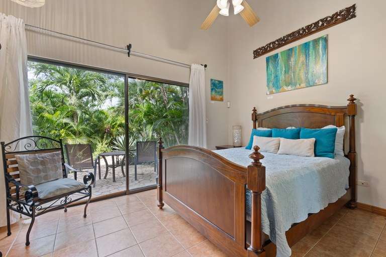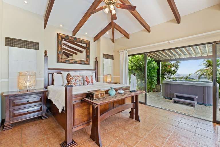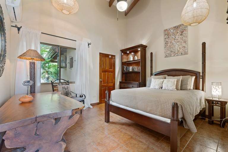 Each of the four bedrooms features a king-size bed, en-suite bathroom, air conditioning, and generous closet space. The primary suite offers direct access to the pool terrace, a cozy seating area, and a private jacuzzi surrounded by lush greenery.