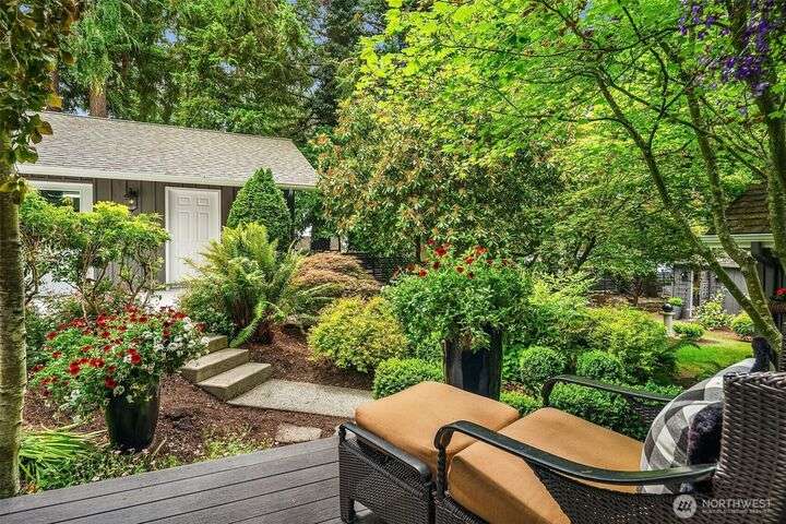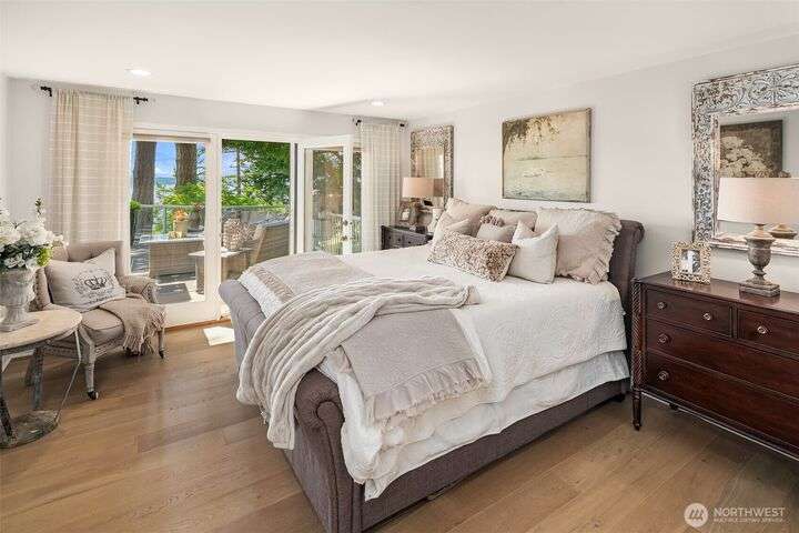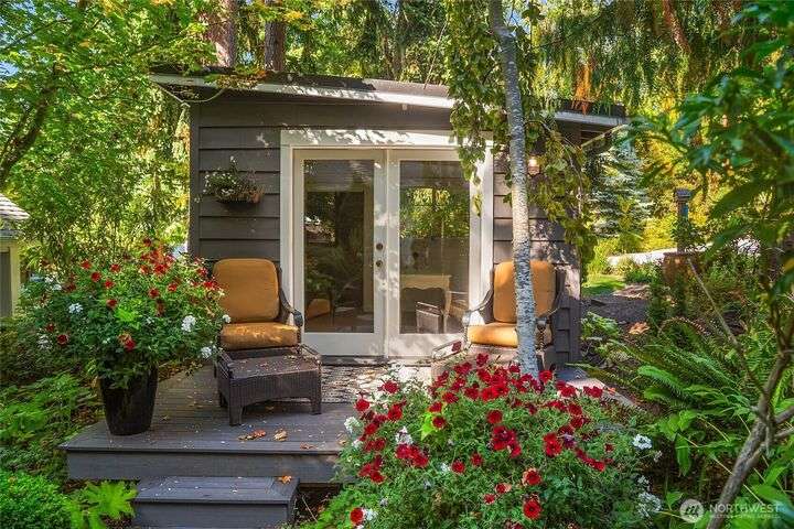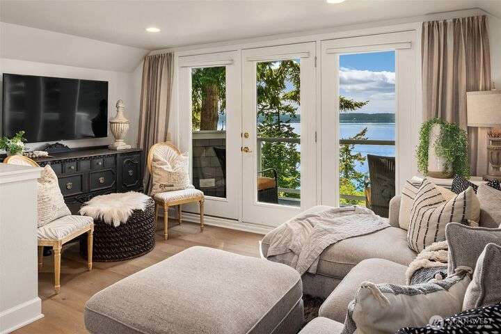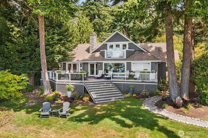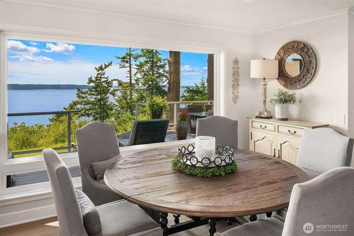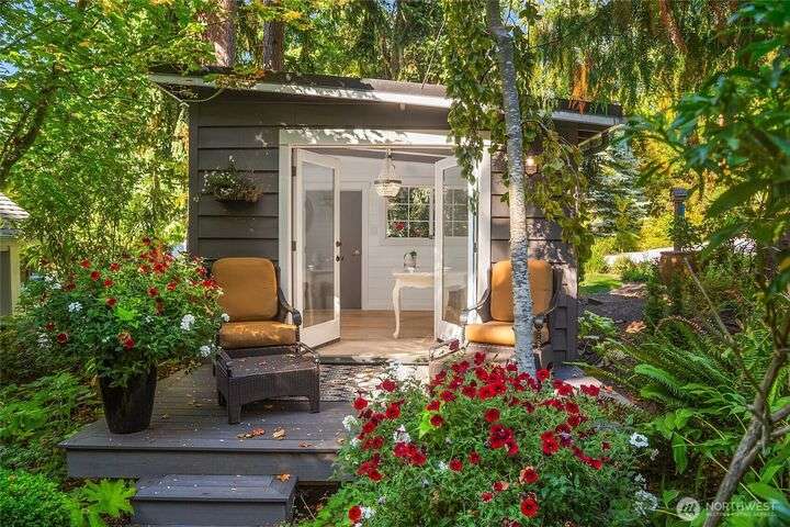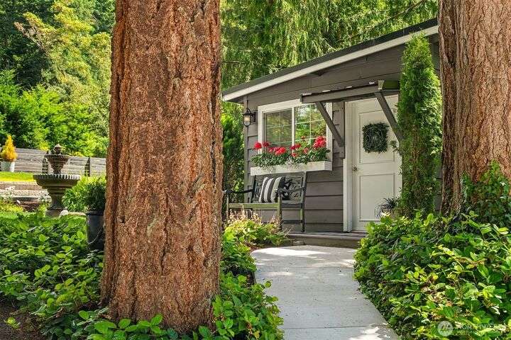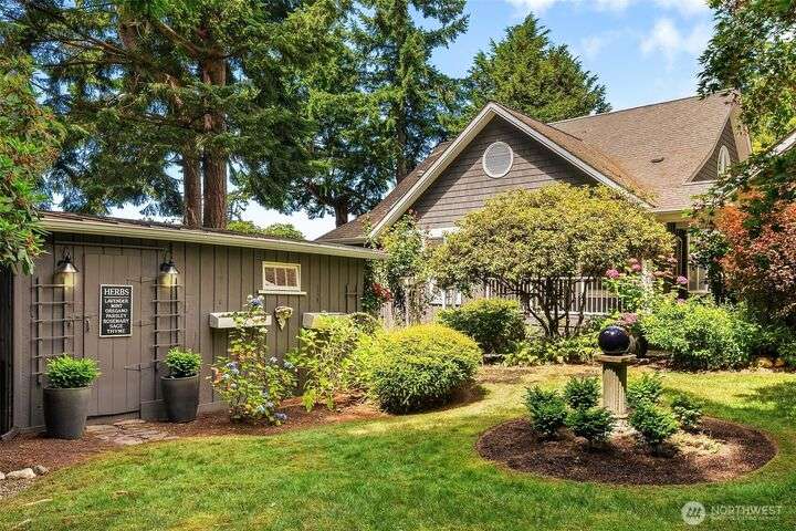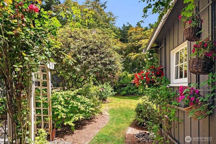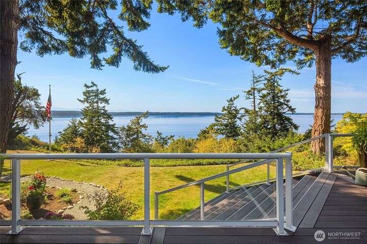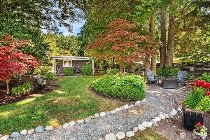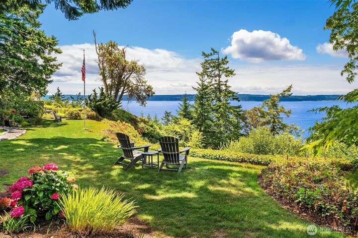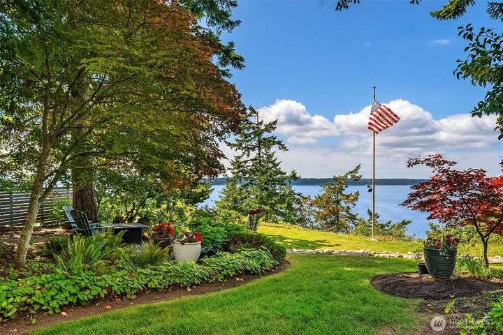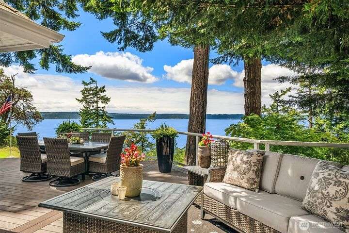 Set among lush gardens and framed by evergreens for privacy, this special home has desirable features around every corner. Understated luxury combined with privacy and unobstructed western views of Saratoga Pass, Olympics, and marine traffic. Designed for single-level living, the interior showcases thoughtfully designed spaces, new Wolf appliances(including micro), panel ready fridge, wine fridge, new roof, detached office, cottage shed, and huge deck together with multiple areas to relax and enjoy the yard. Enjoy the beach access footsteps away. 2 bedrooms + additional guest room. Carport and detached shop complete with a media lounge! Cross the bridge to Camano and feel the retreat vibe of the island-full time or part time. .