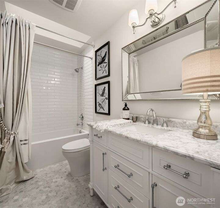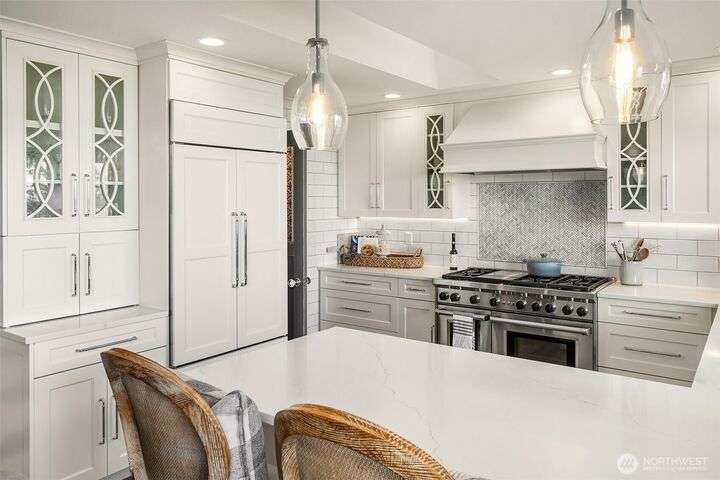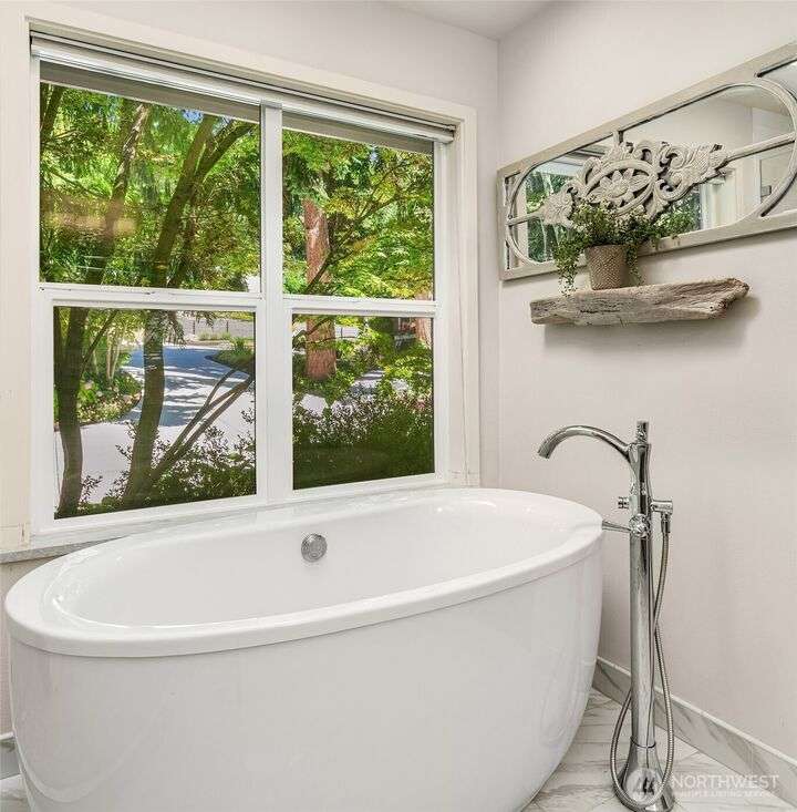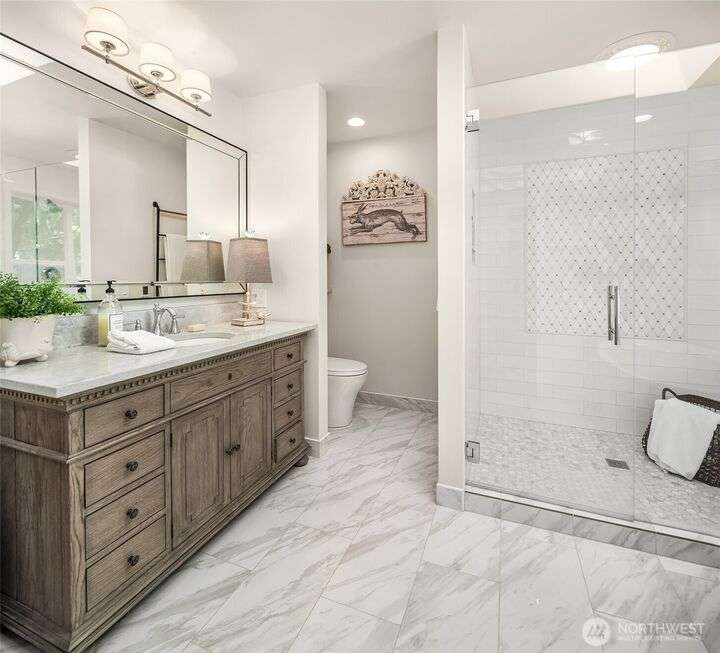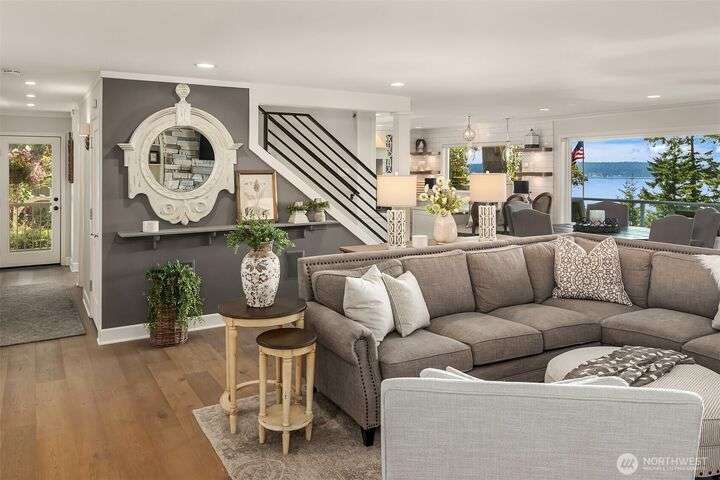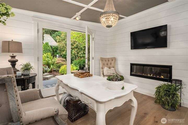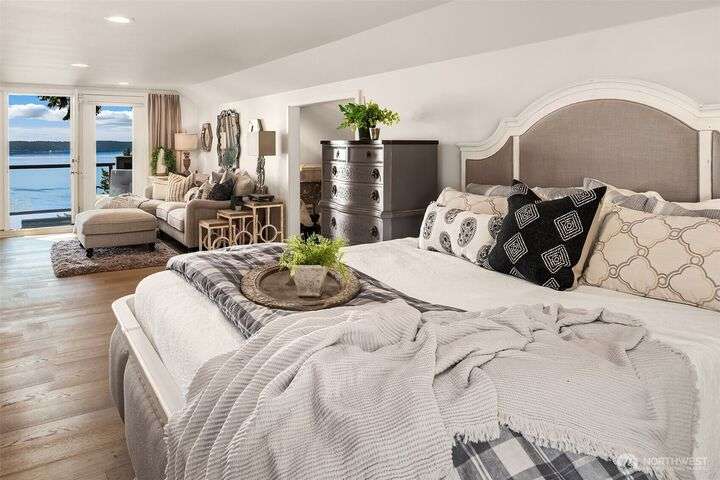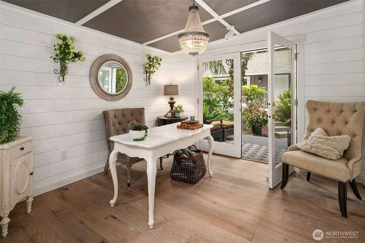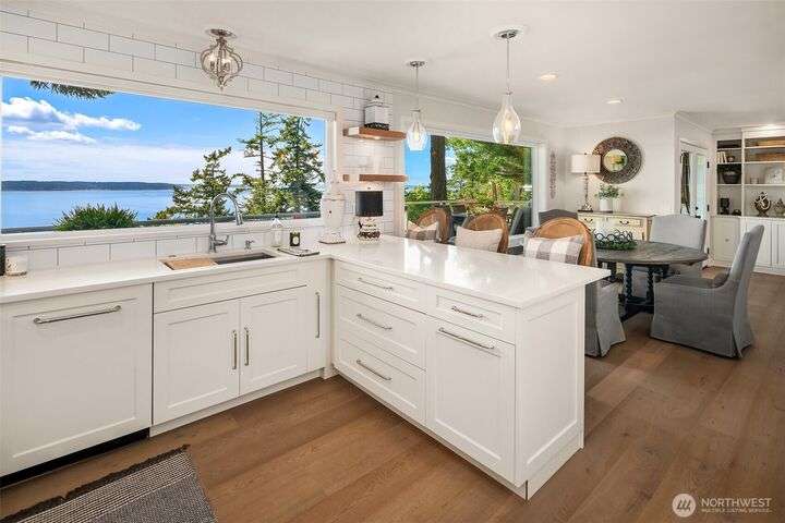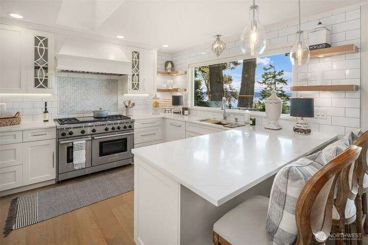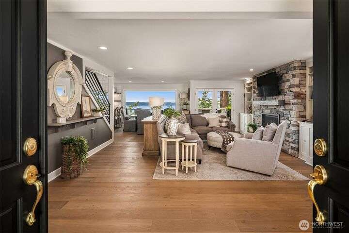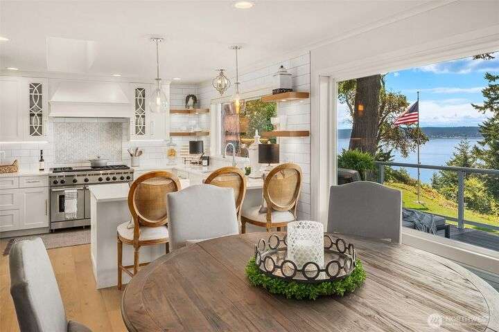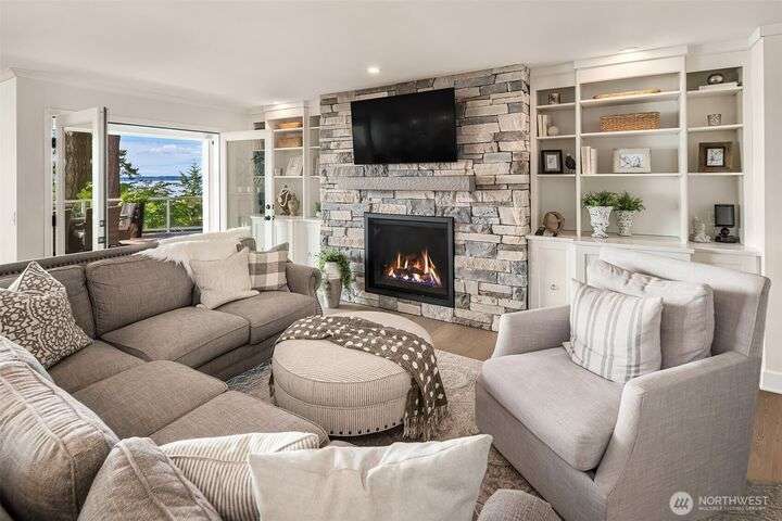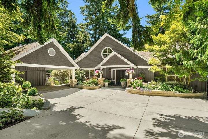 Set among lush gardens and framed by evergreens for privacy, this special home has desirable features around every corner. Understated luxury combined with privacy and unobstructed western views of Saratoga Pass, Olympics, and marine traffic. Designed for single-level living, the interior showcases thoughtfully designed spaces, new Wolf appliances(including micro), panel ready fridge, wine fridge, new roof, detached office, cottage shed, and huge deck together with multiple areas to relax and enjoy the yard. Enjoy the beach access footsteps away. 2 bedrooms + additional guest room. Carport and detached shop complete with a media lounge! Cross the bridge to Camano and feel the retreat vibe of the island-full time or part time. .
