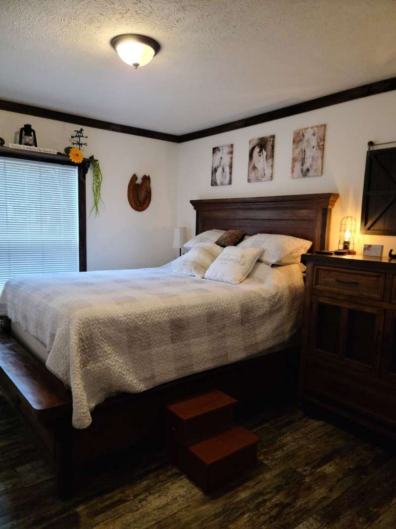 This farmhouse is designed to offer both comfort and style with its modern amenities while preserving the rustic charm that makes it unique. Imagine waking up every morning to the sound of birds chirping and the sight of rolling pastures right outside your window. This is not just a home; it's a lifestyle that brings you closer to nature and provides a peaceful retreat from the hustle and bustle of city life. The 2021 Lulabelle is a luxury model, it is complete with 9ft ceilings, 1/2 inch dry wall, 2x6 framed walls with top-grade insulation, vinyl energy-efficient double-hung windows, lifetime galvalume metal roof, porcelain sinks, and stainless-steel appliances, just to name a few of the nicer finishes. Set on a permanent foundation, and de-title ready, sitting on approximately 1.5 acres, this paradise could belong to you. There is so much more to this property that we could mention, but you really need to some see this charming mini farm to believe it. Does your dream house include a small farm with ample space for a couple of horses and storage space for all your equipment? The fertile land offers numerous opportunities for gardening and growing your own produce. Additionally, a serene pond on the property adds to the picturesque landscape, creating a perfect spot for relaxation or even a little fishing.