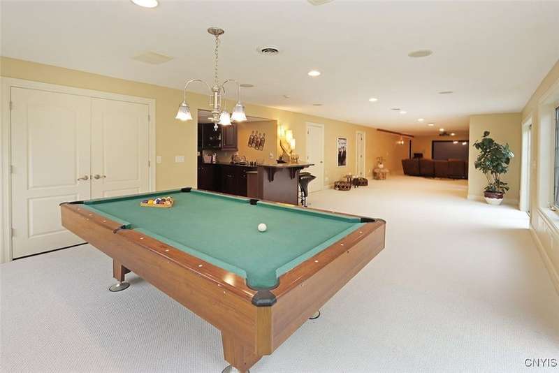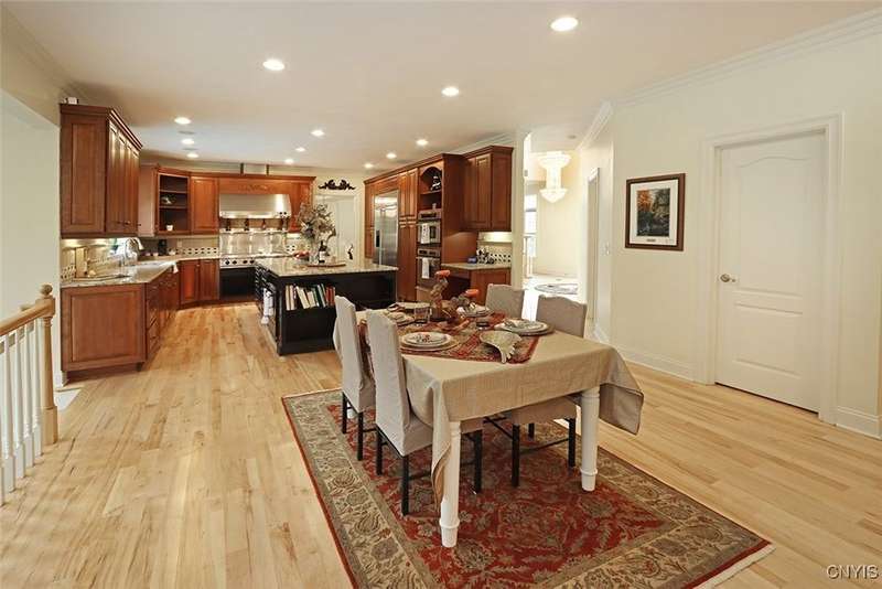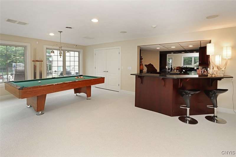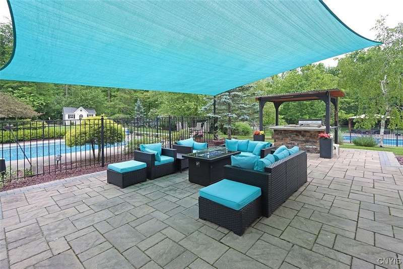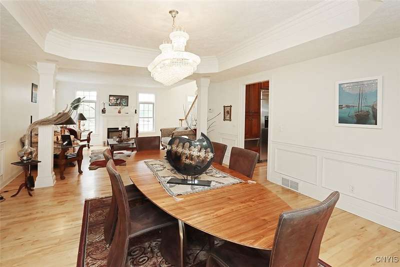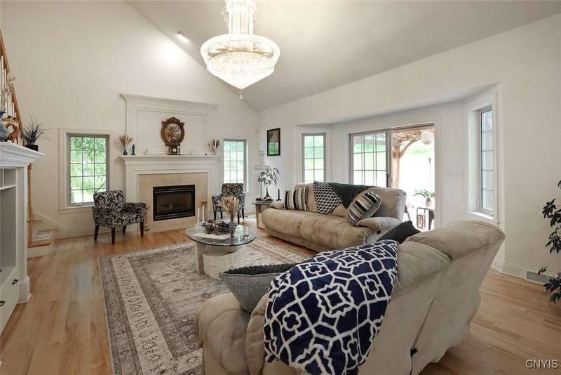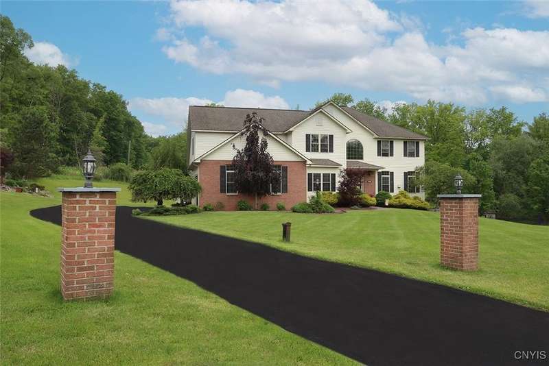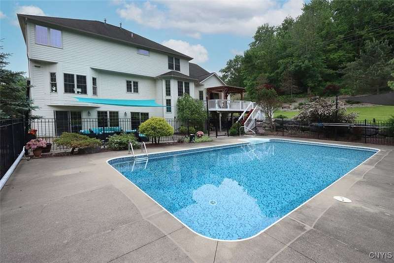 Expect to be impressed with this custom Colonial tucked at the end of a quiet cul-de-sac on 1.8 acres of beautifully landscaped grounds. The striking two-story foyer welcomes you with marble floors, a sweeping staircase and a stunning imported Asfour crystal chandelier. Gleaming hardwood floors, crown molding and bespoke millwork throughout create an atmosphere of refined elegance. A spacious home office with custom built-ins offers the optimal remote work setting. The open living and dining areas are divided by elegant columns, creating an ideal space for hosting. The living room features one of two gas fireplaces with a custom marble mantle, while the formal dining room is enhanced by wainscoting and a tray ceiling. The gourmet kitchen boasts a 10x5 granite island with breakfast bar, solid cherry cabinetry, GE Monogram stainless appliances, double ovens, dual dishwashers, walk-in pantry and casual dining area. The adjacent family room features a second fireplace, built-in media center, vaulted ceiling, slider to the back deck and a secondary staircase. Two powder rooms and a mudroom complete this level. Upstairs are four bedrooms, including the expansive primary suite with a generous walk-in closet and spa-like ensuite. Two bedrooms share a Jack-and-Jill bath and the fourth has a private bath. A convenient laundry center rounds out this floor. The finished walkout lower level adds 900 sq ft (included in total) and offers a full wet bar with wine rack, granite counters, fridge, dishwasher and ice maker?perfect for entertaining. A custom home theater with built-ins sets the stage for movie nights and a bonus room plus full bath add even more versatility. Outside, enjoy a backyard oasis with an inground saltwater pool, expansive patio and a stone-faced outdoor kitchen?fitting for summer gatherings. An upper deck overlooks the landscaped, tree-lined yard. Additional features include a whole-house security system, indoor/outdoor surround sound, lighted water feature and a large shed. Just minutes to Manlius Village, schools, shops and highways, this distinctive property showcases a refined blend of luxury, comfort and thoughtful design. Award-winning FM Schools!