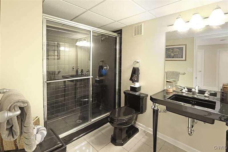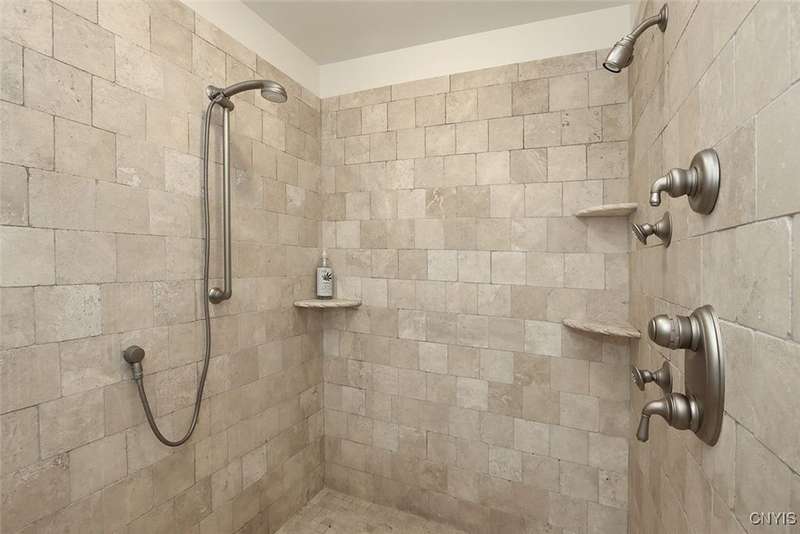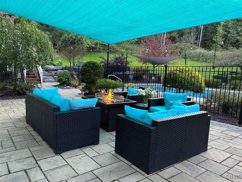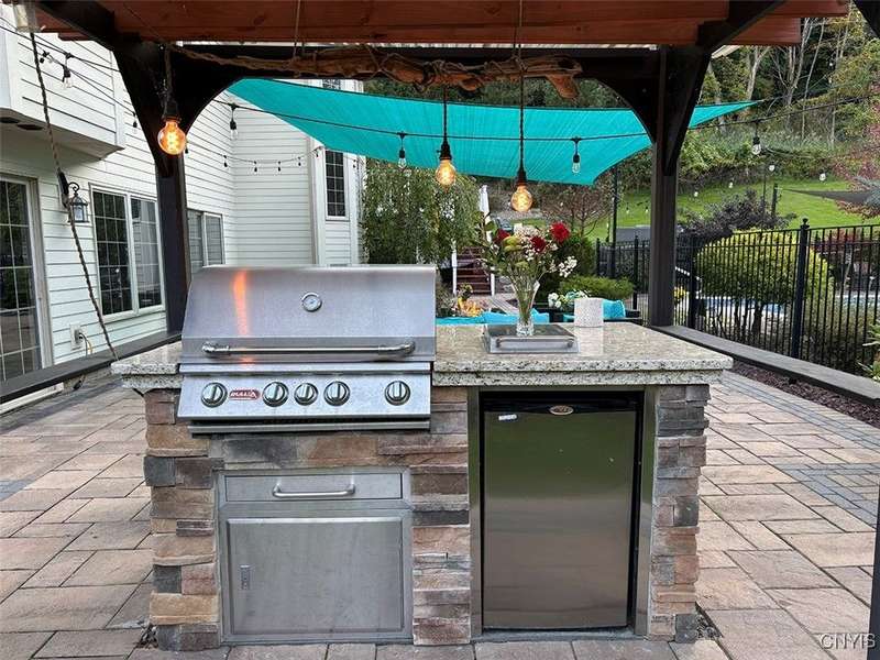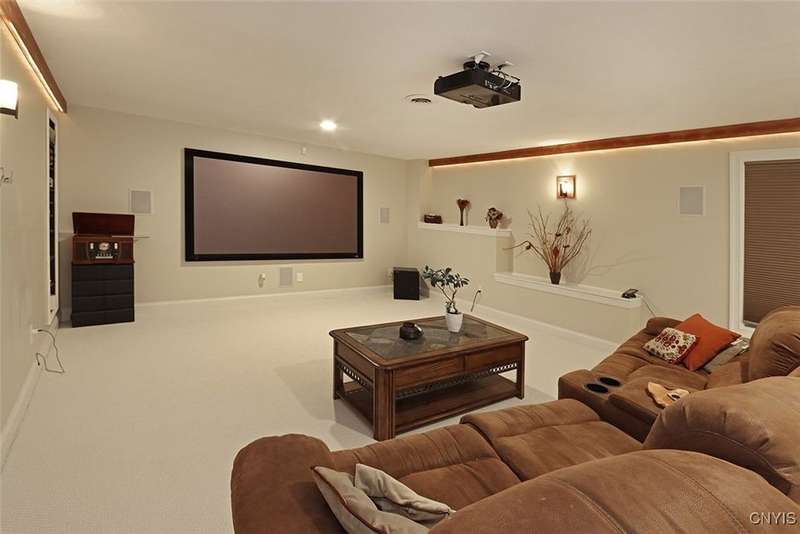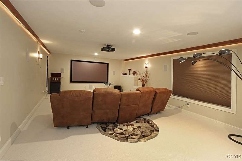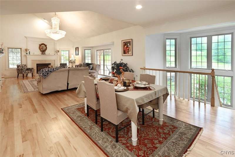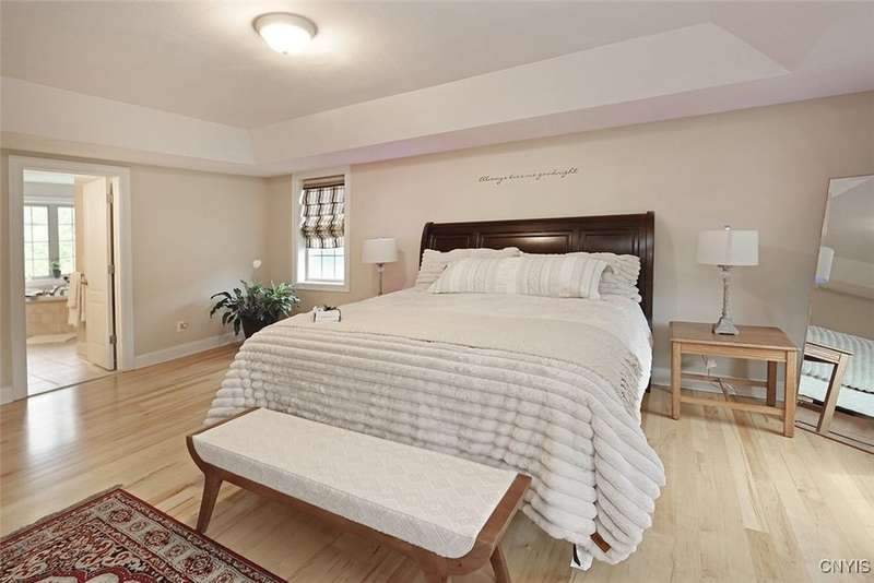 Expect to be impressed with this custom Colonial tucked at the end of a quiet cul-de-sac on 1.8 acres of beautifully landscaped grounds. The striking two-story foyer welcomes you with marble floors, a sweeping staircase and a stunning imported Asfour crystal chandelier. Gleaming hardwood floors, crown molding and bespoke millwork throughout create an atmosphere of refined elegance. A spacious home office with custom built-ins offers the optimal remote work setting. The open living and dining areas are divided by elegant columns, creating an ideal space for hosting. The living room features one of two gas fireplaces with a custom marble mantle, while the formal dining room is enhanced by wainscoting and a tray ceiling. The gourmet kitchen boasts a 10x5 granite island with breakfast bar, solid cherry cabinetry, GE Monogram stainless appliances, double ovens, dual dishwashers, walk-in pantry and casual dining area. The adjacent family room features a second fireplace, built-in media center, vaulted ceiling, slider to the back deck and a secondary staircase. Two powder rooms and a mudroom complete this level. Upstairs are four bedrooms, including the expansive primary suite with a generous walk-in closet and spa-like ensuite. Two bedrooms share a Jack-and-Jill bath and the fourth has a private bath. A convenient laundry center rounds out this floor. The finished walkout lower level adds 900 sq ft (included in total) and offers a full wet bar with wine rack, granite counters, fridge, dishwasher and ice maker?perfect for entertaining. A custom home theater with built-ins sets the stage for movie nights and a bonus room plus full bath add even more versatility. Outside, enjoy a backyard oasis with an inground saltwater pool, expansive patio and a stone-faced outdoor kitchen?fitting for summer gatherings. An upper deck overlooks the landscaped, tree-lined yard. Additional features include a whole-house security system, indoor/outdoor surround sound, lighted water feature and a large shed. Just minutes to Manlius Village, schools, shops and highways, this distinctive property showcases a refined blend of luxury, comfort and thoughtful design. Award-winning FM Schools!