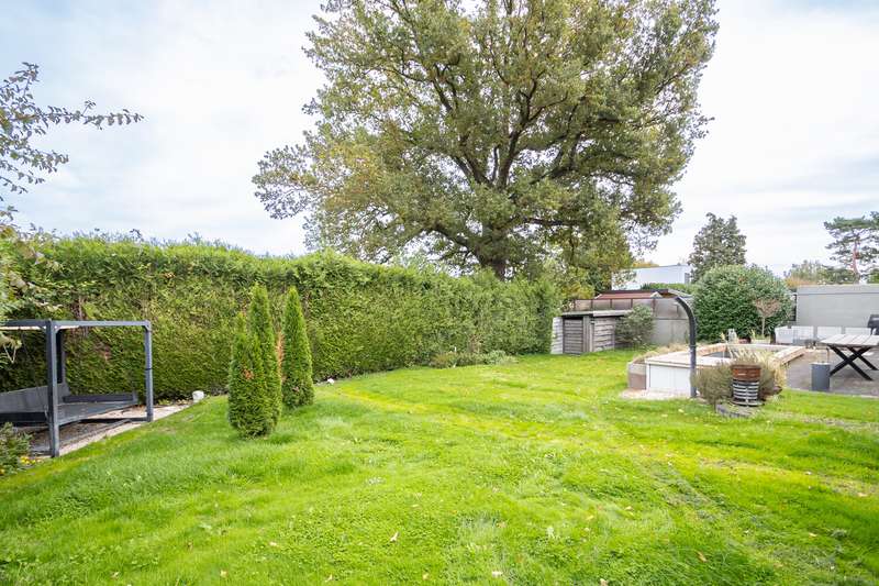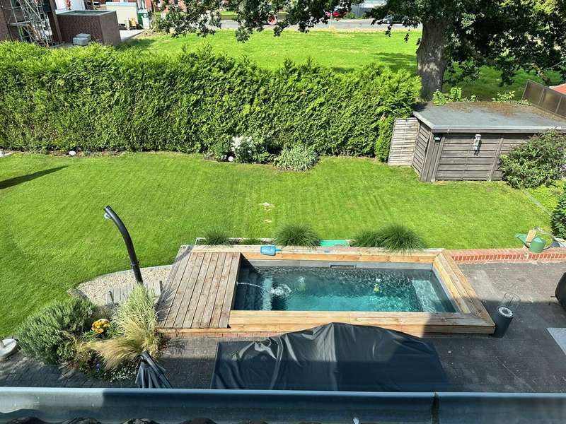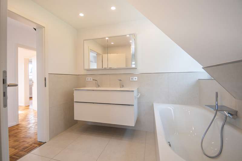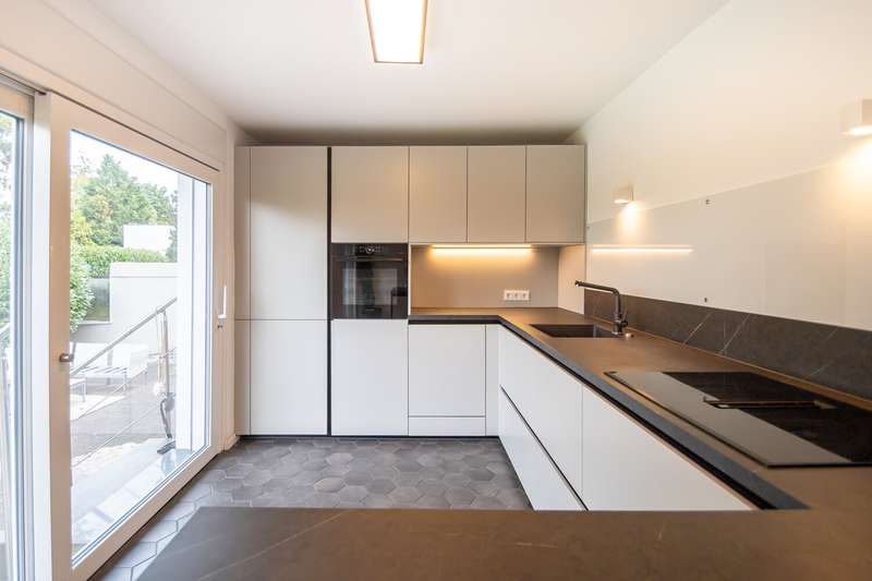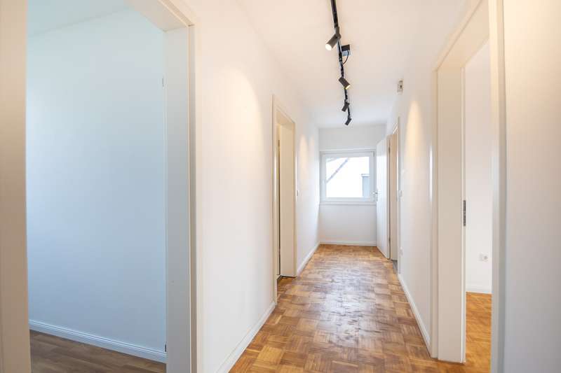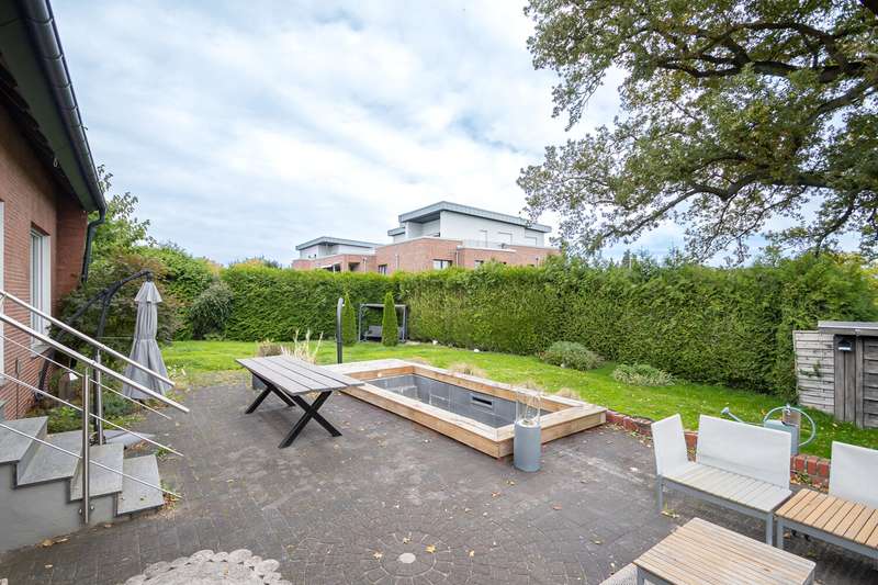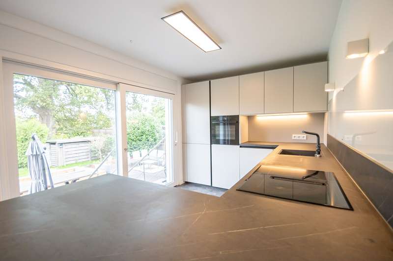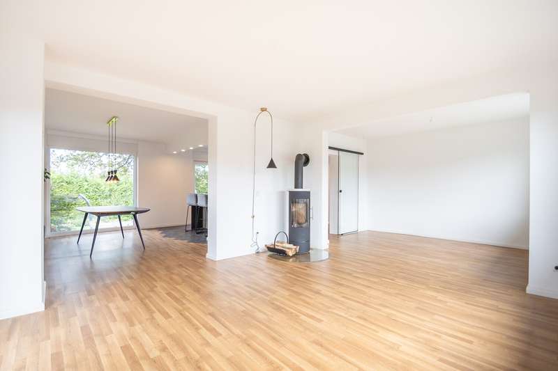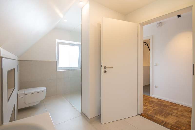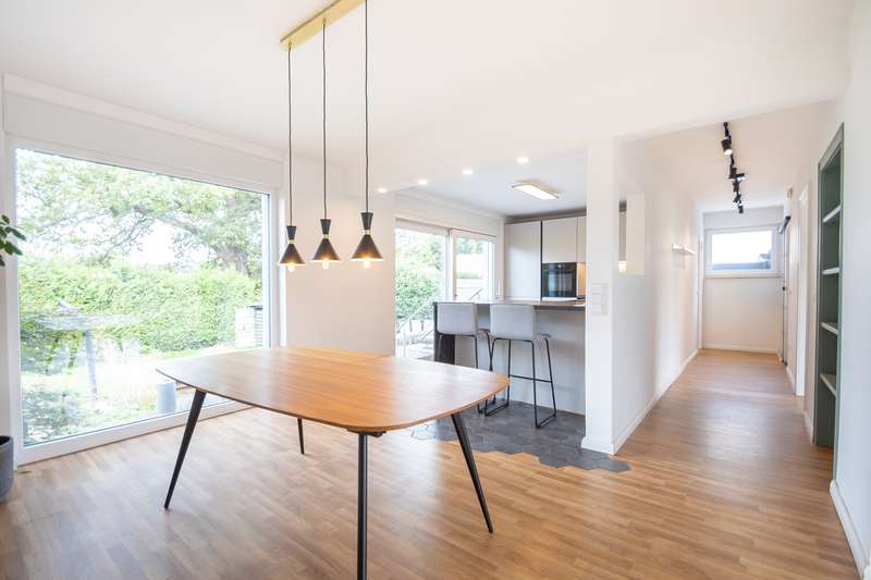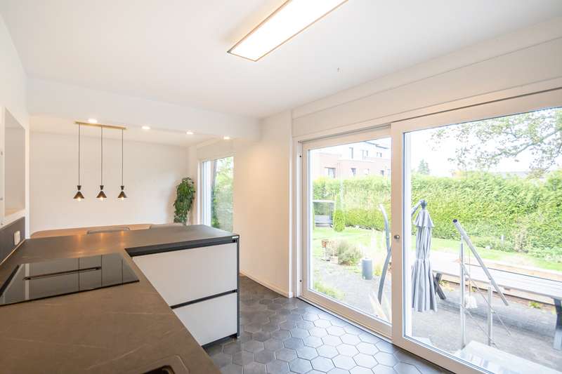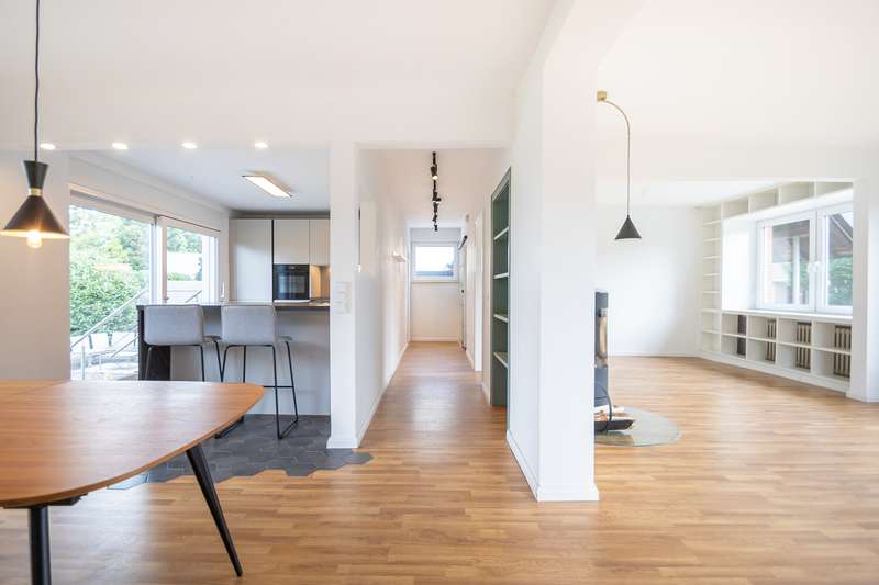 This high-quality modernized detached house built in 1961 is situated on a spacious plot of approx. 783 m² and offers an attractive living space of approx. 129 m². With a total of 5 rooms, including 3 bedrooms, 2 modern bathrooms and a loft that could be converted into a living space, the property is ideal for families who value space, comfort and contemporary furnishings. As soon as you enter the house, the open-plan layout of the first floor conveys an inviting and spacious feeling of living. The focus is on the light-flooded living and dining area, which impresses with a stylish combination of living comfort and modern functionality. The high-quality fitted kitchen with brand-name Bosch appliances and practical counter solution offers an ideal space for cooking together and socializing. The adjoining living room is complemented by a wood-burning stove, which provides cozy warmth on cooler days. Floor-to-ceiling windows provide access to the sunny terrace with a view of the spacious garden. A modern daylight shower room with window is also located on this floor. Three comfortable bedrooms await you on the upper floor, which are ideal for use as a master bedroom, children's room or guest room. The master bedroom has direct access to the balcony, which offers a wonderful view of the greenery, a perfect place for relaxing mornings. Two further bright children's rooms offer plenty of space for playing, studying or dreaming. A further daylight bathroom, modernized in 2024, with shower, double washbasin and high-quality fittings rounds off this floor in a functional and stylish way. The loft was insulated in 2025 and fitted with new skylights. It offers a development reserve and thus enables the creation of additional, usable living space, ideal as a study, hobby room or guest area, for example The house has a full basement and offers a wide range of possible uses. In addition to two spacious basement rooms and a separate utility room, there is also a sauna area in the basement. The laundry room with connections for washing machine and dryer as well as an additional storage room ensure maximum functionality. The furnishings of the house leave nothing to be desired: -Modern, lockable plastic windows with triple glazing (2021) provide excellent sound and heat insulation. -The new roof with photovoltaic system (2025) with approx. 9 kWp output and approx. 10 kWh storage enables a sustainable energy supply - ideal for feeding into the house electricity and for use with the existing wallbox. -A gas condensing boiler heating system (2014) ensures an efficient heat supply. -Three outdoor parking spaces and a garage with an electrically operated door are available for vehicles. The outdoor area is also impressive across the board: the spacious garden offers numerous possibilities for individual design. A private pool invites you to cool off and relax in the summer months - whether with family, friends or in private. Thanks to continuous modernization, the property is in a technically and energetically up-to-date condition. The house is ready to move into and offers ideal conditions for comfortable, sustainable family living. We would be happy to provide further information or arrange a viewing.