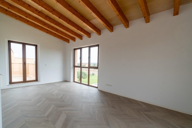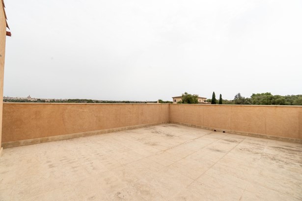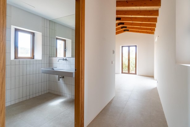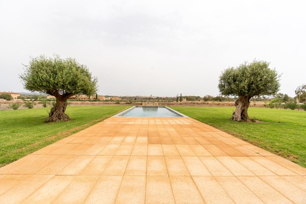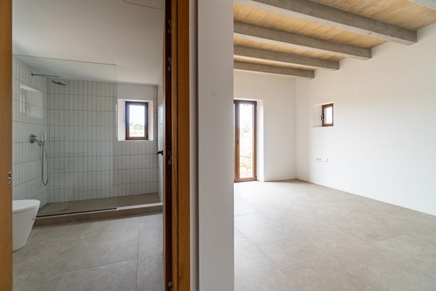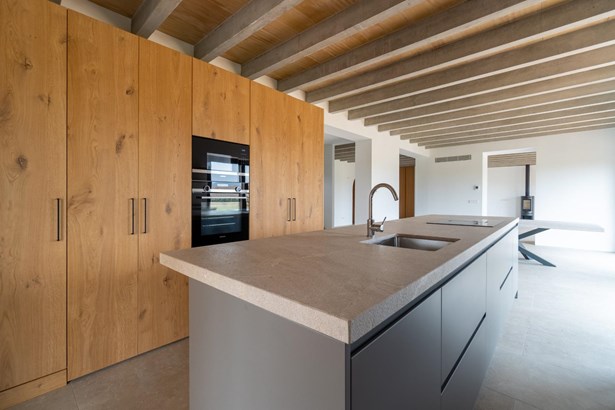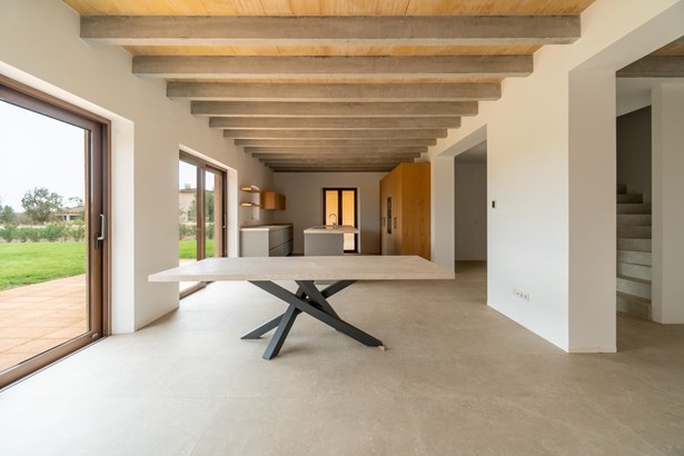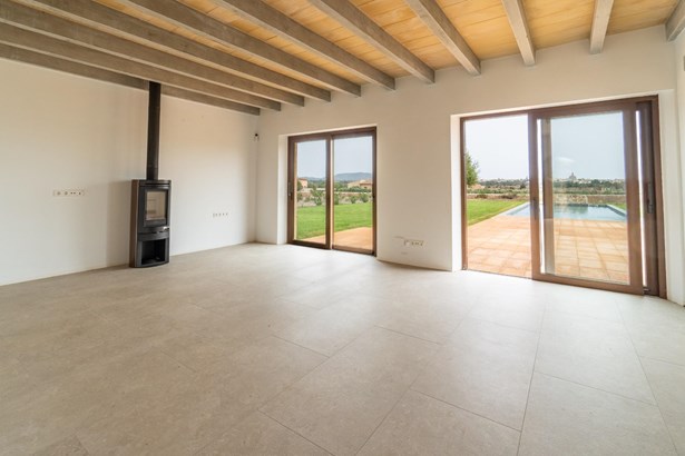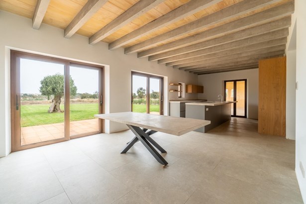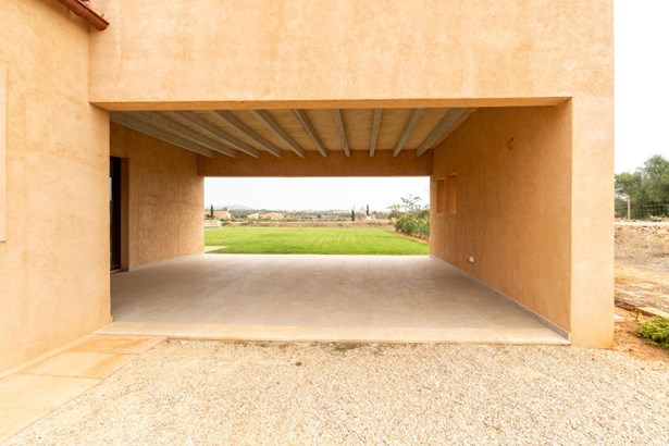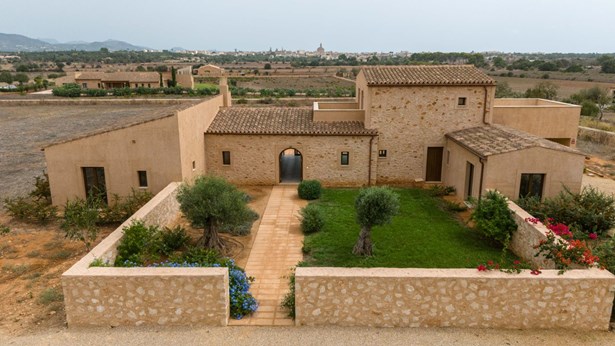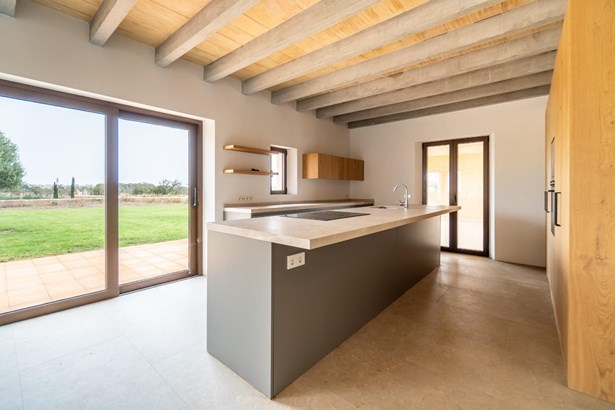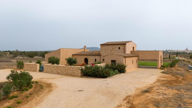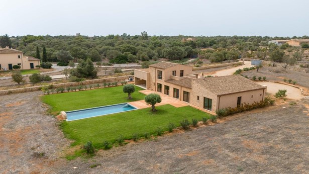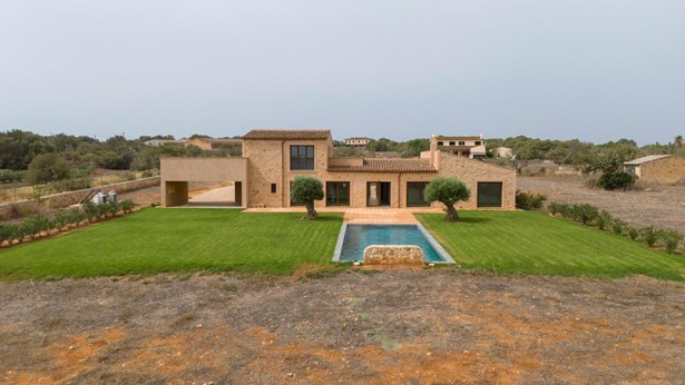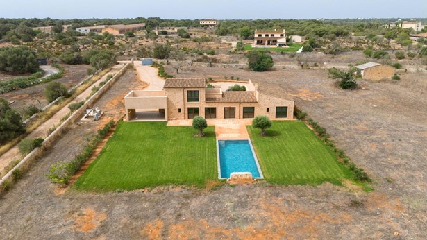 This newly built finca, completed in 2022, is set on a 17,479 m² plot in a quiet area of the municipality of Santanyí. The property offers 490.56 m² of built space and 460 m² of usable area, distributed in a functional way with modern finishes.~~The main house combines a natural stone façade with clean lines and large windows that flood the interior with natural light. Inside, there is an open-plan kitchen with an island, fully equipped and finished with natural stone countertops, connected to the dining and living areas with direct access to the outdoors.~~The house features four bedrooms: three on the ground floor, two of them with en-suite bathrooms, and a fourth upstairs, also with an en-suite bathroom and direct access to a private terrace.~~Additional functional spaces include a laundry room, pantry, storage room, and basement. There is also an independent bathroom with both shower and bathtub to serve the rest of the property.~~The flat, fully fenced plot allows for various agricultural uses and offers plenty of space for different crops. It also features a landscaped garden with an automatic irrigation system, a swimming pool with terrace, a covered porch, and a garage for two vehicles.~~Modern installations include: Foundations with Caviti formwork, central air conditioning and heat pump, heating powered by solar panels with 220 V electrical system, fireplace, water softener, water tank, security systems with perimeter and interior alarms, video intercom, and reinforced entrance door.~~Just a few minutes from the centre of Santanyí, this finca is an excellent choice both as a residence and for those wishing to develop a productive activity in a rural environment.