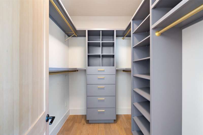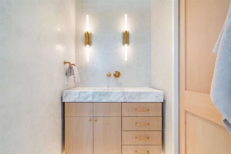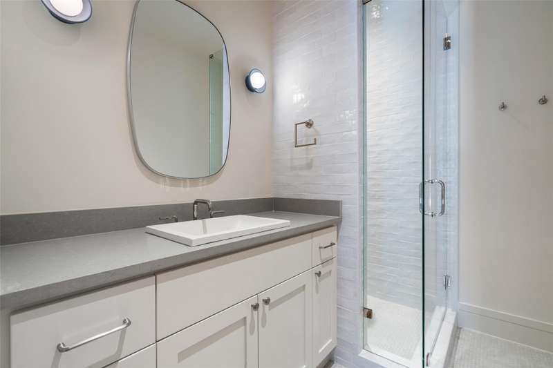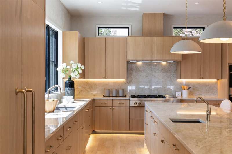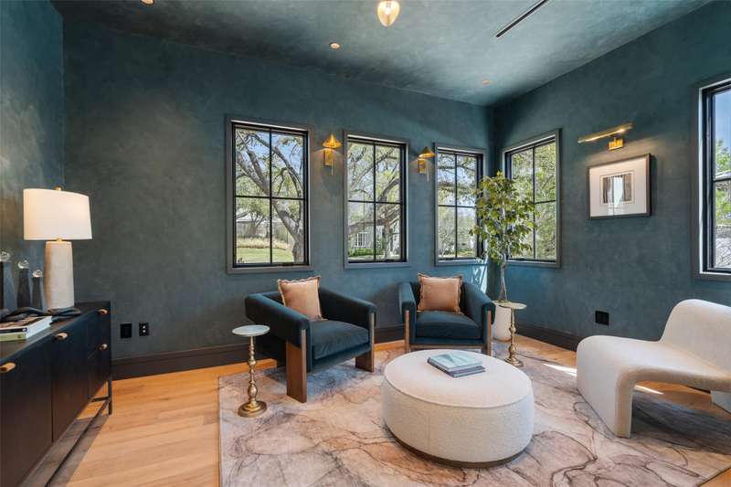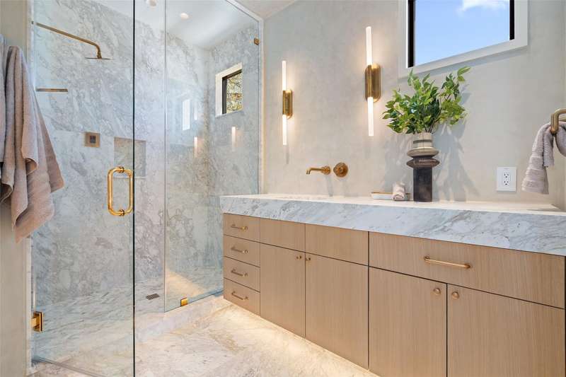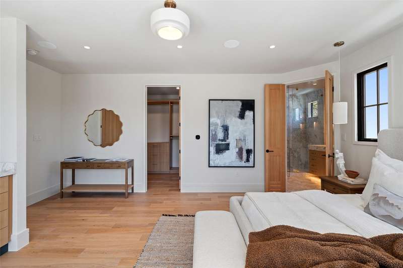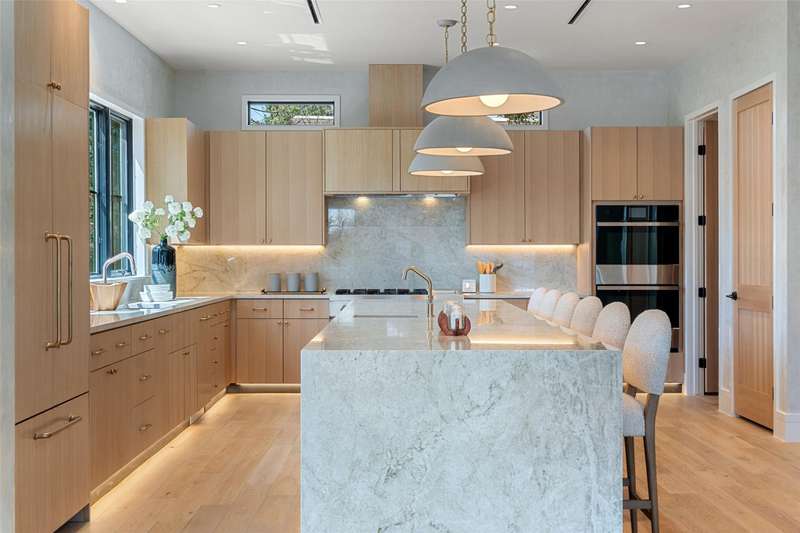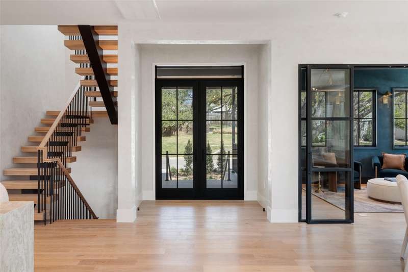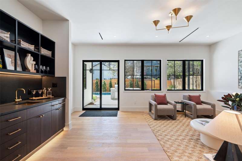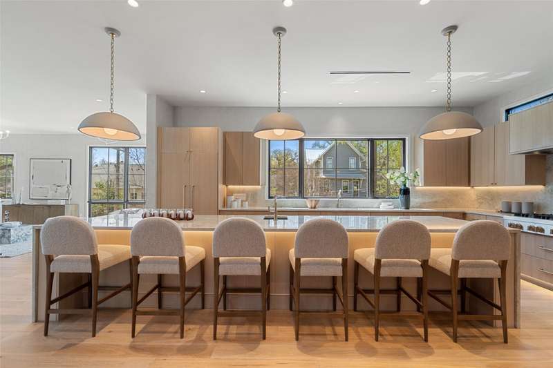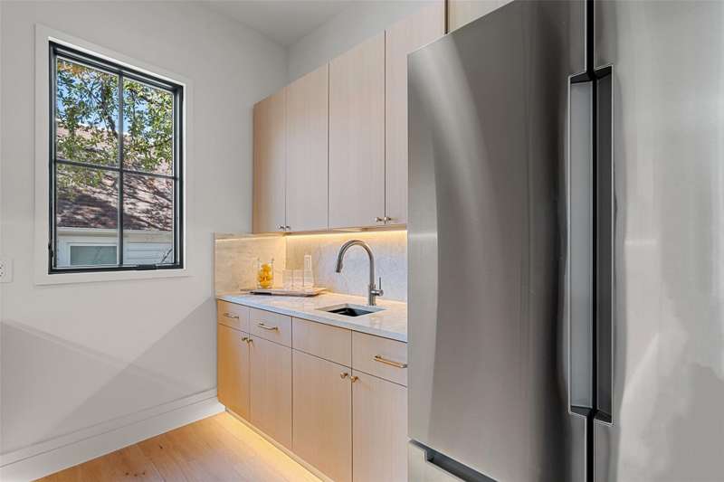 Elegance radiates throughout the home, from the European white oak hardwood floors to the custom rift-cut white oak cabinetry. The chef's kitchen is a work of art, featuring Taj Mahal quartzite countertops, a fully paneled JennAir Signature appliance package, and a butler's pantry with an additional Bosch refrigerator. The bar area offers another built-in Bosch fridge & seamless access to the outdoor living area, perfect for entertaining. A stunning floating staircase with European oak risers adds to the home's modern aesthetic, while hand-plastered walls provide an artisan touch.
