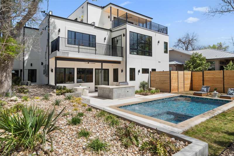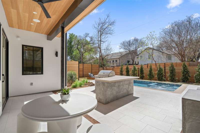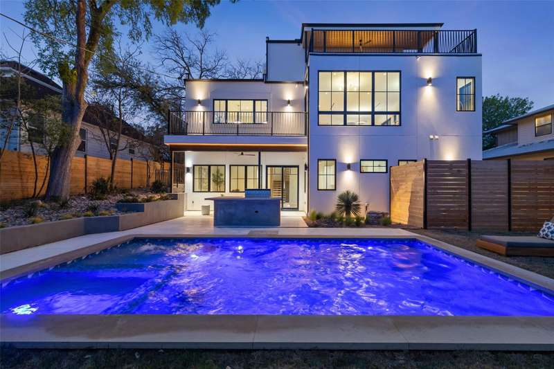 The primary suite is a private retreat, boasting a spa-inspired bath adorned with Miraval full granite, a Mr. Steam iTempo unit, and a custom-built walk-in closet. Two laundry areas, including one conveniently located in the primary suite, offer effortless functionality. Outdoors, a shell beige limestone patio extends to the rear pool deck, where a Cascade custom pool and heated spa create a resort-like atmosphere. Two expansive balconies, along with a 500-square-foot usable flat roof, provide additional space to relax and take in the surroundings. An outdoor kitchen, complete with a built-in Coyote high-performance grill, makes alfresco dining a breeze.