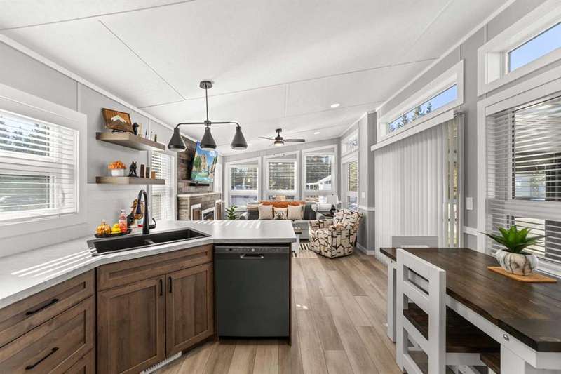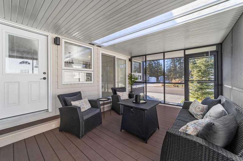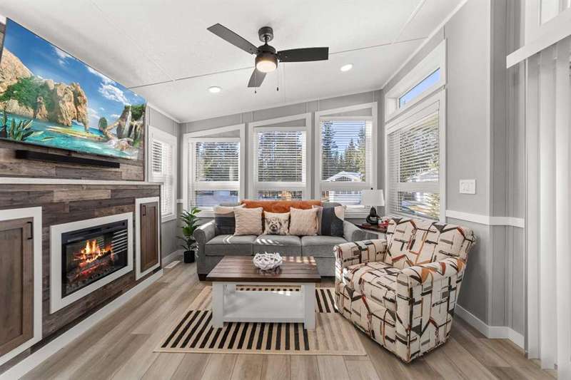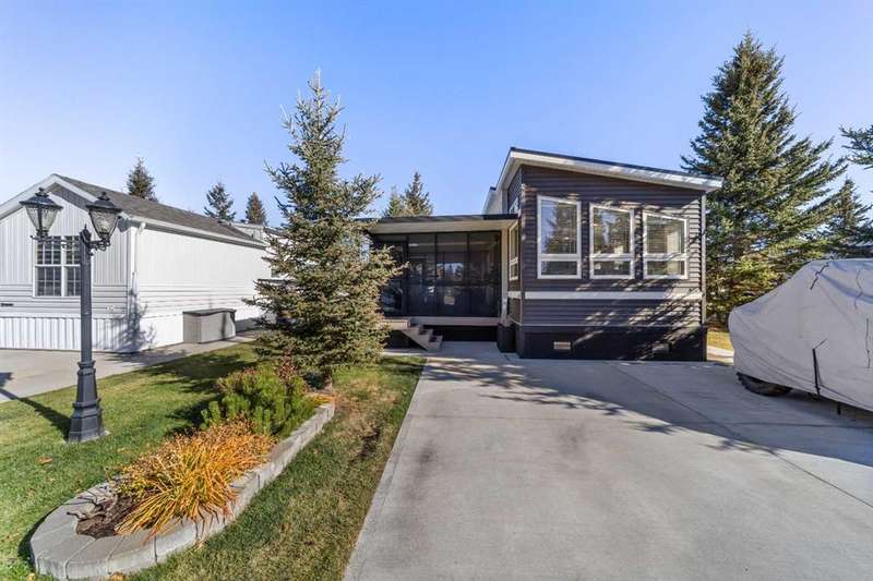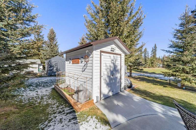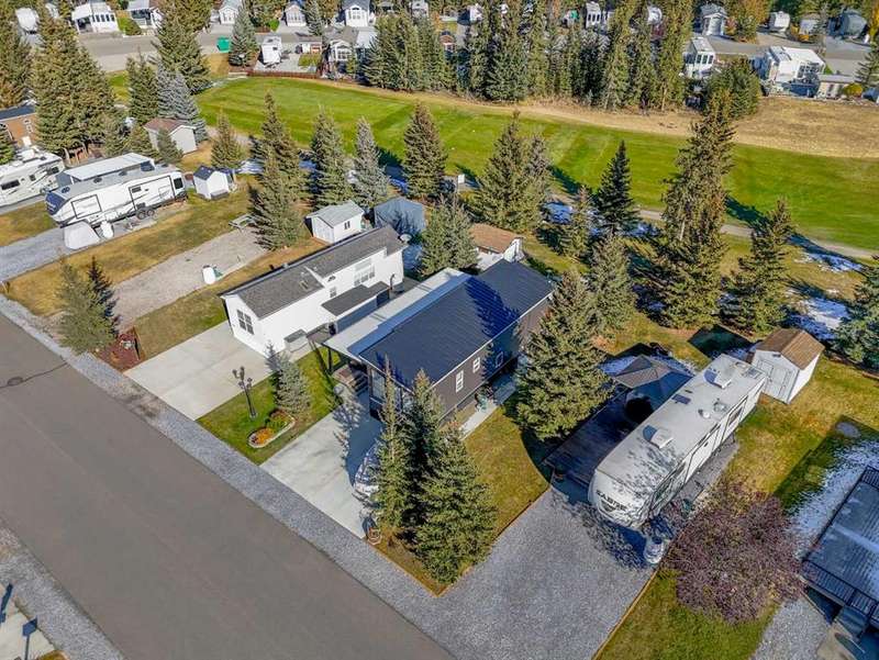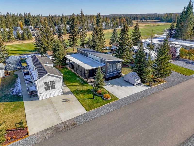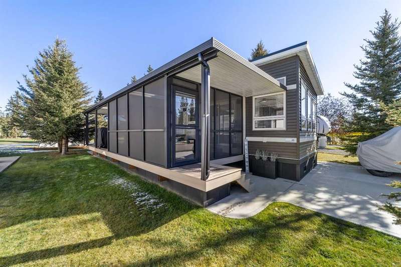 Welcome to 21 Coyote Creek – a rare opportunity to own a 2024 luxury Park Model backing directly onto the 9th tee box in a four-season golf resort community. This fully furnished, turnkey 544 sq ft retreat sits on a private 0.08-acre lot & offers thoughtfully designed indoor-outdoor living with unmatched quality & efficiency. Step inside to discover soaring high ceilings, durable vinyl plank flooring, & an expansive open-concept living space flooded with natural light. The chef-inspired kitchen features black stainless steel appliances, ample cabinetry, a modern sink with black fixtures, & spacious dining options. Relax in the cozy living room by the gas fireplace with built-in TV & surround sound above, framed by rich wood tones & custom millwork. The spacious bedroom is a restful retreat with built-in cabinetry & warm accents. The spa-inspired bath includes a full-size shower, upgraded vanity, backlit mirror, & linen storage. Enjoy the seasons from your massive 11x15 enclosed composite deck or your 11x12 covered composite deck, ideal for entertaining or peaceful morning coffee. A concrete patio with wood-burning outdoor fireplace extends the living space with serene golf course views & towering evergreens. Built for year-round comfort & energy efficiency, this home boasts 2x6 construction, R30 heated floors, R40 insulated metal roof, a six-sided vapour-sealed barrier, & impressive performance of just over 1 ACH (air change/hour). The home is skirted with Trulock, fully insulated underneath, & situated on a full concrete pad. Additional features include: Washer & dryer hookups. Custom high-end blinds. Wrap-around Gemstone Lighting (app-controlled color changes). 10x12 wired shed/golf cart garage. Exterior combo of Hardiplank & vinyl siding. Central Air Conditioning. Starlink & Shaw satellite systems included. This is luxury park model living at its finest — low maintenance, energy efficient, & directly on the golf course. Located just minutes from Sundre, where you'll find shopping, schools, an aquaplex, gym, arenas, public library, & the arts centre. Whether you're a passionate golfer, nature lover, looking for a weekend escape, or a full-time four-season residence, 21 Coyote Creek delivers it all. “Home Is Where Your Story Begins!”