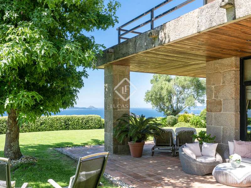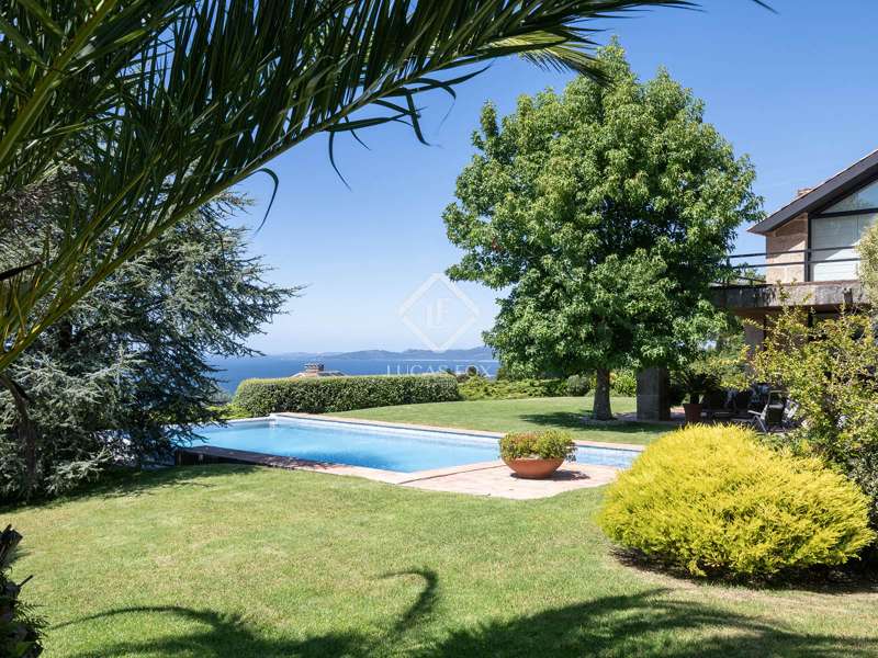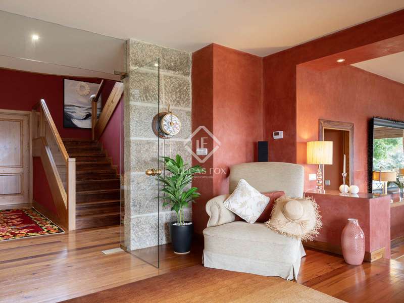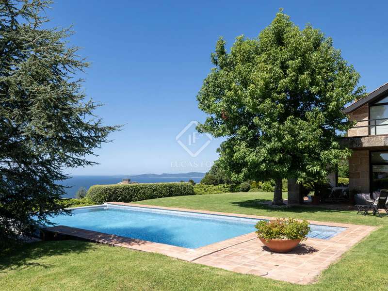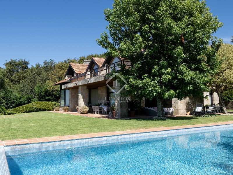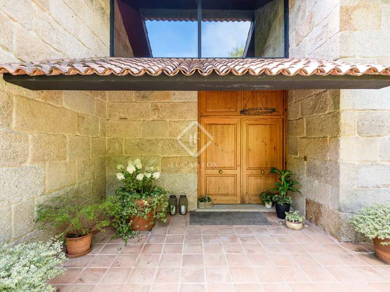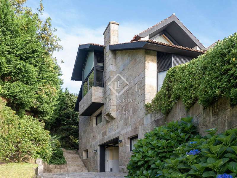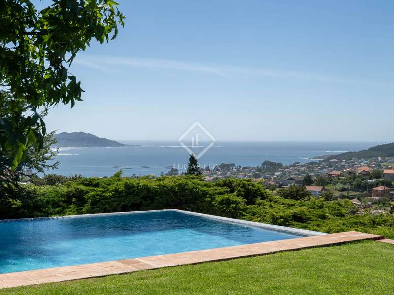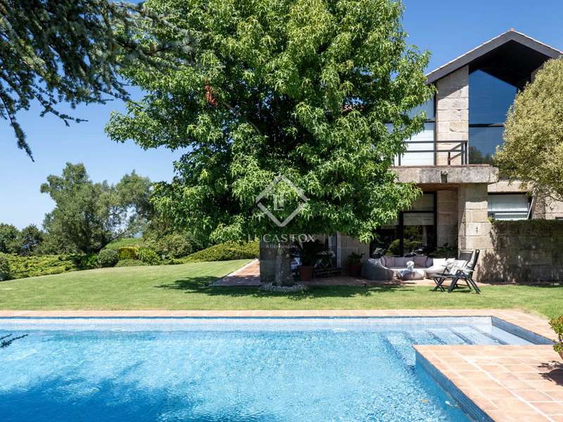 On the hilltop of Nigran, Pontevedra, this exclusive villa offers exquisite taste, high wooden ceilings and stunning panoramic views. The villa is in a flat garden that overlooks the Vigo estuary, from Baiona towards Vigo. Set in one of the most sought-after areas of the Vigo coastline, the property enjoys tranquillity and security. The property measures 2,500 m² and offers complete privacy. Upon entering, the landscaping provides a unique design finished with exquisite flowers, trees and shrubs. Towards the villa, we have beautiful outdoor spaces with terraces and porches, providing panoramic views. Once inside, we are welcomed by a double-door entry and high ceilings measuring almost 5 metres. On the right-hand side, we find a spacious study area or sitting lounge. This can easily be converted into a bedroom if necessary. A guest toilet is finished with travertine marble and good-quality taps and fittings. Down the hall, we find the living room with a built-in gas or wood-burning fireplace and large windows overlooking the garden. A split-level dining section is large enough for 12 guests if necessary. These areas provide access to the outdoor porch and garden area. Large sliding doors make the area conveniently larger. Next to the dining room is the laundry room with a bathroom, which also provides access to the outside. The kitchen is next to the laundry room. It is finished with Santos cabinetry, lovely Spanish tiles and a table. Two large sliding doors provide access to an outdoor dining area for a summer cook out next to a barbecue. Upstairs there is a generous landing featuring a curved glass bannister. Here, there are high vaulted ceilings finished with heart pine carpentry. There are two en-suite bedrooms, both of a good size. One bedroom offers a mezzanine floor, currently used as a small study area. The same bedroom offers a balcony overlooking the garden area and the sea. Next to the bedrooms is a home office/library, which can be converted into another bedroom if necessary. Right next to the office is the main en-suite bedroom and dressing room with twin wardrobes. A good-sized balcony overlooks the garden and estuary. Next to the dressing room we find the en-suite bathroom, finished with a freestanding shower and jacuzzi all finished with travertine marble. On the ground floor, there is a family room/in-house service bedroom with a bathroom and its own entrance. There is also a technical room, pantry, wine cellar, tool room and a sizeable gym/storage room. The parking area offers parking for 3–4 vehicles. There is also a sizeable storage area. The villa offers underfloor heating throughout. It also has solar panels for efficiency and backup batteries. The property is very well situated between Vigo city and Baiona. The area is surrounded by mountains, magnificent, safe beaches, marinas, water sports facilities and golf clubs. It would be ideal for a growing family looking to relocate to a larger property where there are excellent international schools and convenience services. It would also be ideal for anyone looking to purchase a second home in an area with a climate that is good throughout the summer and winter months. Please contact us for further details.