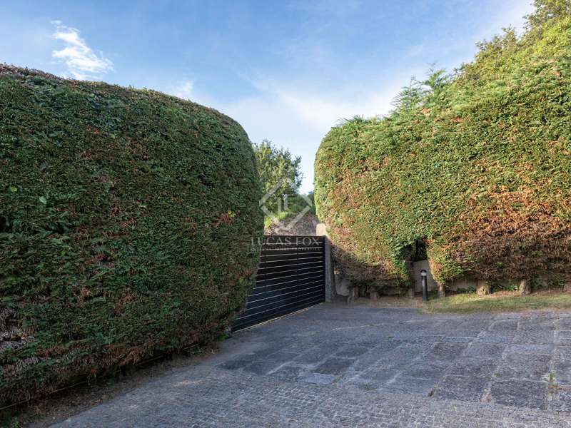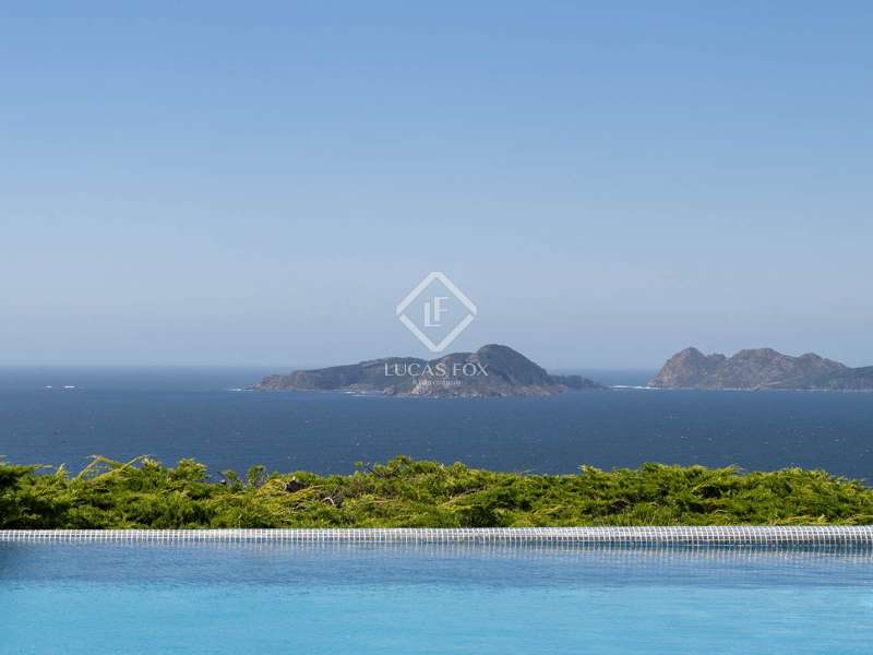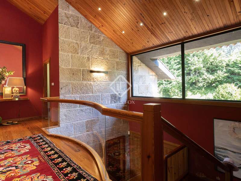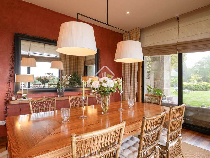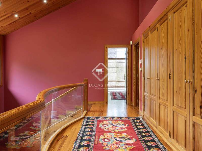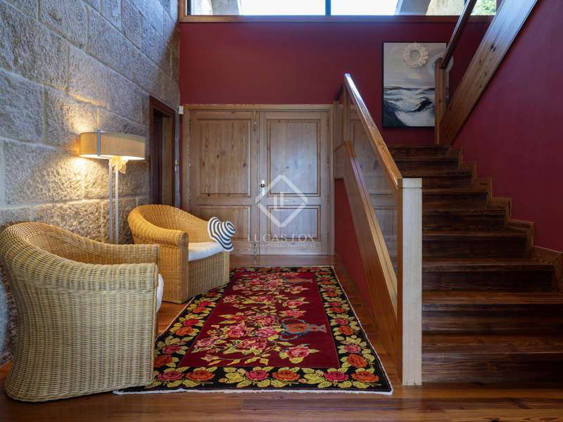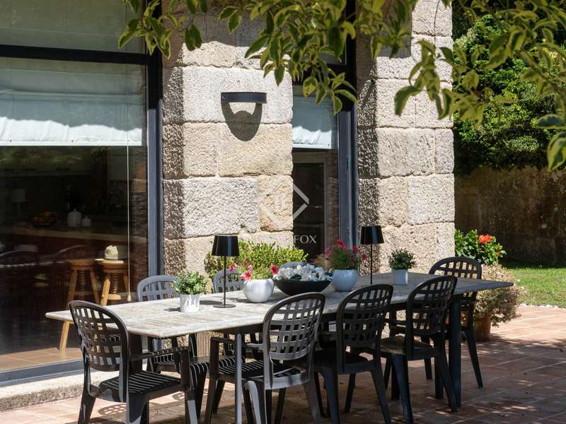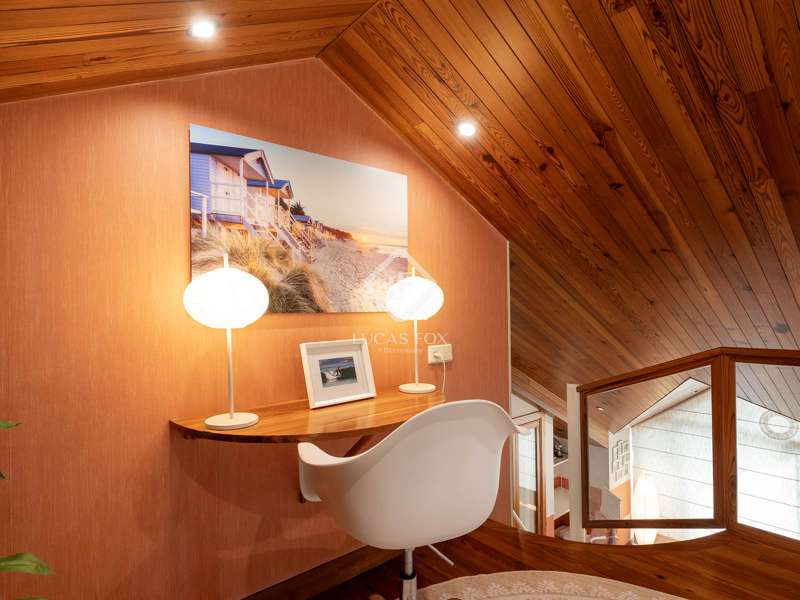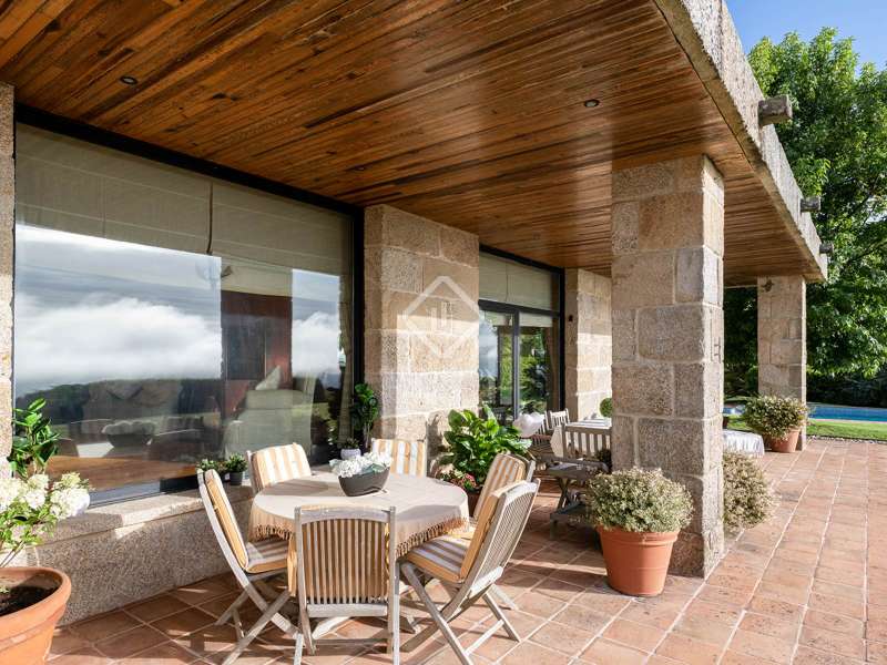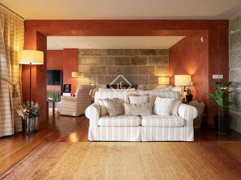 On the hilltop of Nigran, Pontevedra, this exclusive villa offers exquisite taste, high wooden ceilings and stunning panoramic views. The villa is in a flat garden that overlooks the Vigo estuary, from Baiona towards Vigo. Set in one of the most sought-after areas of the Vigo coastline, the property enjoys tranquillity and security. The property measures 2,500 m² and offers complete privacy. Upon entering, the landscaping provides a unique design finished with exquisite flowers, trees and shrubs. Towards the villa, we have beautiful outdoor spaces with terraces and porches, providing panoramic views. Once inside, we are welcomed by a double-door entry and high ceilings measuring almost 5 metres. On the right-hand side, we find a spacious study area or sitting lounge. This can easily be converted into a bedroom if necessary. A guest toilet is finished with travertine marble and good-quality taps and fittings. Down the hall, we find the living room with a built-in gas or wood-burning fireplace and large windows overlooking the garden. A split-level dining section is large enough for 12 guests if necessary. These areas provide access to the outdoor porch and garden area. Large sliding doors make the area conveniently larger. Next to the dining room is the laundry room with a bathroom, which also provides access to the outside. The kitchen is next to the laundry room. It is finished with Santos cabinetry, lovely Spanish tiles and a table. Two large sliding doors provide access to an outdoor dining area for a summer cook out next to a barbecue. Upstairs there is a generous landing featuring a curved glass bannister. Here, there are high vaulted ceilings finished with heart pine carpentry. There are two en-suite bedrooms, both of a good size. One bedroom offers a mezzanine floor, currently used as a small study area. The same bedroom offers a balcony overlooking the garden area and the sea. Next to the bedrooms is a home office/library, which can be converted into another bedroom if necessary. Right next to the office is the main en-suite bedroom and dressing room with twin wardrobes. A good-sized balcony overlooks the garden and estuary. Next to the dressing room we find the en-suite bathroom, finished with a freestanding shower and jacuzzi all finished with travertine marble. On the ground floor, there is a family room/in-house service bedroom with a bathroom and its own entrance. There is also a technical room, pantry, wine cellar, tool room and a sizeable gym/storage room. The parking area offers parking for 3–4 vehicles. There is also a sizeable storage area. The villa offers underfloor heating throughout. It also has solar panels for efficiency and backup batteries. The property is very well situated between Vigo city and Baiona. The area is surrounded by mountains, magnificent, safe beaches, marinas, water sports facilities and golf clubs. It would be ideal for a growing family looking to relocate to a larger property where there are excellent international schools and convenience services. It would also be ideal for anyone looking to purchase a second home in an area with a climate that is good throughout the summer and winter months. Please contact us for further details.