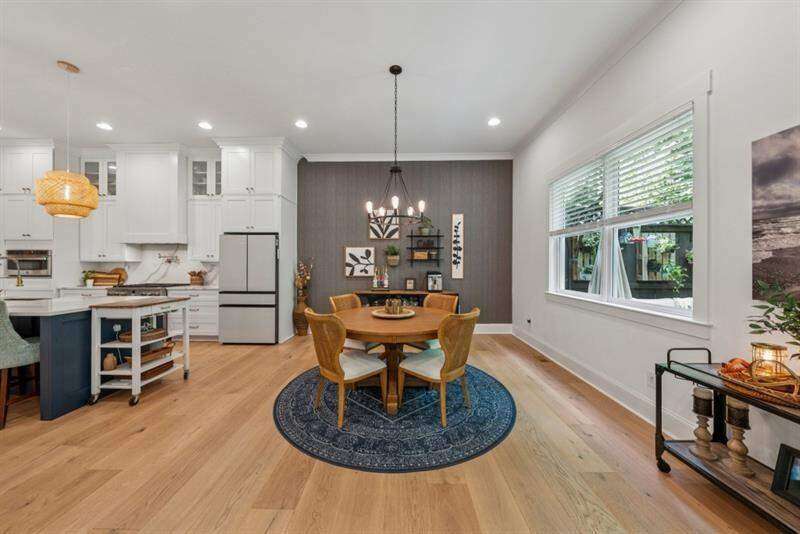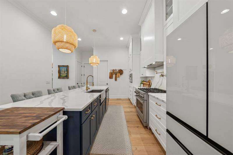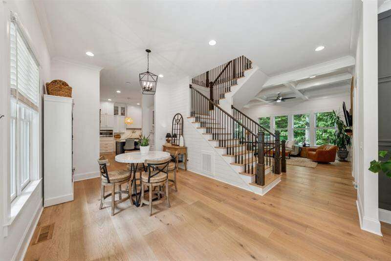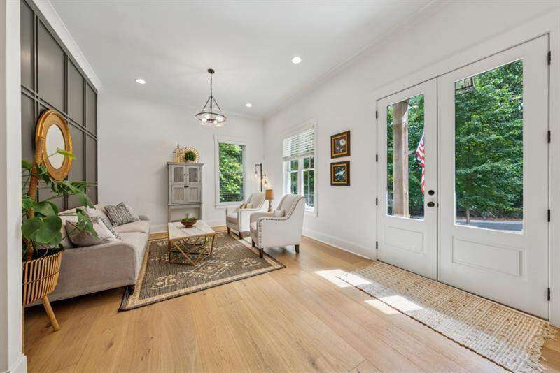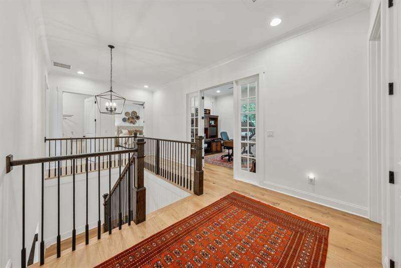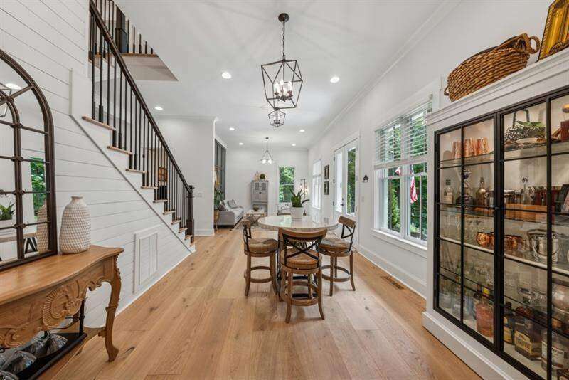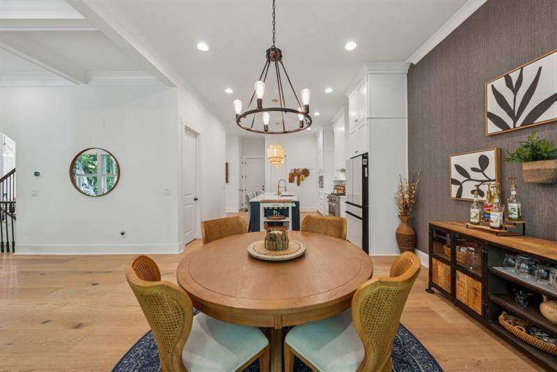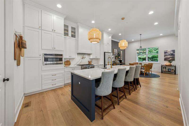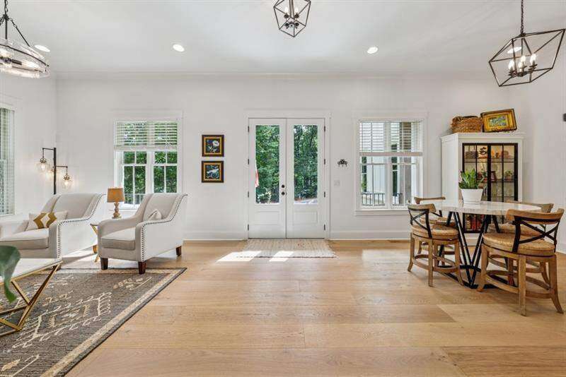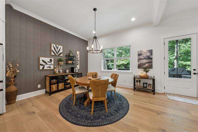 Experience unparalleled elegance in this gorgeous, modern, like new 6-bedroom, 5-bathroom plus office home. Perfectly situated less than 5 minutes from the vibrant dining and shopping of downtown Alpharetta, Roswell and Milton/Crabapple, this home offers the ideal blend of tranquility and convenience in the coveted Milton High School district. Step inside and be captivated. This bright and inviting 3-story home features soaring 11-foot ceilings and stunning 9-inch white oak floors that flow throughout the expansive open floor plan. A dramatic wall of windows floods the space with natural light and provides serene views of your private, wooded oasis. The cozy living area, accented by an inviting fireplace, creates a chic space perfect for lively gatherings or quiet evenings at home. Custom craftsmanship makes this home extra special, with beautiful coffered ceilings, planked walls, elegant wainscoting, and refined decorative moldings throughout. The heart of the home is a true chef's kitchen, shining with a large island, sleek quartz counters, spacious walk-in pantry, stylish wine bar, and stainless-steel appliances. On the upper floor, the stunning owner's suite is a true retreat, boasting a huge walk-in closet with custom built-ins and an island, plus a gorgeous ensuite featuring double vanities, a soaking tub, and a large shower for ultimate relaxation. Three additional bedrooms upstairs each with their own ensuite, as well as a light-filled separate office space with French doors. A fully finished basement adds incredible versatility with a bedroom, full bathroom, cozy living area, home gym, extra storage and large workshop. With more than 5,700 sq ft of thoughtfully designed space and easy access to GA 400, this home perfectly complements your lifestyle. Schedule your showing today and discover the life within Alpharetta you've been dreaming of!