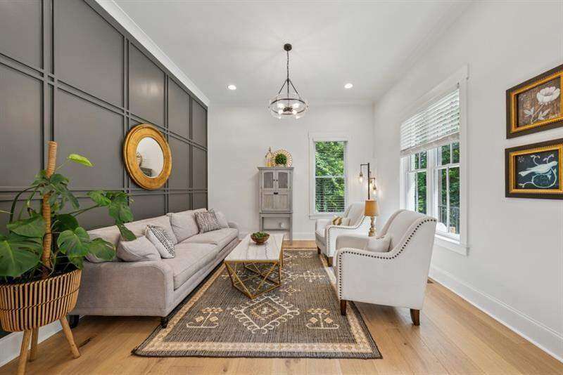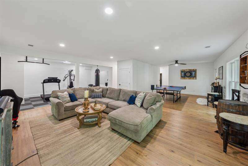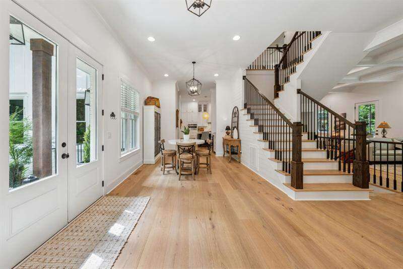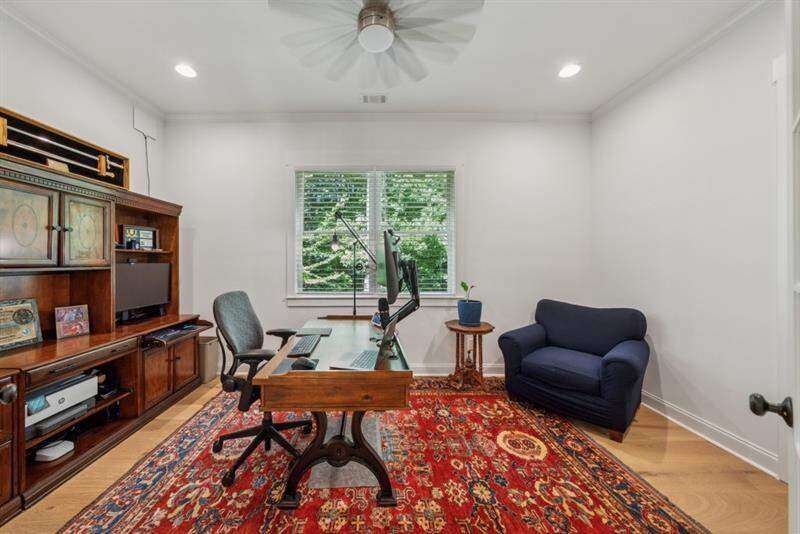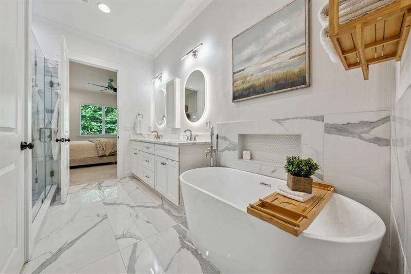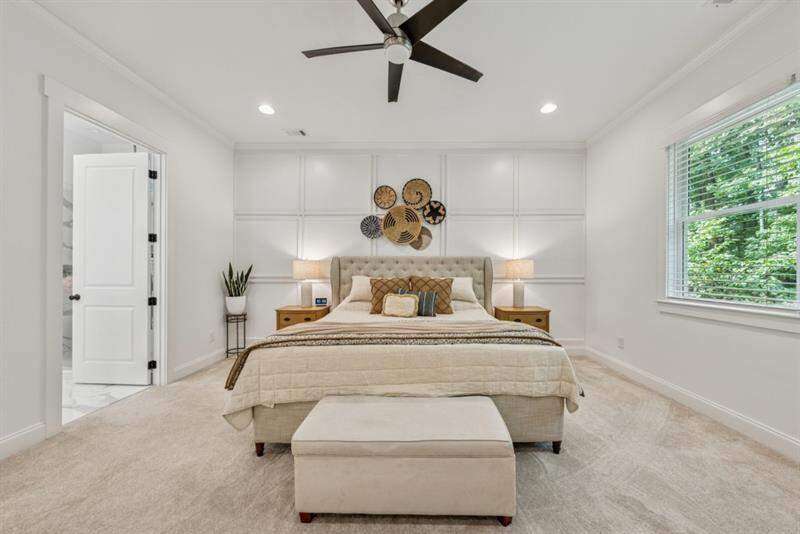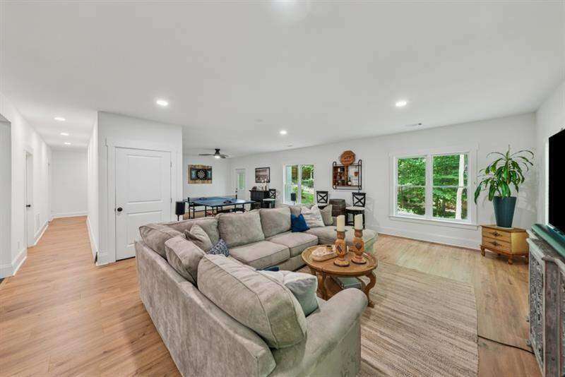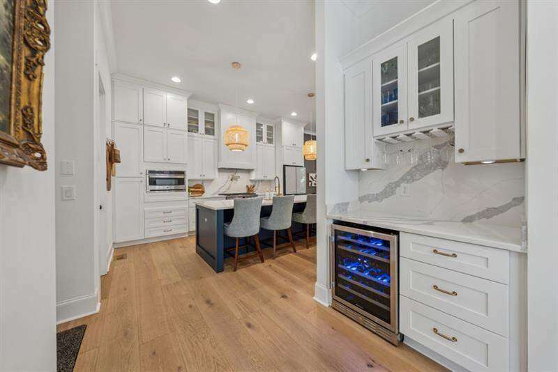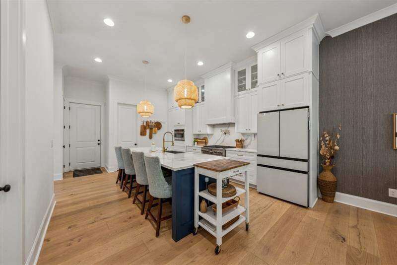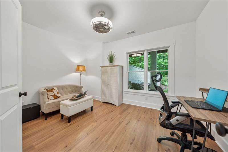 Experience unparalleled elegance in this gorgeous, modern, like new 6-bedroom, 5-bathroom plus office home. Perfectly situated less than 5 minutes from the vibrant dining and shopping of downtown Alpharetta, Roswell and Milton/Crabapple, this home offers the ideal blend of tranquility and convenience in the coveted Milton High School district. Step inside and be captivated. This bright and inviting 3-story home features soaring 11-foot ceilings and stunning 9-inch white oak floors that flow throughout the expansive open floor plan. A dramatic wall of windows floods the space with natural light and provides serene views of your private, wooded oasis. The cozy living area, accented by an inviting fireplace, creates a chic space perfect for lively gatherings or quiet evenings at home. Custom craftsmanship makes this home extra special, with beautiful coffered ceilings, planked walls, elegant wainscoting, and refined decorative moldings throughout. The heart of the home is a true chef's kitchen, shining with a large island, sleek quartz counters, spacious walk-in pantry, stylish wine bar, and stainless-steel appliances. On the upper floor, the stunning owner's suite is a true retreat, boasting a huge walk-in closet with custom built-ins and an island, plus a gorgeous ensuite featuring double vanities, a soaking tub, and a large shower for ultimate relaxation. Three additional bedrooms upstairs each with their own ensuite, as well as a light-filled separate office space with French doors. A fully finished basement adds incredible versatility with a bedroom, full bathroom, cozy living area, home gym, extra storage and large workshop. With more than 5,700 sq ft of thoughtfully designed space and easy access to GA 400, this home perfectly complements your lifestyle. Schedule your showing today and discover the life within Alpharetta you've been dreaming of!
