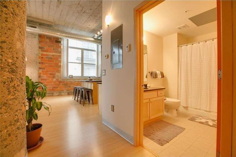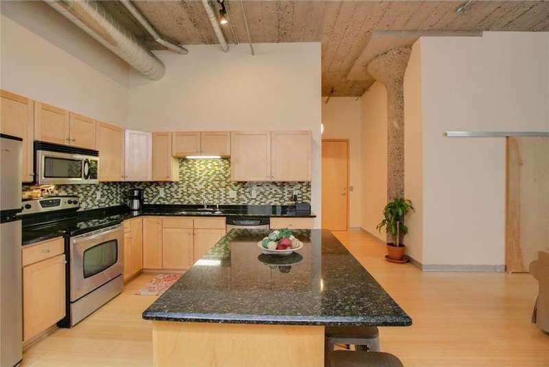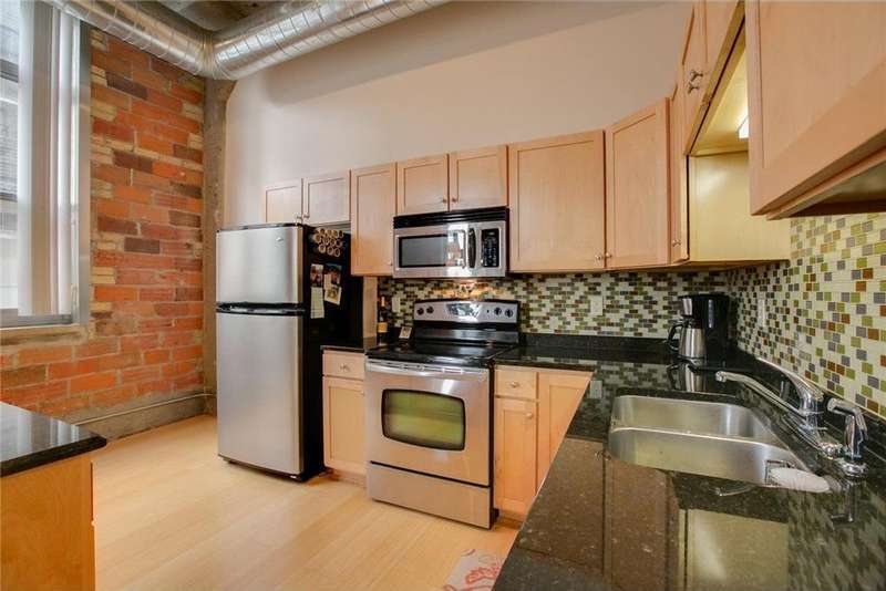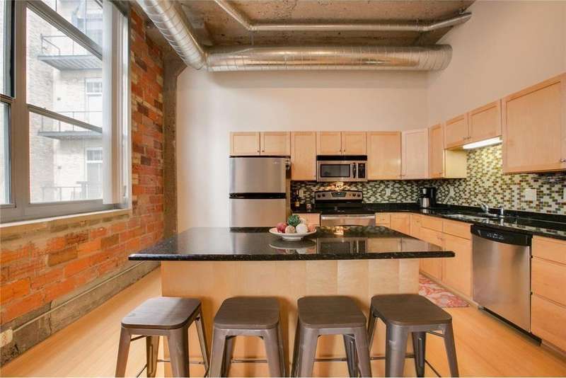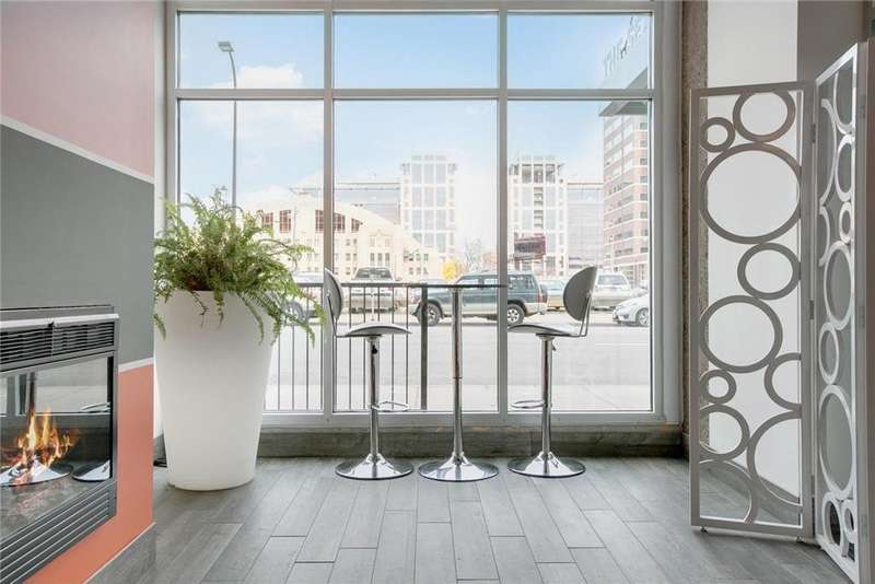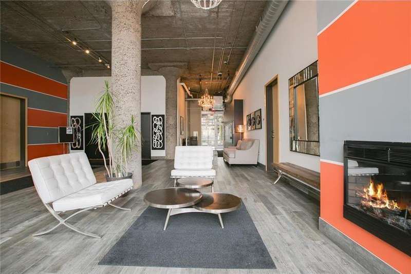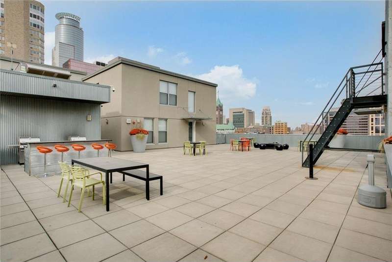 Open 1 bedroom floor plan with gas fireplace, private deck, granite counters, custom tile backsplash, and center island. Exposed brick walls, oversized windows, rooftop deck with panoramic views of the city, one block from skyway. 1 heated parking stall included with monthly rent. Tenant responsible for application fee and move in/out fee. Pet deposit may apply. One block from Skyway. Parking stall in building next door.