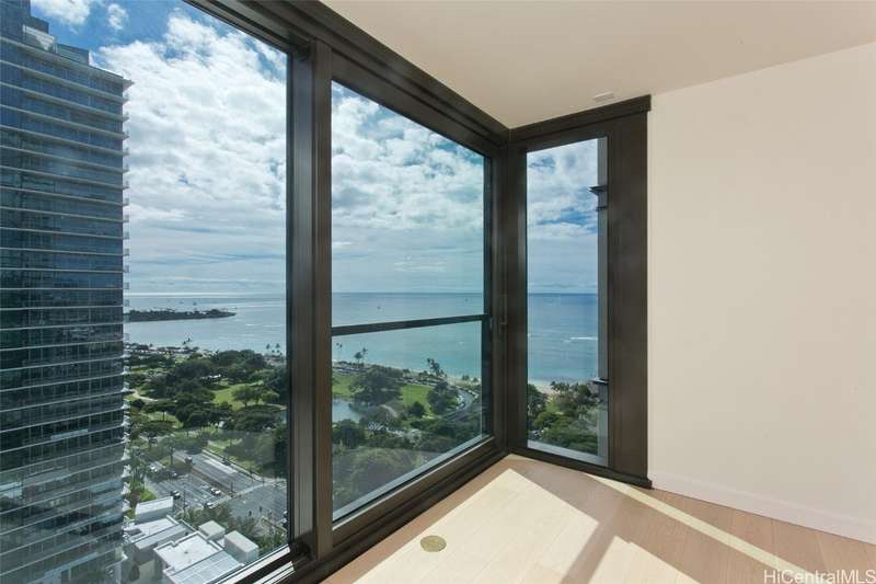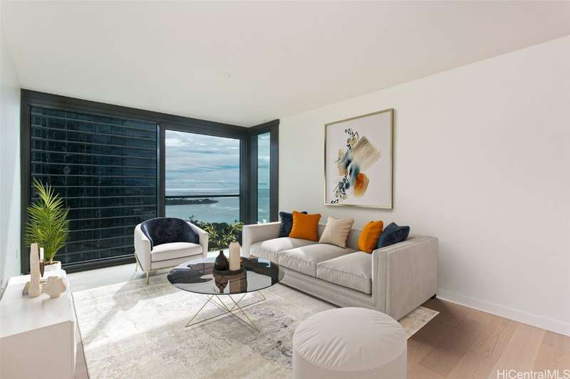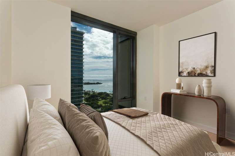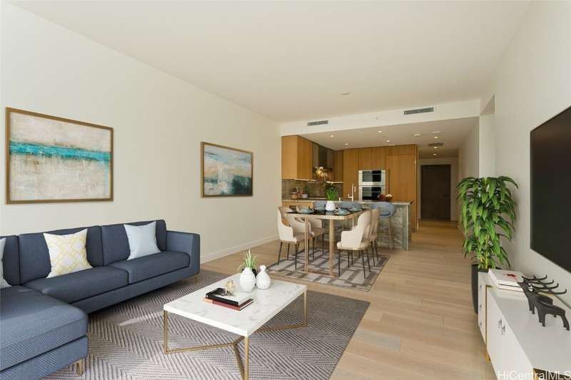 Luxury living at the brand-new Victoria Place in Ward Village. Front-Row Building! This is the largest 947 sqft 1-bedroom, 1-bathroom PLUS "den" layout in the building. The den can be converted to an extra room or office, tailored to your personal needs. The unit comes with 1 covered, secured parking AND an EV charger. This unit is located on the preferred Diamond Head/cooler side of the building with beautiful ocean, coastline and city views. Enjoy top of the line SubZero and Wolf appliances, plus custom Studio Becker cabinetry. The building includes concierge services, 24/7 security, valet, and exceptional amenities! Enjoy a recreation deck with fitness center, yoga room, infinity and lap pool, Launala pool house, men's & women's spa, hot/cold plunges, sauna, massage rooms, private cabanas, theater, dining, party and wine room, chef's kitchen, guest suites, BBQ areas, lush gardens and so much more. There is a dog run for pets, and plenty of storage for bikes and surfboards. Enjoy an urban lifestyle with famous restaurants, excellent shopping, markets, entertainment, sandy beaches and parks minutes away.