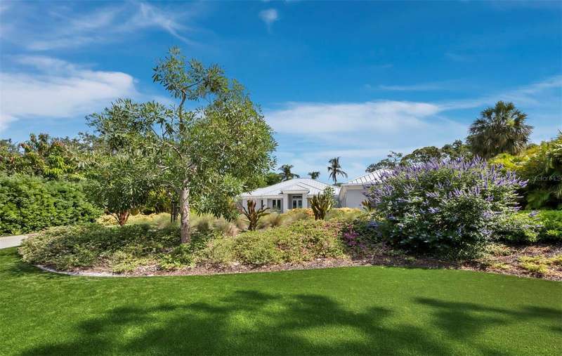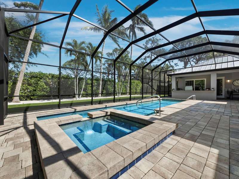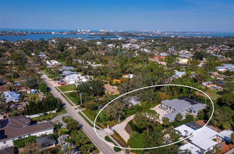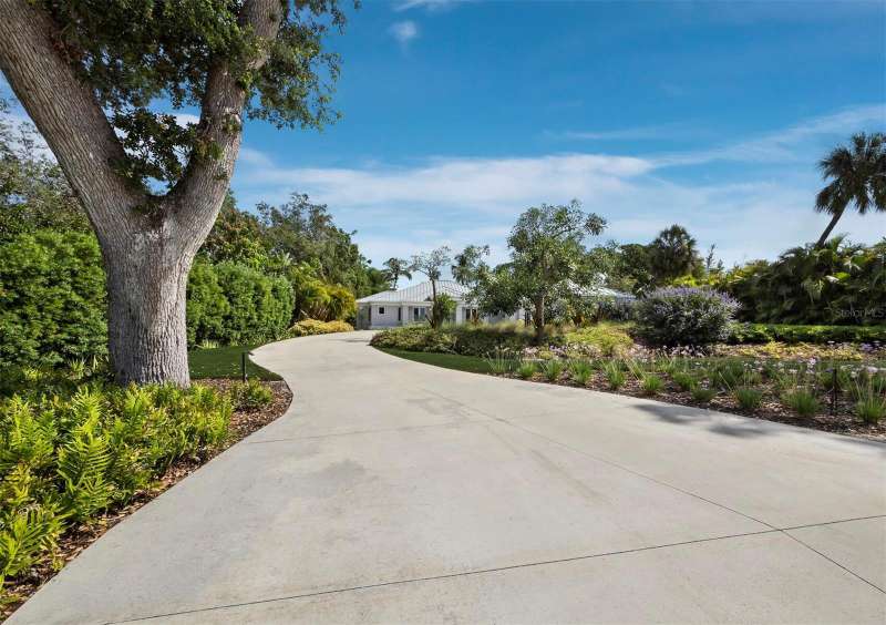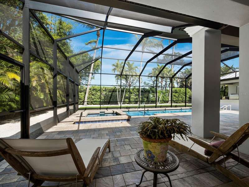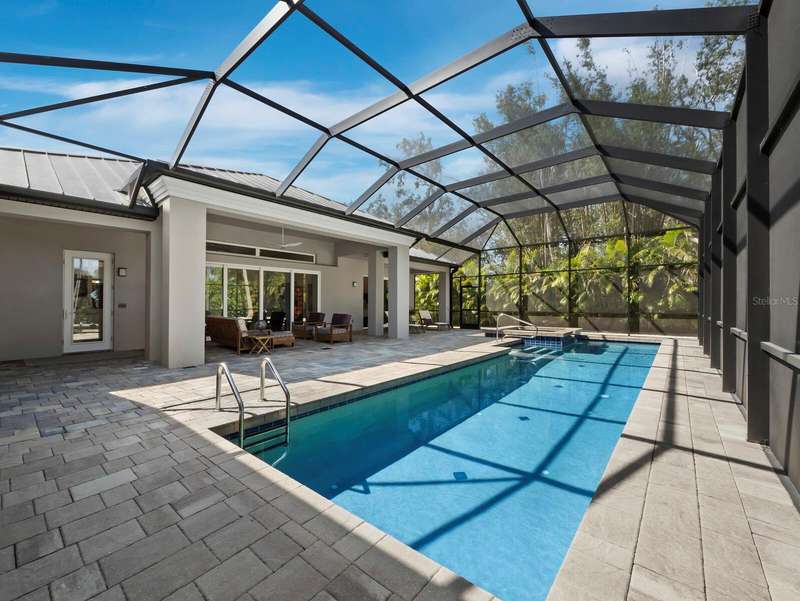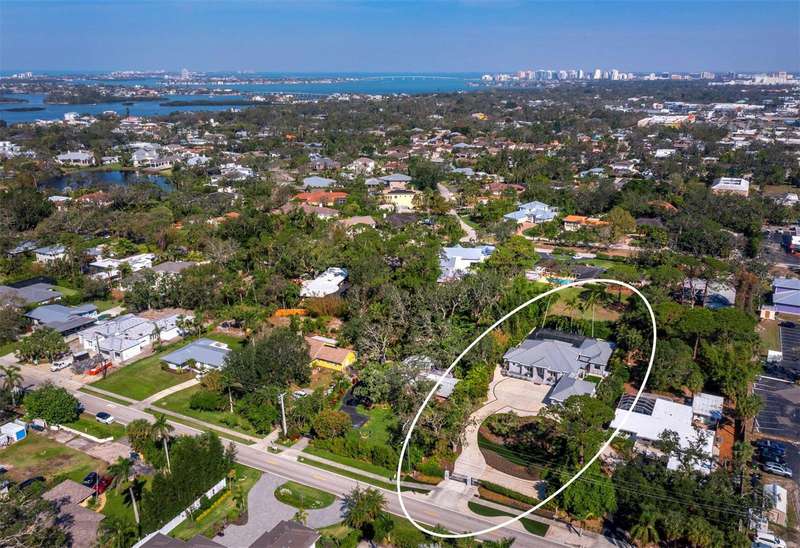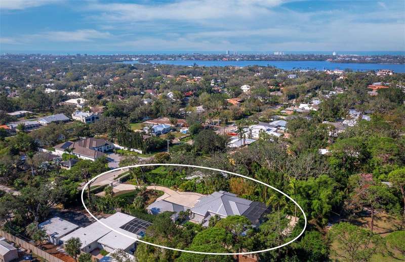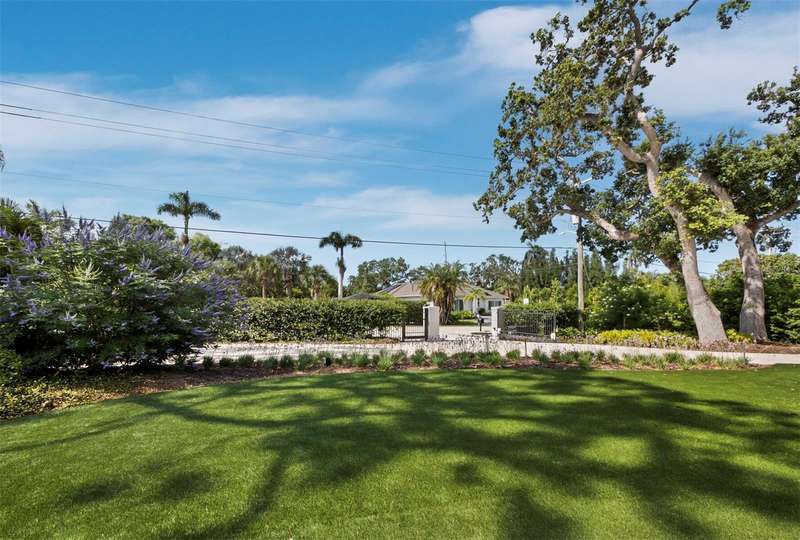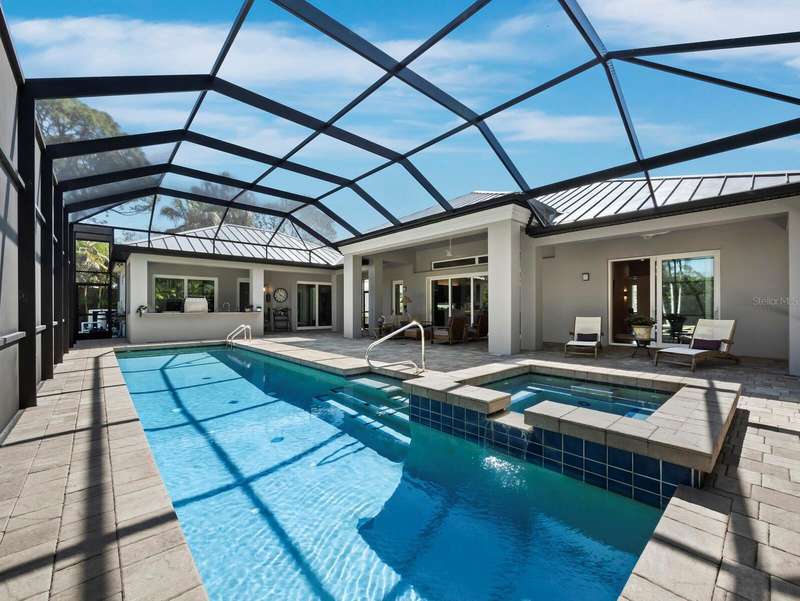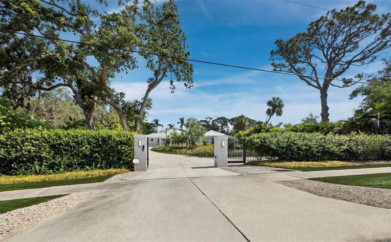 This exceptional custom-built residence with separate guest quarters is located in the highly sought-after Oyster Bay Estates on over half an acre of land and offers a private, luxurious lifestyle and a unique blend of modern upgrades. Situated in the desirable ‘West of Trail’ community near Sarasota Bay, the main house features 10-12 ft ceilings, travertine flooring, and surround sound throughout. The galley-style kitchen showcases exotic custom Padauk cabinetry finished in a high gloss lacquer, granite countertops, paneled Sub-Zero and Bosch dishwasher, double ovens, new Wolf cooktop with a stainless-steel hood, and a spacious pantry with new cabinetry, sink, and faucet. The laundry room is also well-appointed with white oak cabinetry, large sink, and overflow storage for extra appliances. The primary bedroom offers dual walk-in closets with wood cabinetry, fabulous and functional built-in drawers, individual vanities, and a separate dual-head shower with large square exotic stone tile. Off the primary bedroom is an office/den that could serve as an additional en suite bedroom. The oversized screened lanai, featuring brick pavers, is perfect for outdoor living, complete with a heated 40-ft lap pool, and a spa. The separate guest quarters, offering privacy yet convenience, includes a gathering space or bedroom, an office, and a full bedroom suite with a bath. The home is further enhanced with a pillared entrance, large driveway with extra parking, side-entry 3-car garage, and a NEW METAL ROOF IN 2025, adding to its curb appeal. Other recent updates to the home include: Master bath: re-tiled, new vanity, toilet, bidet, shower fixtures, and Robern mirrors - Guest bath: re-finished vanity, new top, toilet, shower - fixtures, and Robern mirror - Guest house bath: new vanity, mirror, and lighting - Kitchen: new countertops, cooktop, dishwasher, sink, faucet, and pantry with new cabinets, sink, and faucet - Washer and dryer, wine bar with beverage center in the main house - Coffee bar with a fridge in the guest house - Guest house floor refinished with polished concrete - Fresh paint inside and out - Windows and doors - Kohler generator, new secure entry gate, and new low-maintenance AstroTurf throughout - Grill, hot burner, and pizza oven on the lanai - Pool heater, re-screened lanai, irrigation system, driveway, and landscaping - LED landscape lighting and insulated attics - Blue light to AC units and Vacuum sweep outs . This home blends exquisite custom details with extensive recent updates and a thoughtful floor plan to provide a remarkable living experience in one of Sarasota's most desirable neighborhoods.