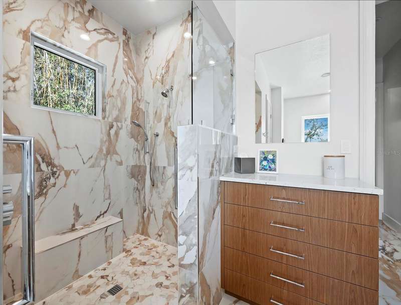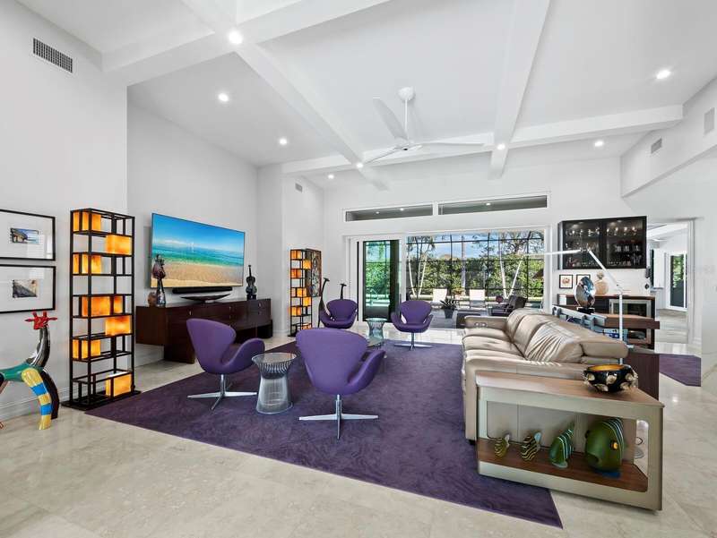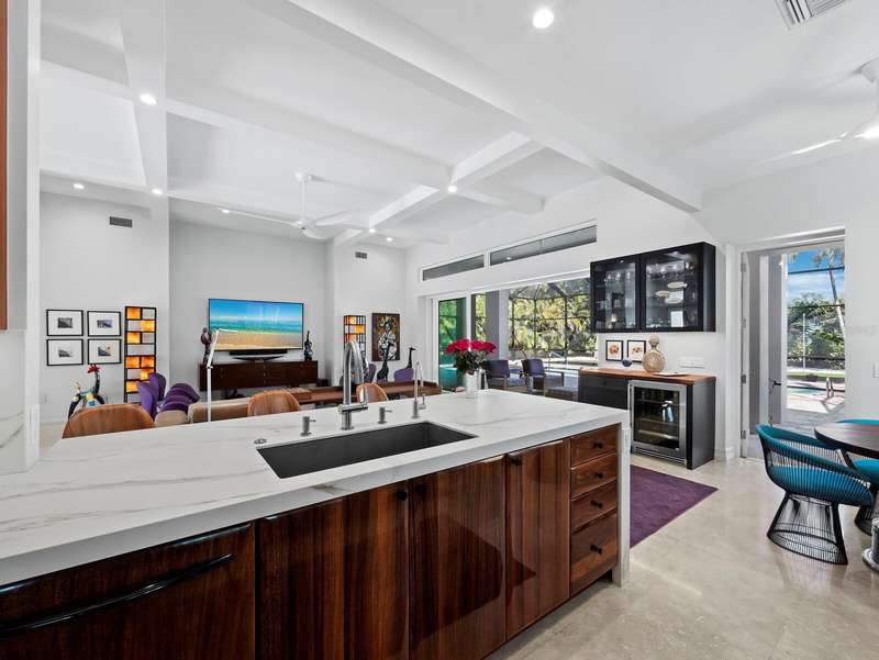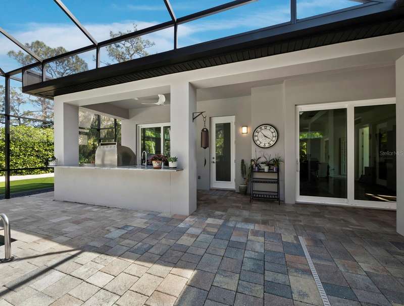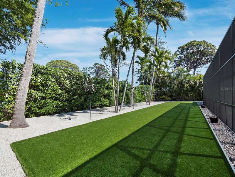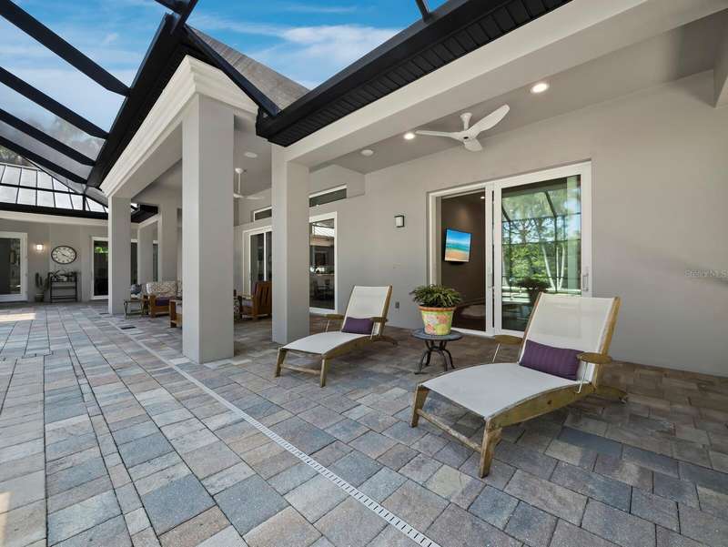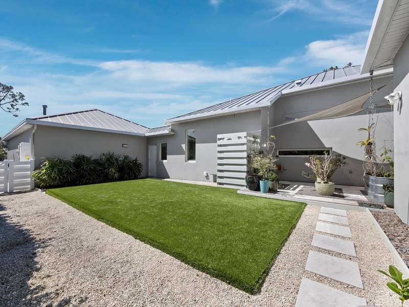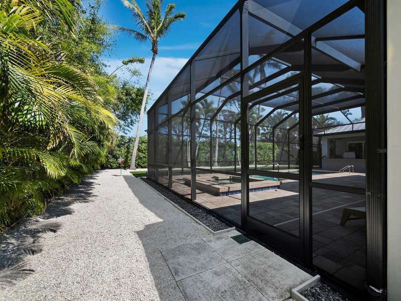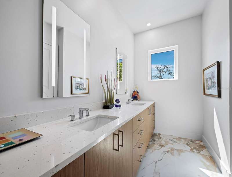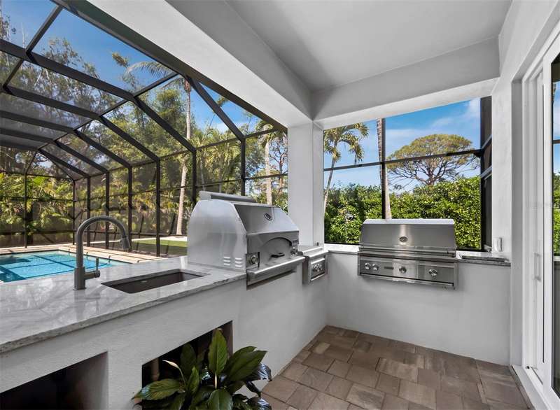 This exceptional custom-built residence with separate guest quarters is located in the highly sought-after Oyster Bay Estates on over half an acre of land and offers a private, luxurious lifestyle and a unique blend of modern upgrades. Situated in the desirable ‘West of Trail’ community near Sarasota Bay, the main house features 10-12 ft ceilings, travertine flooring, and surround sound throughout. The galley-style kitchen showcases exotic custom Padauk cabinetry finished in a high gloss lacquer, granite countertops, paneled Sub-Zero and Bosch dishwasher, double ovens, new Wolf cooktop with a stainless-steel hood, and a spacious pantry with new cabinetry, sink, and faucet. The laundry room is also well-appointed with white oak cabinetry, large sink, and overflow storage for extra appliances. The primary bedroom offers dual walk-in closets with wood cabinetry, fabulous and functional built-in drawers, individual vanities, and a separate dual-head shower with large square exotic stone tile. Off the primary bedroom is an office/den that could serve as an additional en suite bedroom. The oversized screened lanai, featuring brick pavers, is perfect for outdoor living, complete with a heated 40-ft lap pool, and a spa. The separate guest quarters, offering privacy yet convenience, includes a gathering space or bedroom, an office, and a full bedroom suite with a bath. The home is further enhanced with a pillared entrance, large driveway with extra parking, side-entry 3-car garage, and a NEW METAL ROOF IN 2025, adding to its curb appeal. Other recent updates to the home include: Master bath: re-tiled, new vanity, toilet, bidet, shower fixtures, and Robern mirrors - Guest bath: re-finished vanity, new top, toilet, shower - fixtures, and Robern mirror - Guest house bath: new vanity, mirror, and lighting - Kitchen: new countertops, cooktop, dishwasher, sink, faucet, and pantry with new cabinets, sink, and faucet - Washer and dryer, wine bar with beverage center in the main house - Coffee bar with a fridge in the guest house - Guest house floor refinished with polished concrete - Fresh paint inside and out - Windows and doors - Kohler generator, new secure entry gate, and new low-maintenance AstroTurf throughout - Grill, hot burner, and pizza oven on the lanai - Pool heater, re-screened lanai, irrigation system, driveway, and landscaping - LED landscape lighting and insulated attics - Blue light to AC units and Vacuum sweep outs . This home blends exquisite custom details with extensive recent updates and a thoughtful floor plan to provide a remarkable living experience in one of Sarasota's most desirable neighborhoods.
