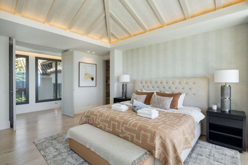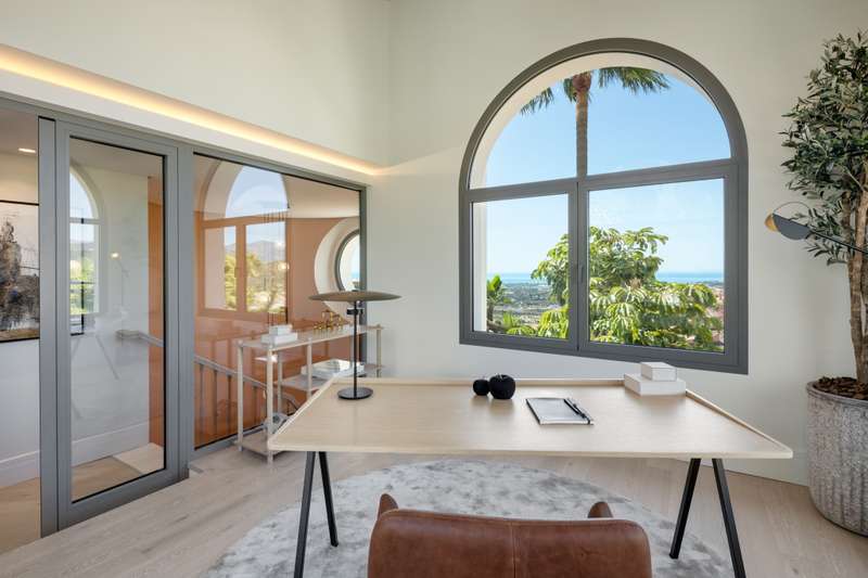 Villa Aguila is a remarkable villa for sale in Monte Halcones, Benahavís, offering a refined balance of modern elegance and timeless Andalusian character. Fully renovated in 2022, this three-story residence is set within a secure gated community that ensures privacy while maintaining excellent connections to the surrounding Costa del Sol. With captivating views over the Mediterranean Sea, the mountains, and its private pool area, this property is designed for discerning buyers seeking both comfort and sophistication. Inside, the villa reveals a carefully planned layout that accommodates seven spacious bedrooms, each with its own en-suite bathroom, allowing every family member or guest to enjoy a private retreat. The interiors are defined by a thoughtful interplay of light and space, enhanced by polished marble floors, warm wooden details, and contemporary furnishings that complement the home’s architectural vision. An expansive living and dining area connects seamlessly to the outdoor