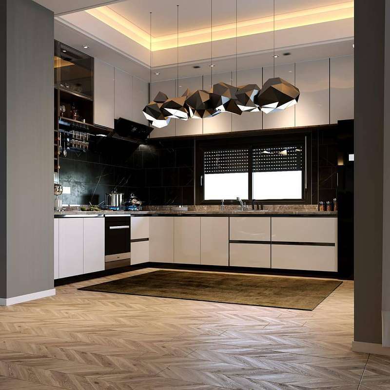 The villa consists of 4 bedrooms, 1 salon, 1 open-plan kitchen, 2 balconies, 1 terrace, and 3 bathrooms. A villa with a smart home system also consists of some pieces of furniture. The villa is equipped with a steel door, lacquered room doors, spot and LED lighting, PVC windows, an electric bind, a built-in set, air conditioning infrastructure, an intercom system, a central satellite system, internet access, and a home control system throughout the internet.