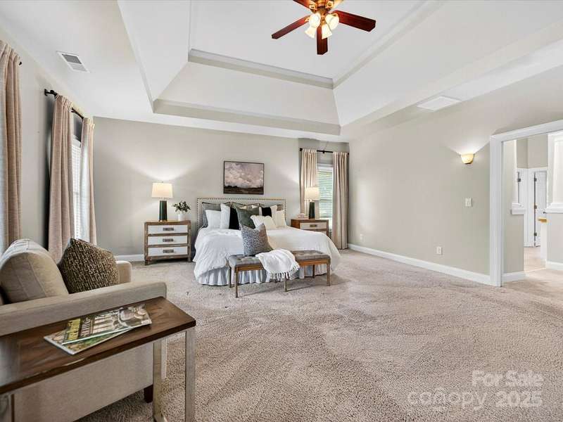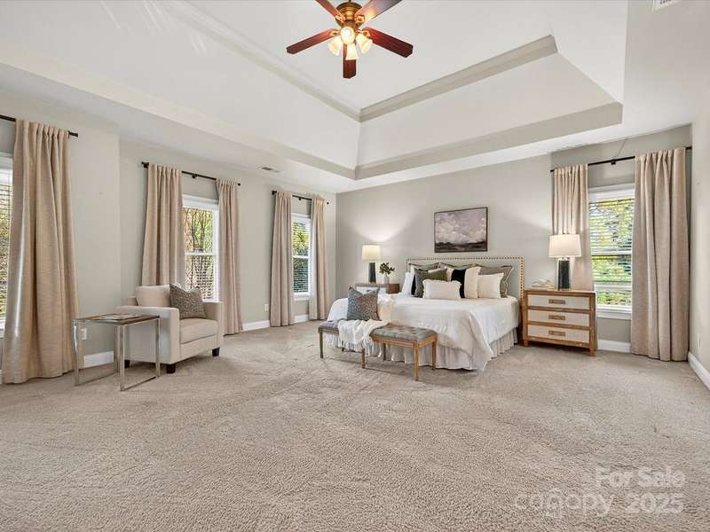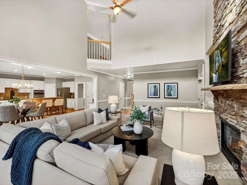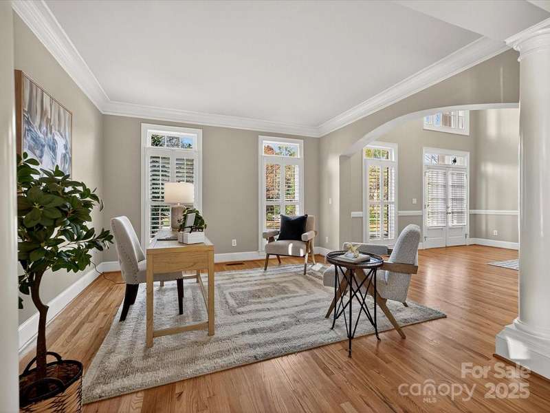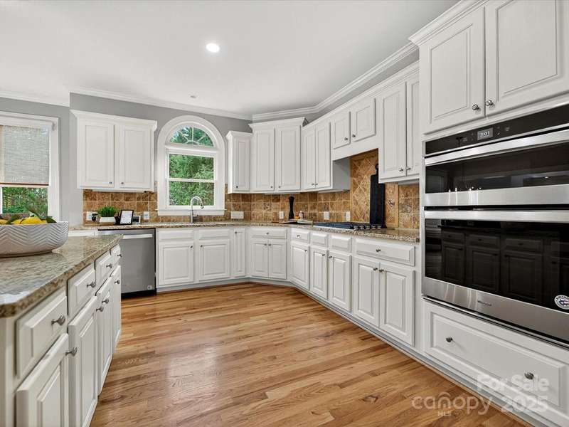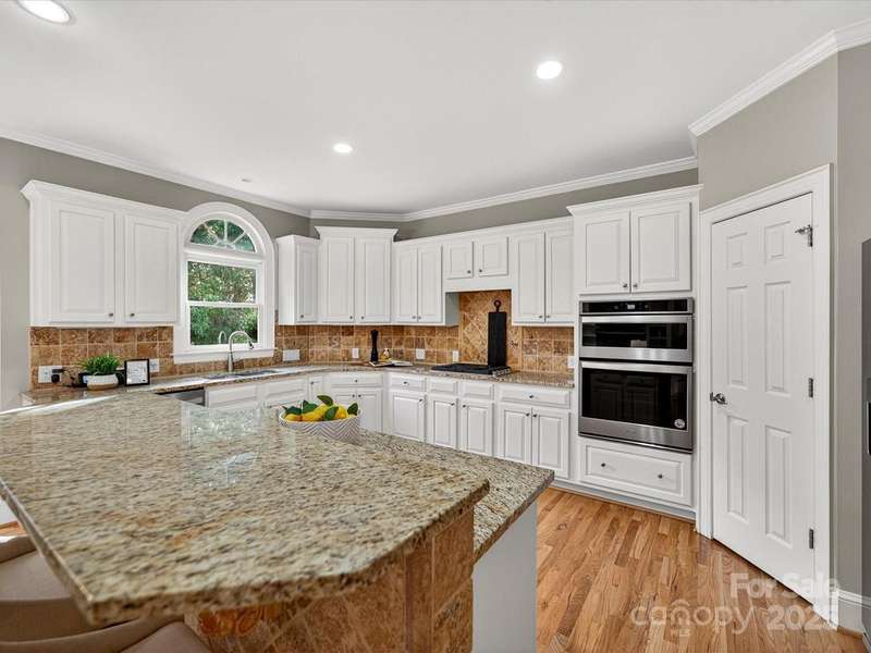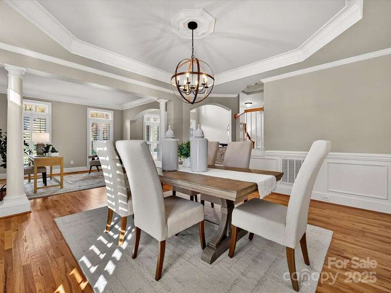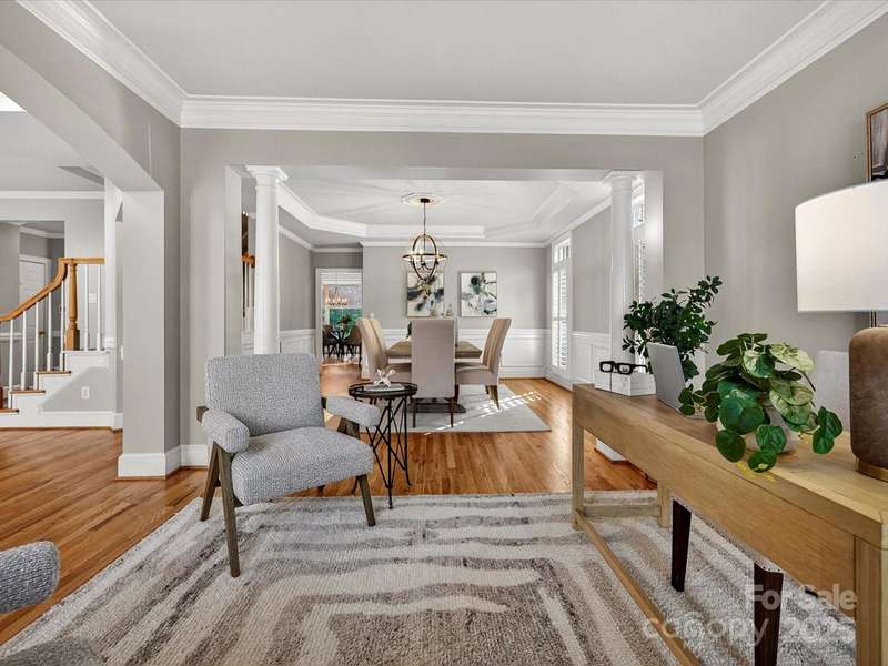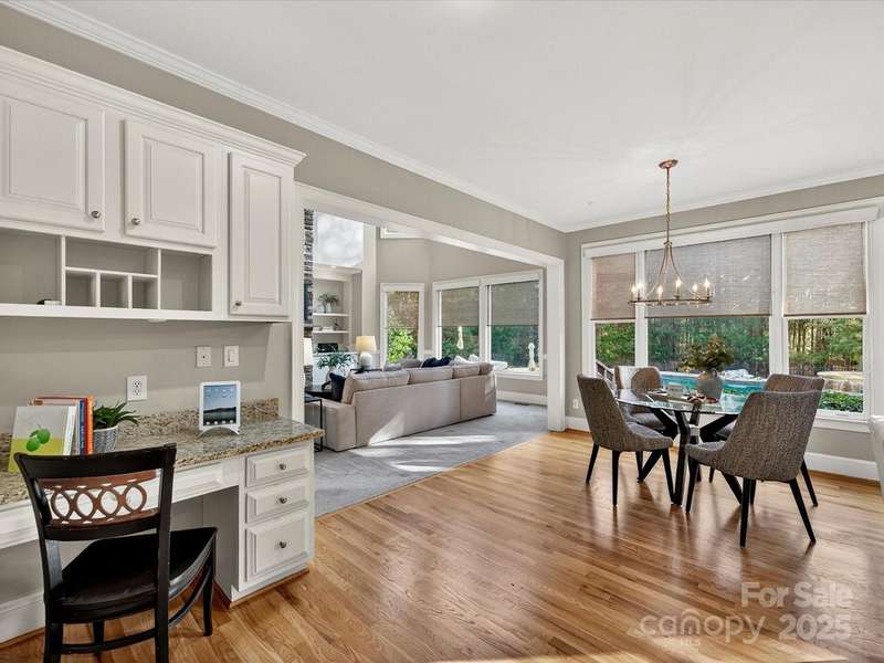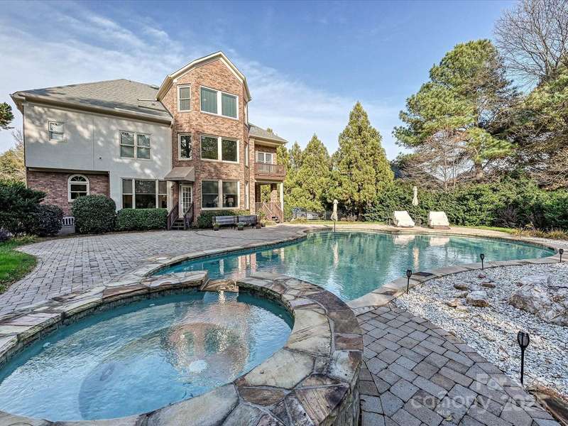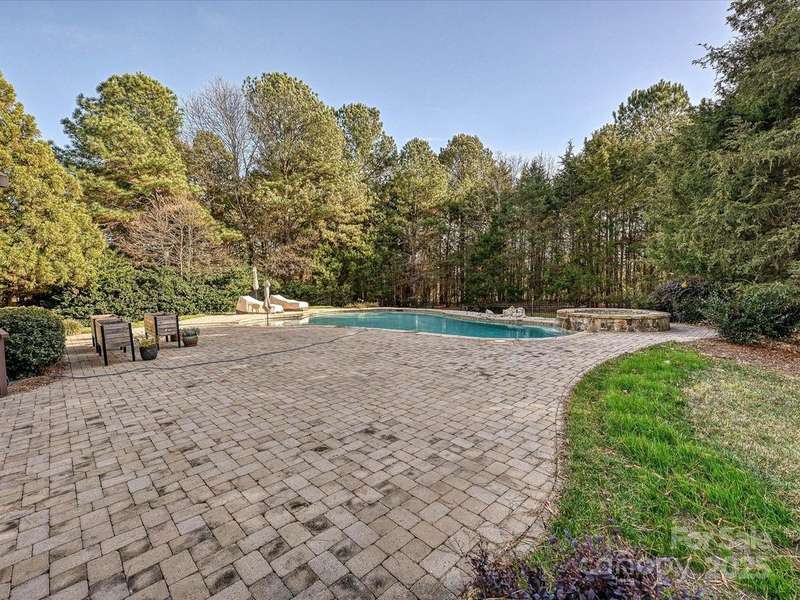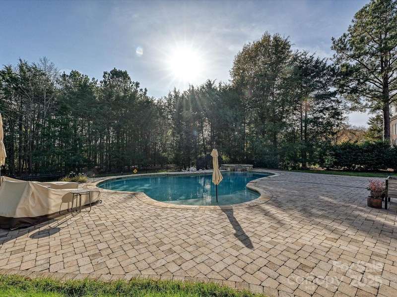 Great opportunity on this Windsor plan In Weddington Chase on a large private lot with pool! HW floors most of main level, plantation shutters on many windows, formal LR and DR plus 2 story GR w stone FP and double rear wall bay windows, spacious kitchen w island, white cabinets, granite countertops and tile backsplash, porch, huge primary BR w double walk-in closets and BA w vaulted ceiling, frameless shower, whirlpool tub, tile flooring and owners retreat-ideal for an office! Oversized secondary BRs w ceiling fans, finished 3rd floor w 2 large media/bonus rooms, full BA and finished storage area! Beautiful heated, salt water pool w lots of decking and hot tub! Backs to woods w no homes in sight!