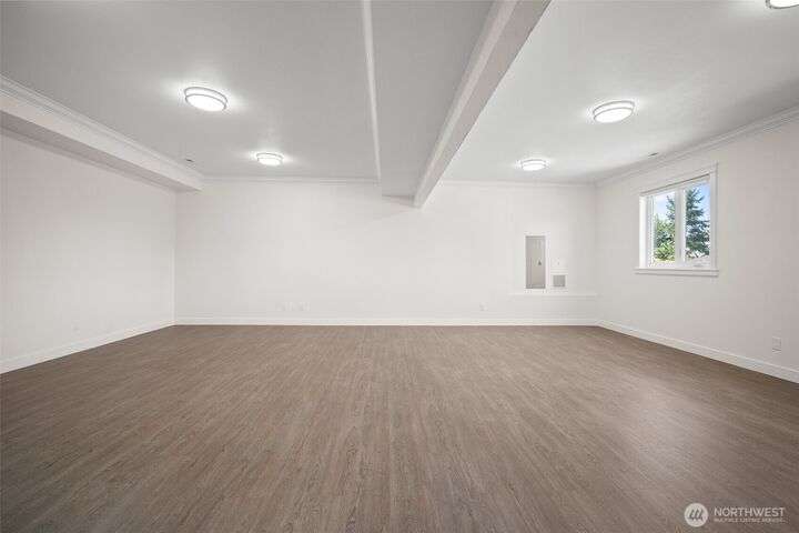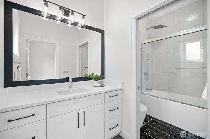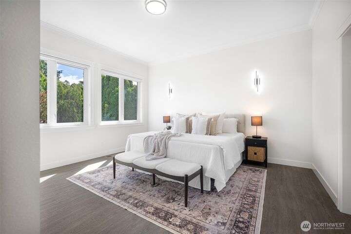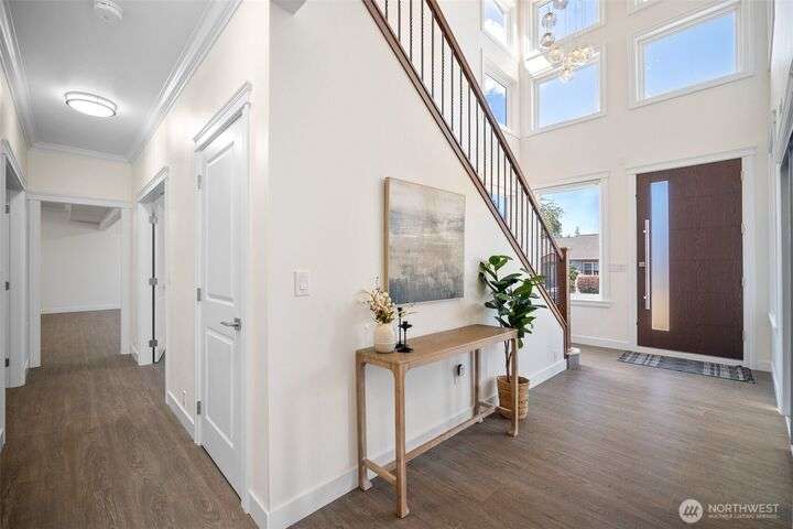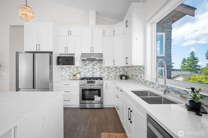 Modern luxury in a prime Bellingham location! Stunning custom-built home, short walk to Lake Whatcom, Whatcom Falls Park, trails, Barkley Village, and downtown. Soaring 15’ ceilings and expansive windows fill the open-concept living and dining areas with natural light, flowing seamlessly to a spacious deck—perfect for relaxing or entertaining. The chef’s kitchen features quartz countertops, stainless steel appliances, a walk-in pantry, and a large island with seating and storage. The main-level primary suite is a serene retreat with a spa-inspired bath and oversized shower. A second en-suite bedroom offers great flexibility. Downstairs includes a home office, media room, and game room. High-efficiency heat, A/C, and spacious 3-car garage.