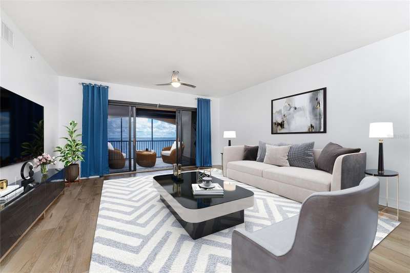 One or more photo(s) has been virtually staged. Picturesque water views of the Charlotte Harbor connected with Luxury living in beautiful Bella Lago Vivante, a gated community that offers all the amenities of resort style living. Come see this Beautifully updated condo that offers 2338sf, split floor plan, 3 bedroom, 3 full bathrooms with assigned under building parking with EV power hookup, and a private elevator that takes you directly into the home. With High ceilings, LVP flooring throughout most of the home, fresh paint, granite counters, white cabinets, newer stainless kitchen appliances, newer washer and dryer, this home is stunning! The updated master bathroom has a newly configured floorplan and boasts new cabinets, quartz counters, flooring, a large walk-in shower and water closet. The Master bedroom has 2 walk-in closets, access to the lanai and amazing views of the harbor. The Great room has sliders out to oversized lanai, interior electronic shade screens, and is open to the casual dining and kitchen. The guest side of the home has the 2nd and 3rd bedrooms, 2 full bathrooms, 5 closets in the hallway, laundry room with additional storage, and backdoor access. The 2nd bedroom is attached to the 2nd bathroom and the 3rd bedroom has double door entry. Both bedrooms have walk-in closets. There is a pocket door separating the 3rd bedroom, bathroom and laundry room, allowing for privacy. The air handler has an ultra violet light system. There are hurricane roll downs on the lanai and hurricane impact windows and doors. The furnishings in the home convey. Come see this gem and fall in love!