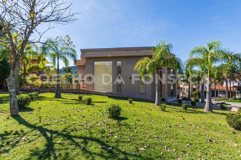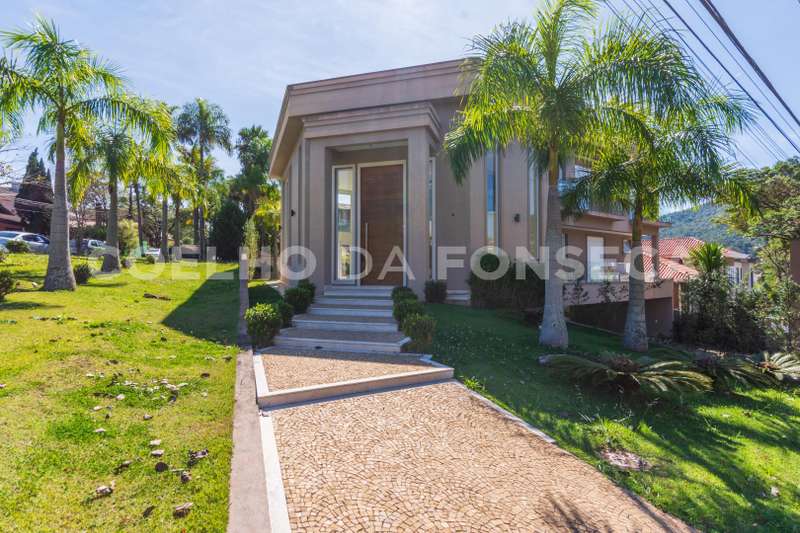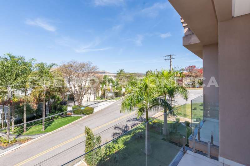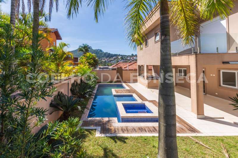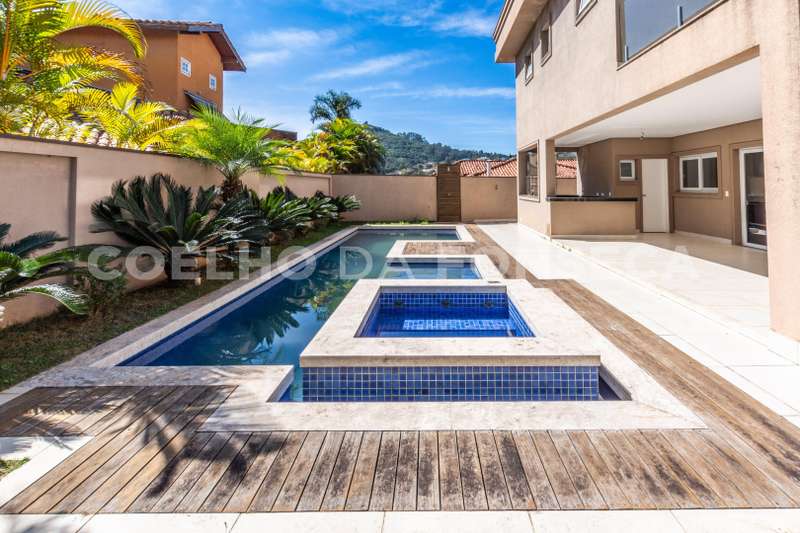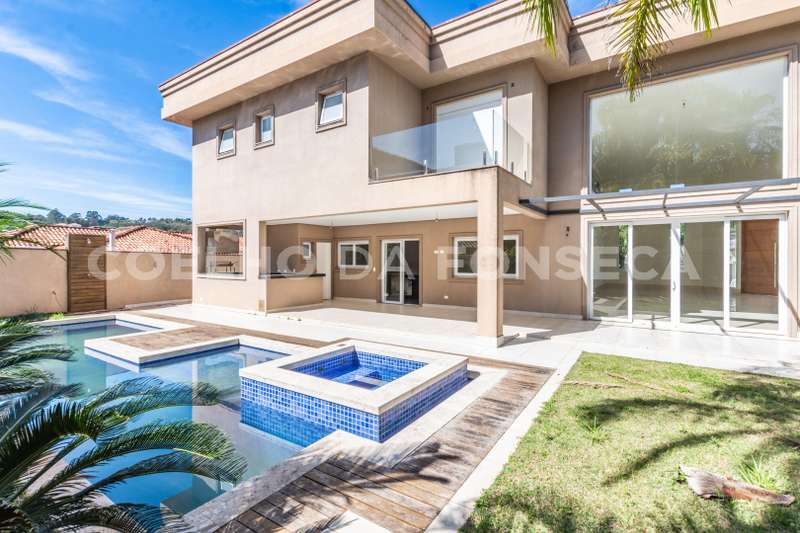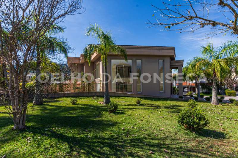 De esquina. Elevador panorâmico, living para três ambientes com pé direito duplo, duas suítes Master com hidro, sendo uma no piso térreo e outra no piso superior com closet e banheiro Sr. e Sra, mais três suítes com closet no piso superior. Sala de cinema, sala íntima, seis vagas de garagem cobertas, salão de festas, escritório, copa de apoio, cozinha com ilha, espaço gourmet com vista para montanha e piscina com raia integrada com SPA borda infinita.
