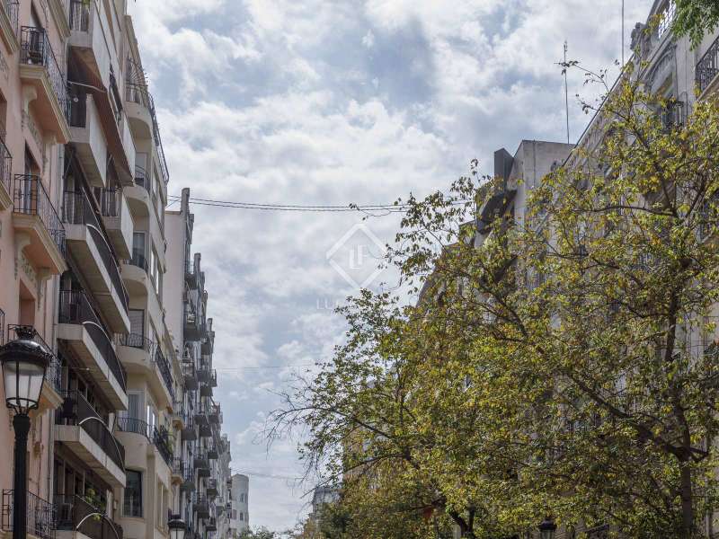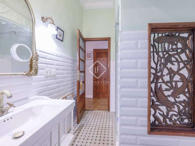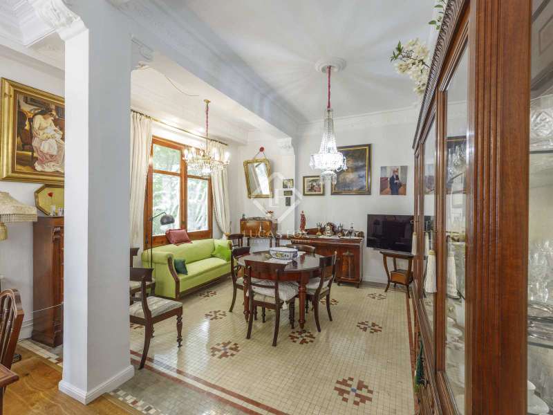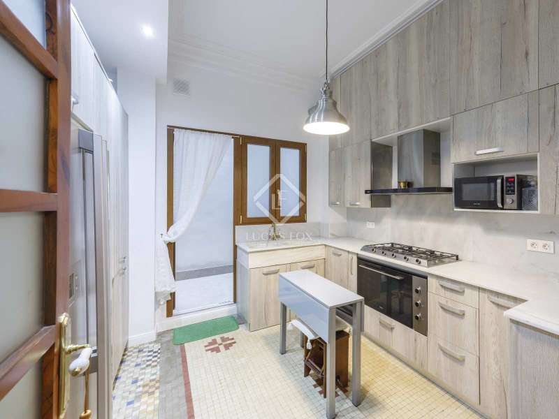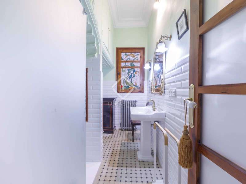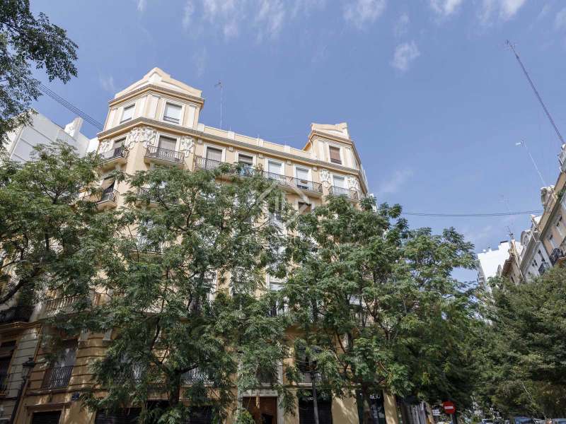This property is located on the first floor of a period building, perfectly preserved and with the common elements very well maintained. It is located on one of the best streets in the Gran Vía neighbourhood , in a quiet and tree-lined section, very close to the Turia River Gardens, one of the largest green areas in the city of Valencia. The property has been completely renovated, with exquisite taste, fully respecting all the period architectural elements, which give it such a special character. The mosaic floors have been completely restored in a large part of the property and the original solid wood interior carpentry has been restored. In addition, the entire property is fully thermally and acoustically insulated to ensure greater comfort, with exterior carpentry with double glazing. We enter the property through a practical entrance hall, which gives us access, on the right, to the living-dining room area, of impressive dimensions and with several rooms. It has four large windows on the façade, through which abundant natural light enters. Right next to the living room, on the left, is the kitchen, with a square floor , with a large storage capacity and access to a pleasant terrace. A wide hallway, with a beautiful period wardrobe with perfectly restored stained glass windows, leads us to the night area. We find a double bedroom , with a window to a light well and a full bathroom with a large shower. At the back of the property and facing a large and sunny block patio, is the main bedroom, of generous dimensions, with an elegant full bathroom , in harmony with the atmosphere of the rest of the property. The entire property retains the high ceilings with original moldings that have been perfectly restored, polished mosaic and natural oak parquet floors, interior carpentry made of natural wood and exterior carpentry with double glazing and thermal and acoustic insulation. It also has individual gas heating. Get in touch for more information.