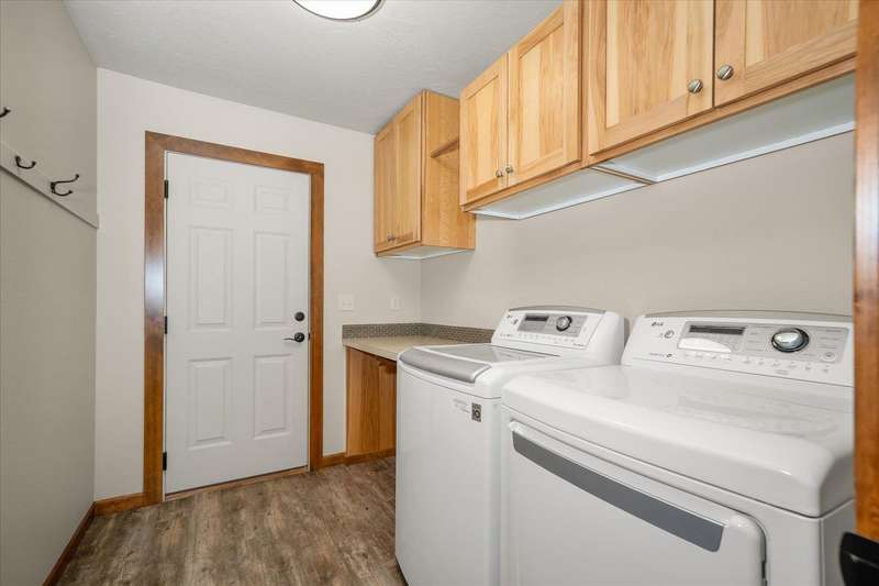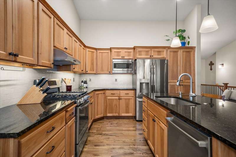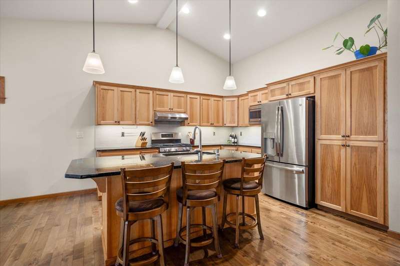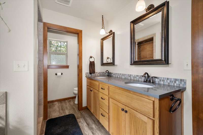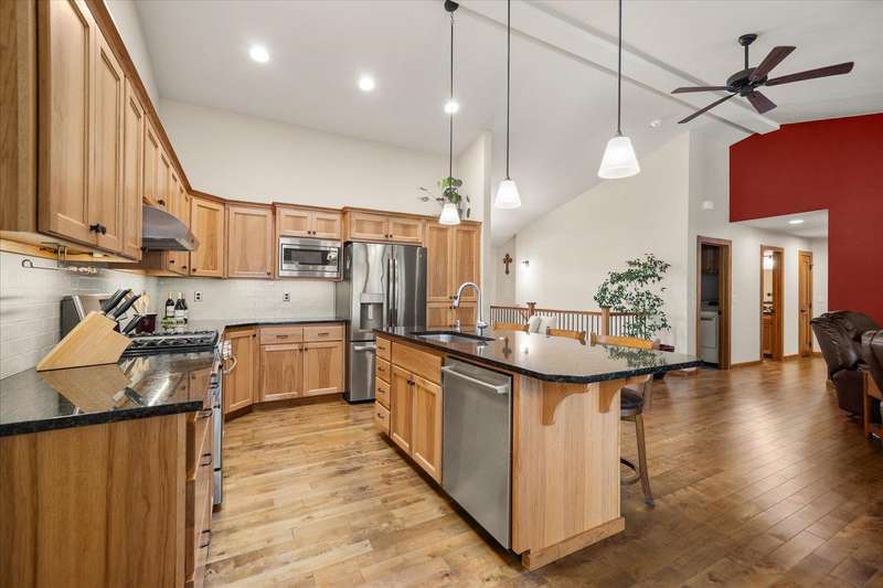 Enjoy main floor living in this stunning 6 bedroom, 3 bathroom daylight rancher with a 3-car garage nestled in Eagle Ridge. Step inside to vaulted ceilings, hardwood floors, and an open concept living area anchored by a cozy fireplace. The kitchen shines with custom cabinetry, hard-surface counters, stainless appliances, gas range, and an island with eat bar. Main floor living is complete with laundry, full bath, 3 bedrooms including a spacious primary suite with walk-in closet, garden tub, double vanity. The daylight walkout basement boasts high ceilings, a spacious family room, full bath with dual sinks, 3 additional bedrooms including one oversized room ideal for a man cave or second family room. Enjoy the amazing, covered deck and patio overlooking a private, landscaped backyard perfect for entertaining. Conveniently located near trails, parks and community charm with easy access to shopping and downtown Spokane.