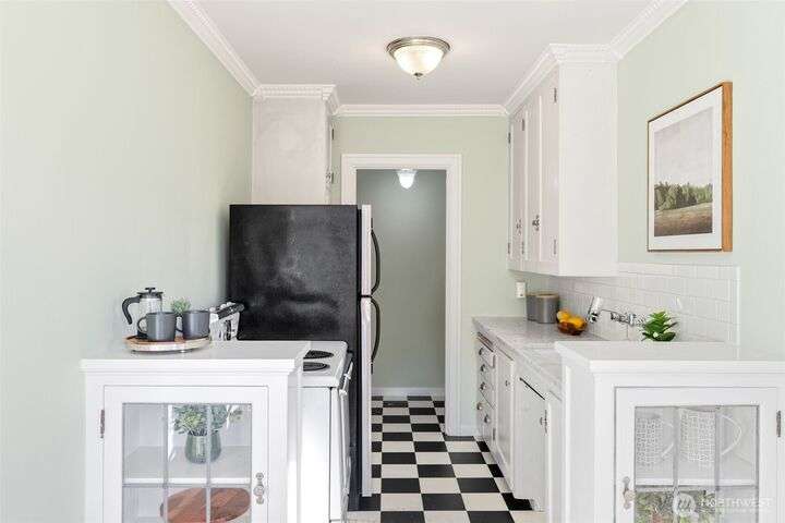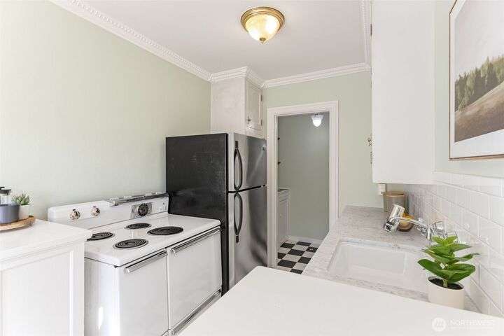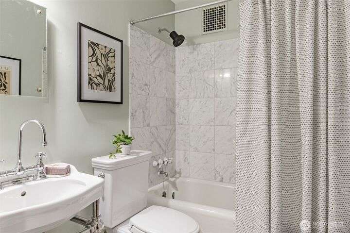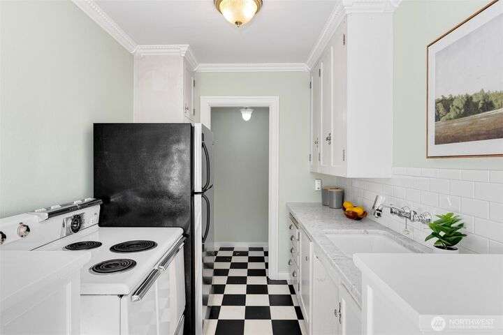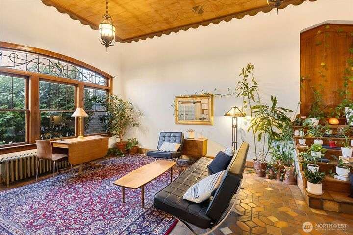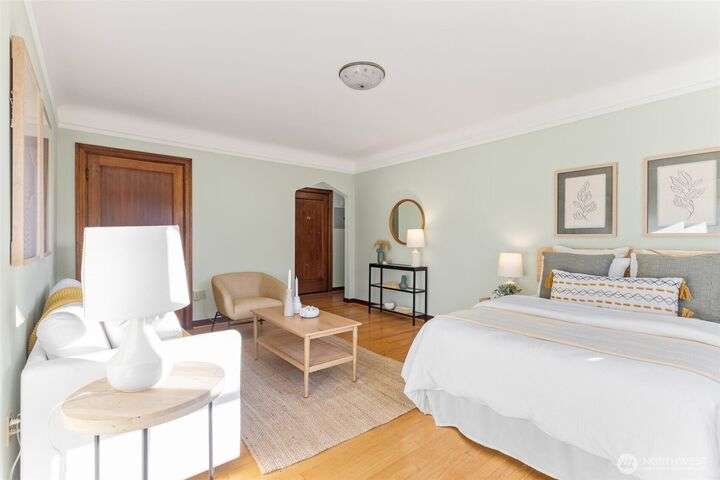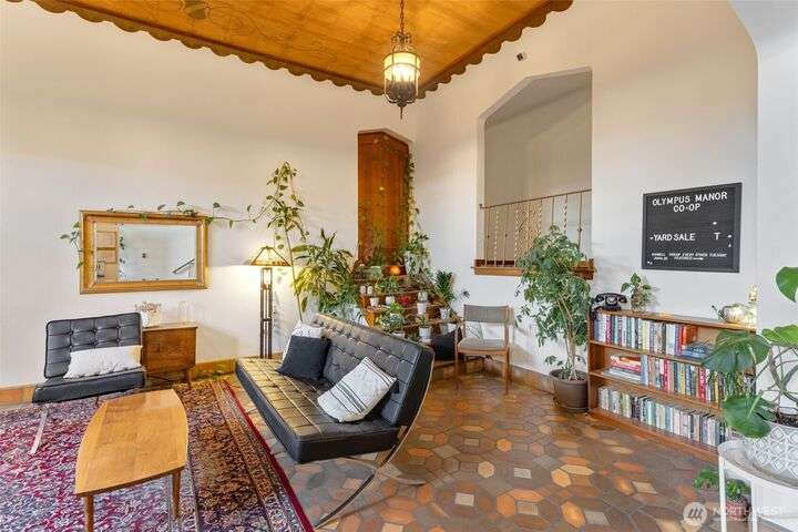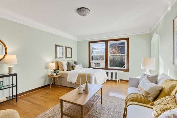 Sweet studio living in this 1920’s Queen Anne classic, Olympus Manor. Light and bright with big windows and coved ceilings highlight the period details throughout. Mahogany doors and trim with charming crown molding frame this open layout. Hardwood floors and tiled kitchen lay the groundwork for this beauty to shine. Formal entry gives nice separation and a wide living space allows multipurpose arrangement with a huge walk-in closet. Wonderful kitchen has dining space with windows, display glass cabinets and a walk-in pantry. Close to Seattle’s iconic landmarks, entertainment and sports, parks and recreation. HOA dues include all the extras, property taxes too, with additional storage and laundry included.