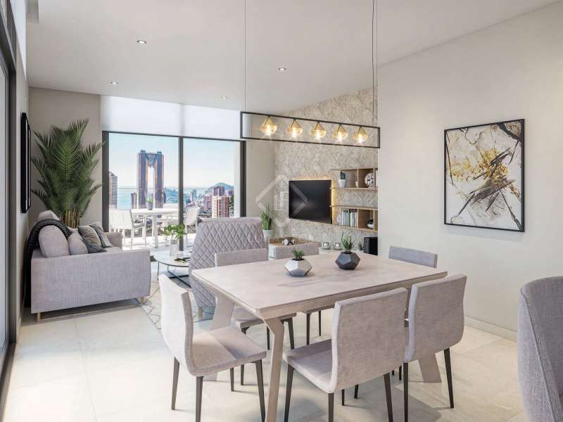 Lucas Fox is pleased to present this new build development with apartments in a privileged location in Benidorm. The development is located next to the Las Rejas Golf countryside and near the sea, just one kilometer from Poniente beach and with excellent communication with both the N-332 and the AP7. This location in the Poniente area of Benidorm offers all the amenities and attractions that this popular coastal town has to offer This development has a single tower with a varied typology of homes. This magnificent penthouse is exceptionally distributed over two floors. The lower floor welcomes us with a spacious and bright living-dining room with an open-plan kitchen, designed to create a cozy and modern atmosphere. On this floor, we also find a main bedroom with a private bathroom, as well as two additional bedrooms and another full bathroom for greater comfort. An additional toilet completes this floor. From the living room, you access the terrace with glass railings, which allow you to enjoy greater light and exclusive views. However, on the upper floor there is a large terrace that offers unparalleled recreation space. Here, you can enjoy sunny days, social gatherings or simply relax while taking in the stunning views this prime location offers. The apartment has a parking space, with pre-installation for electric cars, and a storage room in the basement included in the price. As for the qualities of the property, it has high-quality finishes and meticulous attention to details, but it should be noted that you can choose between Excellence or Premium finishes. The development includes magnificent communal areas of 5,400 m² with a swimming pool for adults, a children's pool, two jacuzzis, a children's area, an equipped gym, a paddle tennis court, a multi-sports court, green areas and several bicycle parking areas . For more information, do not hesitate to contact us by email at altea@lucasfox.es and/or by phone number +34 965 208 331.