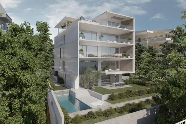 This exquisite 353 sq.m. ground floor apartment in Voula offers an unparalleled living experience across three meticulously designed levels, featuring a private entrance, lush garden, and swimming pool.