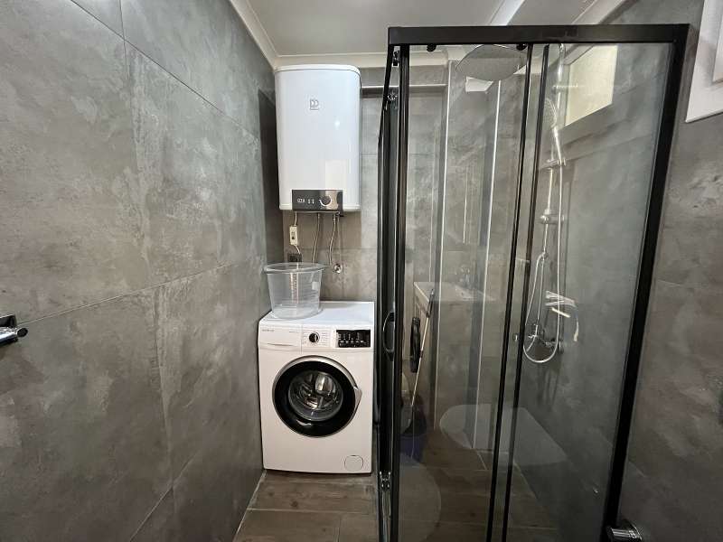 The apartment with a garden view on the ground floor has an open-plan kitchen, a bathroom, and a bedroom. The apartment has the advantage of short-term rent and high rental income due to its location.