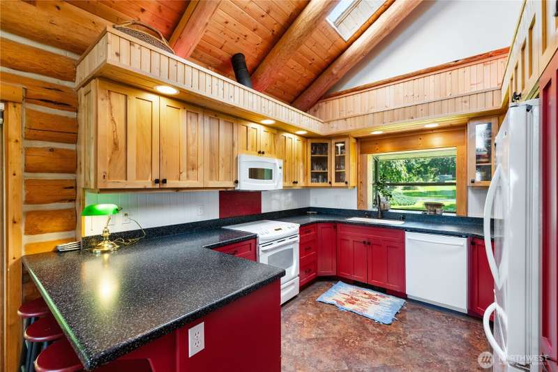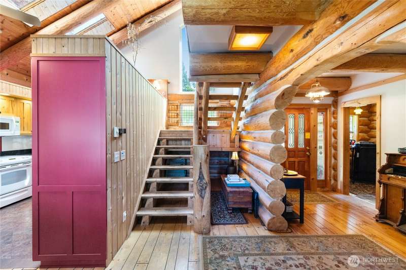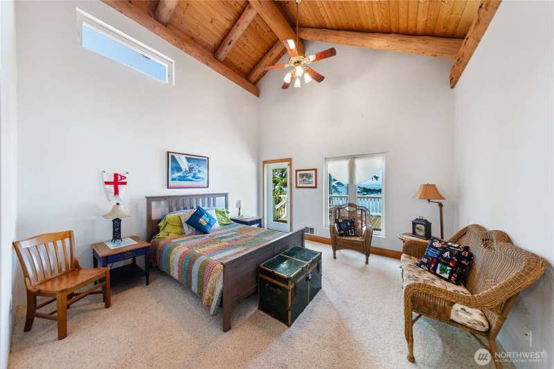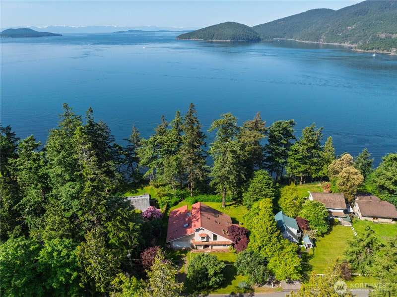 Experience the magic of waterfront living with 102 ft of high bank frontage, offering spectacular westerly sunset views over Cypress Island, the Olympic Mts and Bellingham Channel. Custom log home blends rustic charm w/ modern comfort, featuring vaulted ceilings and a wall of windows to let the natural light and views in. Remodeled kitchen with lots of cabinets and newer appliances. Main level master bedroom and master bath with access to a deck. Upper level has two bedrooms and one full bath. Large decks on both upper and main level. 798 SF car garage with attached shop. Sunroom with woodstove for a cozy place to relax. Community beach access.