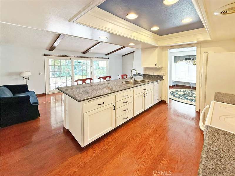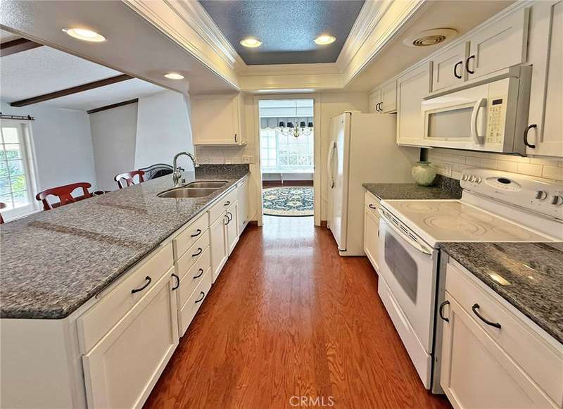 Welcome to this highly desirable 4-bedroom, 2-bath single-story home with over 1,600 sq. ft., located on a fabulous cul-de-sac street! The home features beautiful hardwood floors throughout the living room, dining room, kitchen, and family room. The remodeled kitchen boasts all-white shaker cabinetry, granite countertops, tile backsplash, white appliances, a raised ceiling with crown molding, recessed lighting, and a spacious breakfast bar with seating--all opening to the family room with fireplace, cathedral ceilings, and a French slider that leads to the private backyard with covered patio, lawn, gardens, a shed, and an extra wide side yard. Additional highlights include newer central A/C and furnace, tile roof over the main house, three guest bedrooms, a guest bath with tub/shower combo, and a spacious primary suite with a walk-in cedar-lined closet, upgraded dual-sink vanity, and walk-in shower. With just a few cosmetic updates, this home will be a perfect 10!