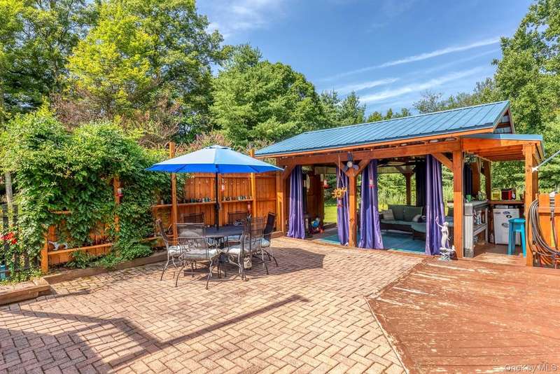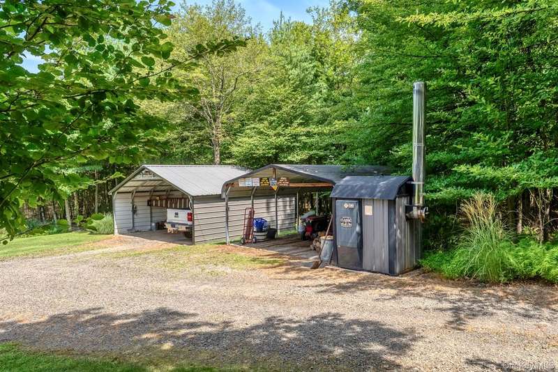 Tucked in the heart of the Catskills, this meticulously maintained property is a private retreat where every detail has been thoughtfully designed for comfort, beauty, and enjoyment. Surrounded by lush, mature landscaping, the home's outdoor spaces are truly extraordinary?swim in the sparkling pool, entertain on the expansive patio with wet bar, rinse off in the outdoor shower, or simply relax while taking in seasonal mountain views over the serene pond.Inside, the gorgeous granite kitchen features an inviting eat-in area overlooking the yard, a large movable island for flexible prep and serving space, and seamless flow into the living areas. Don't miss the primary suite with full bath. The walkout lower level offers additional living and entertaining possibilities, perfect for guests or a home office.Practical amenities abound, including an RV garage, carport, and outdoor wood boiler for efficient heating. Located in a peaceful setting yet within easy reach of the Ashokan Reservoir, hiking trails, and the vibrant towns of Stone Ridge and Woodstock, this property offers a rare combination of seclusion, style, and convenience?an ideal full-time residence or weekend escape. This property has 2 parcels. 53.3-4-28.200, 53.3-4-27.100 One is wooded and could be built on but is kept as a buffer that makes this a gorgeous private piece. I added the assessment and taxes together .