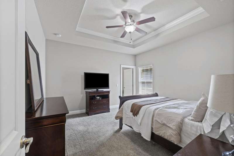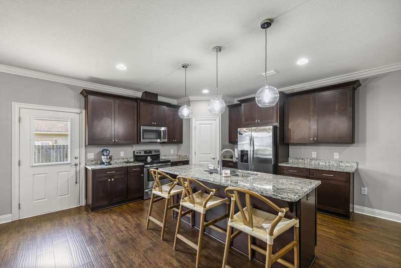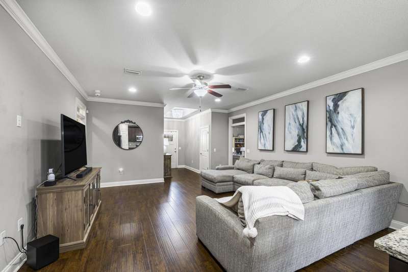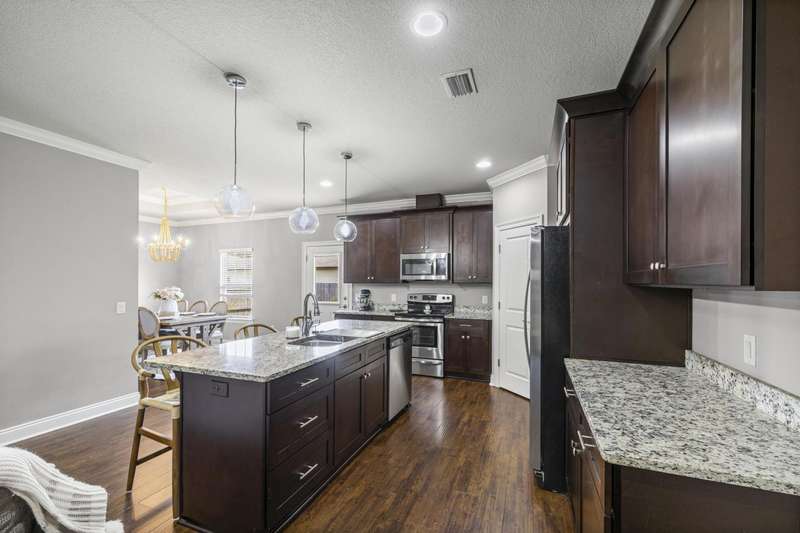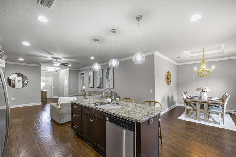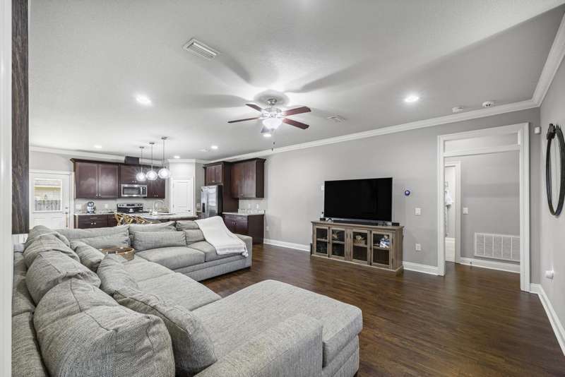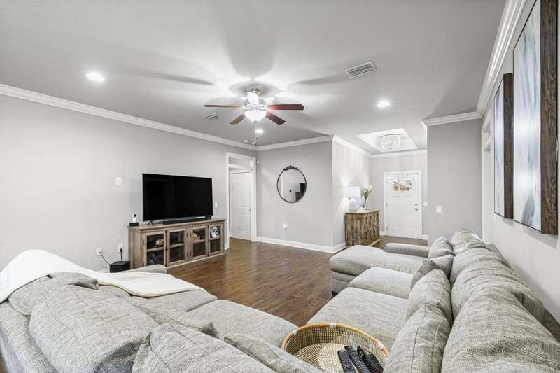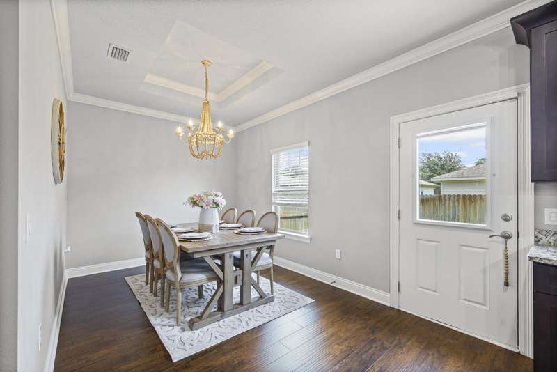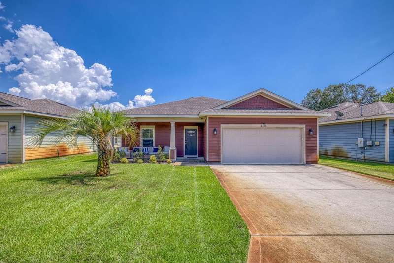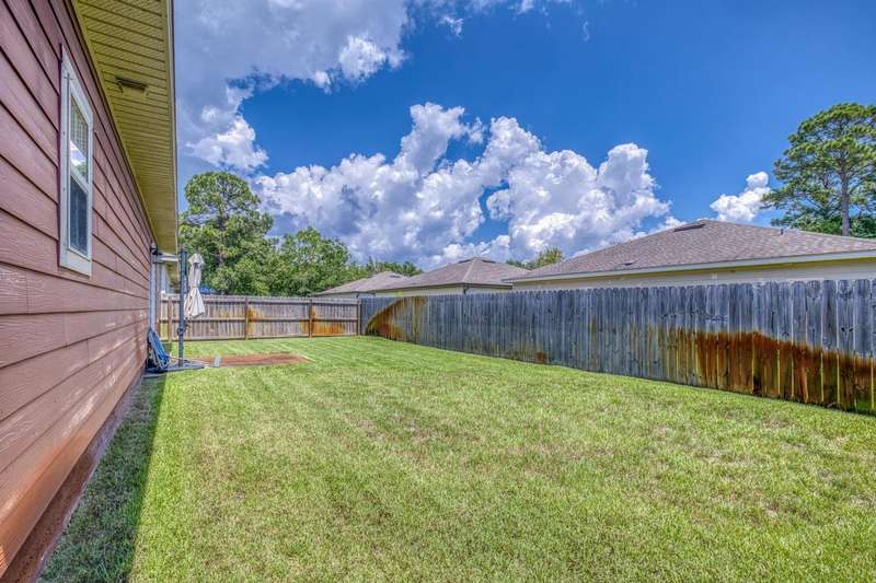 Move-in ready 3 bedroom, 2 bathroom single-family home with 1623 sq ft of living space. Built in 2015, this property offers No HOA and sits on a quiet street in Navarre. Inside you'll find an open floor plan with wood laminate flooring in the main living areas, neutral tile in the wet zones, and carpet in the bedrooms. The primary suite features a tray ceiling, custom walk-in closet with built-ins, and a private bath. Crown molding, wide baseboards, transom windows, and upgraded doors and hardware add detail throughout. The kitchen features granite countertops, stainless steel appliances, breakfast bar seating along with a separate dining room, plenty of cabinet space and a pantry. The exterior is clad in durable Hardie board with an architectural shingle roof. Outdoor features include a covered front porch, fenced backyard, sprinkler system, and two-car garage. Located in East Navarre close to Hurlburt Field, Eglin AFB, shopping, schools, dining, and the white sand beaches of Navarre.