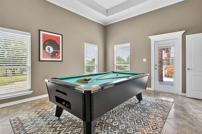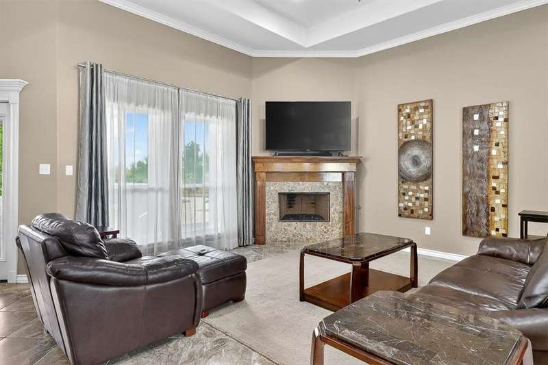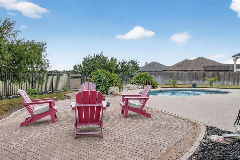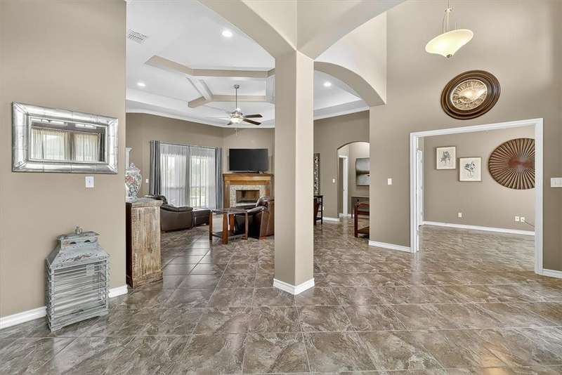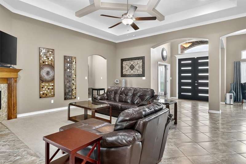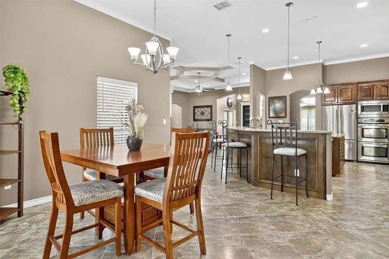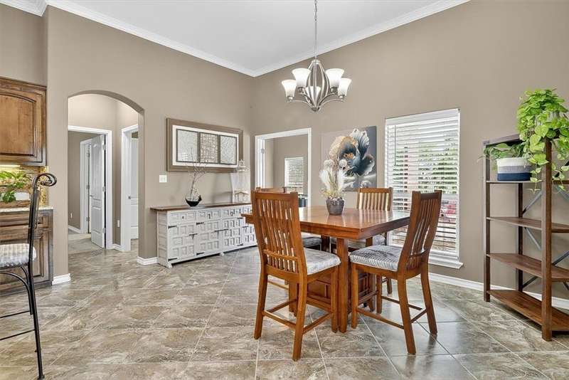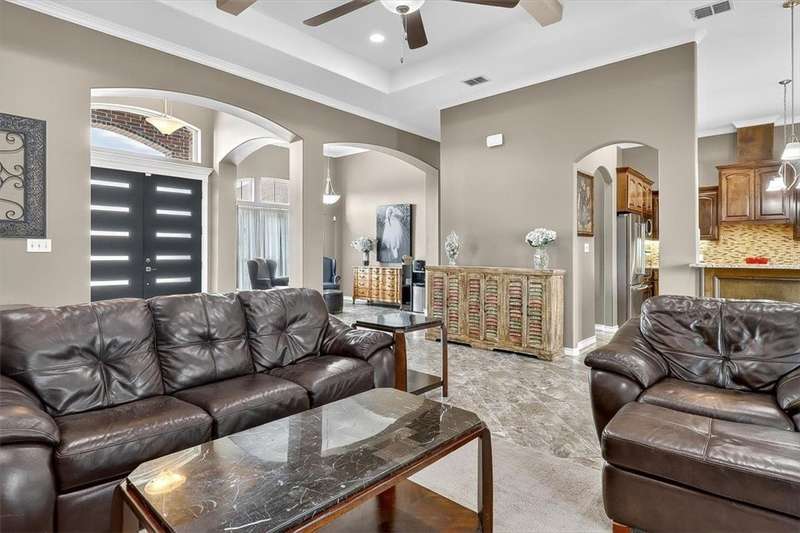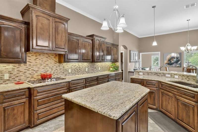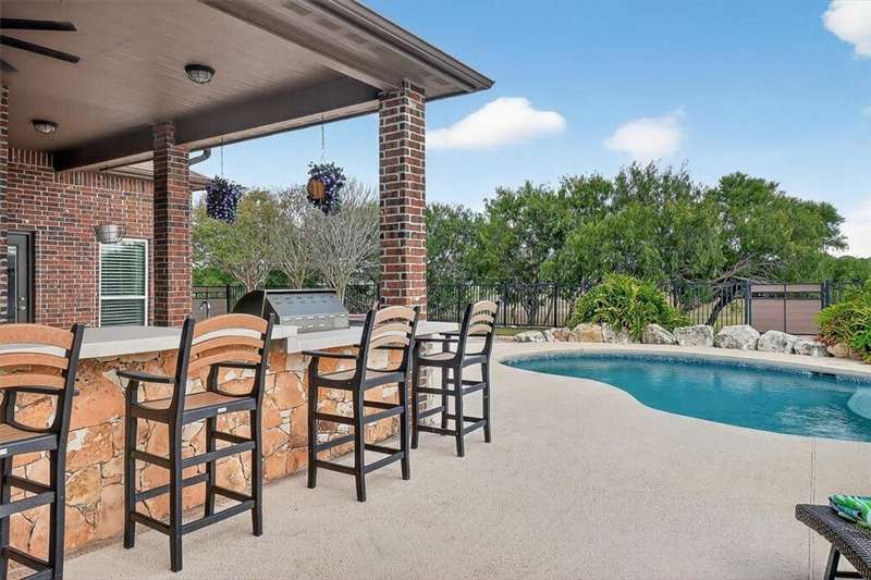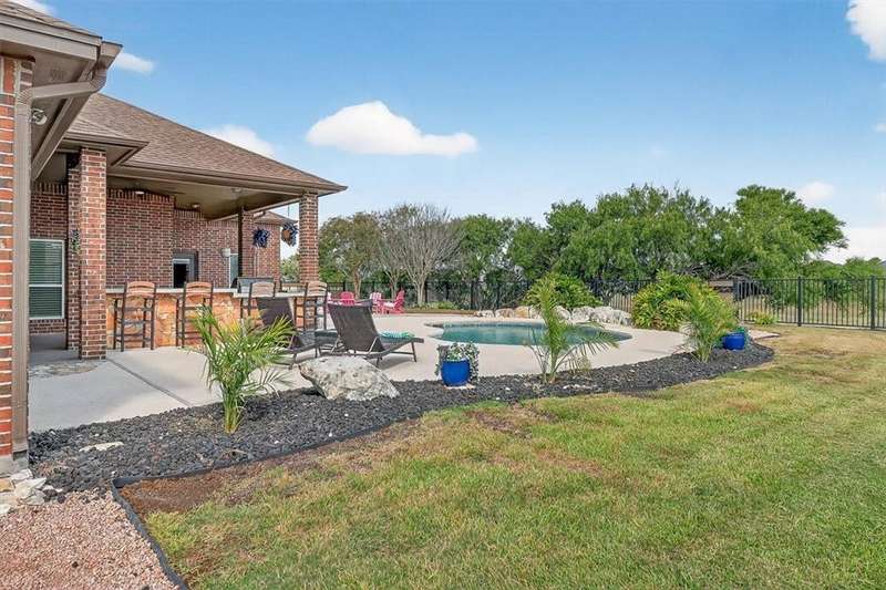 Luxury awaits in this meticulously maintained 4-bedroom, 3-bath, 3-car garage home with a desirable 3-way split floorplan. The elegant entry opens to a formal dining room and French-door office. The inviting living area features a cozy fireplace, recessed lighting, and expansive windows that bathe the home in natural light. A chef's kitchen showcases custom cabinetry, glass-tile backsplash, center island, walk-in pantry, stainless steel double ovens, professional gas cooktop, and a sunlit breakfast nook overlooking the covered patio. The private owner's suite boasts trayed ceilings, a spa-inspired jetted tub and custom shower, dual vanities, an oversized walk-in closet with built-ins, and private access to the patio and pool. Two large secondary bedrooms share a beautifully designed Jack & Jill bath, while a spacious guest suite enjoys its own full bath. A generous game room provides flexible space for recreation, media, or entertaining. Step outside to a private retreat with covered patio, custom outdoor kitchen with bar seating, sparkling pool, lush landscaping, and sweeping views. Architectural details such as arched entries, crown molding, premium flooring, vaulted ceilings, and custom lighting enhance the home's timeless appeal. A 3-car garage, circular driveway, and custom gated fencing complete this remarkable property.