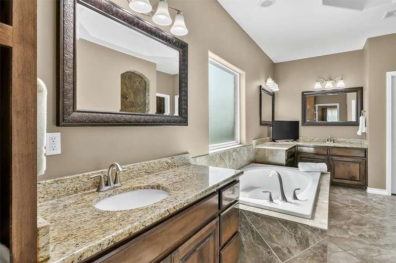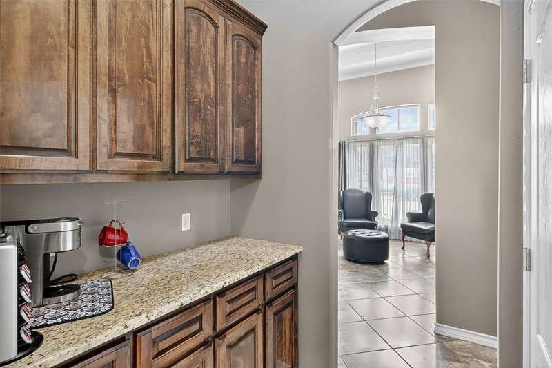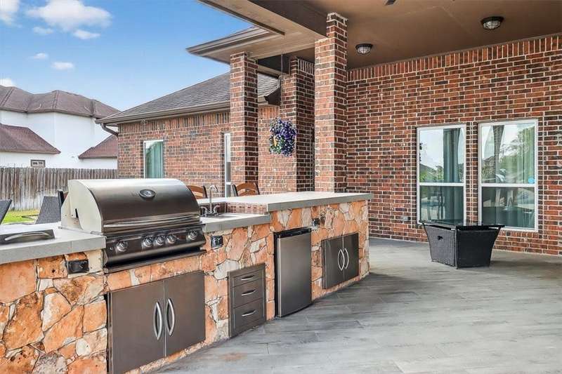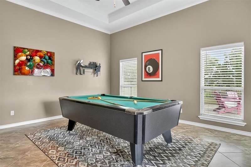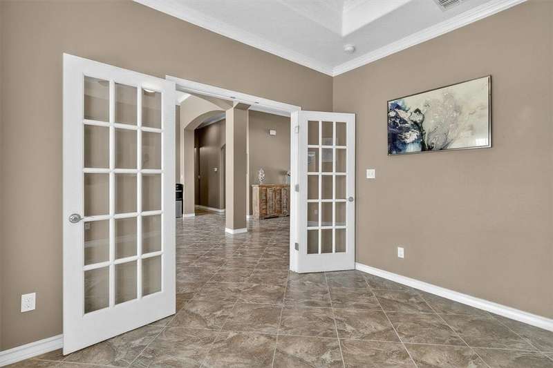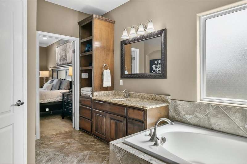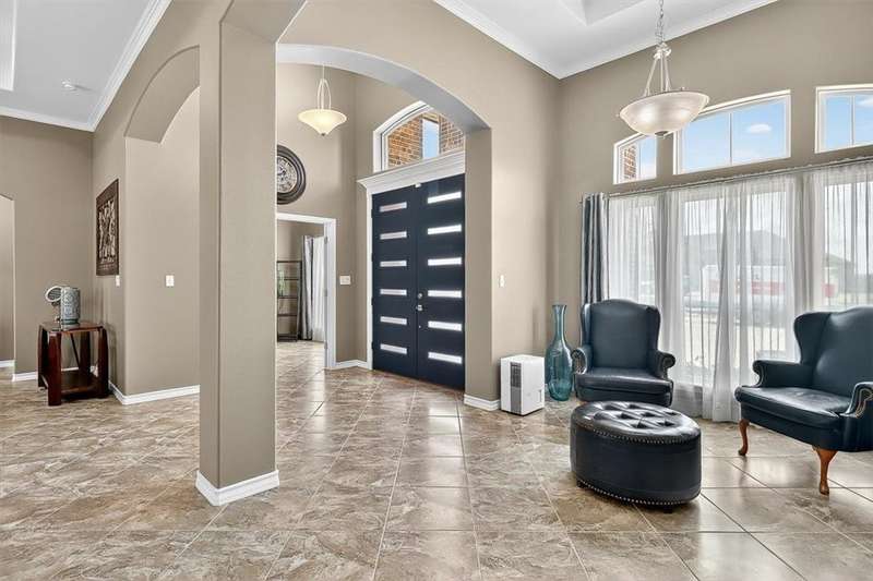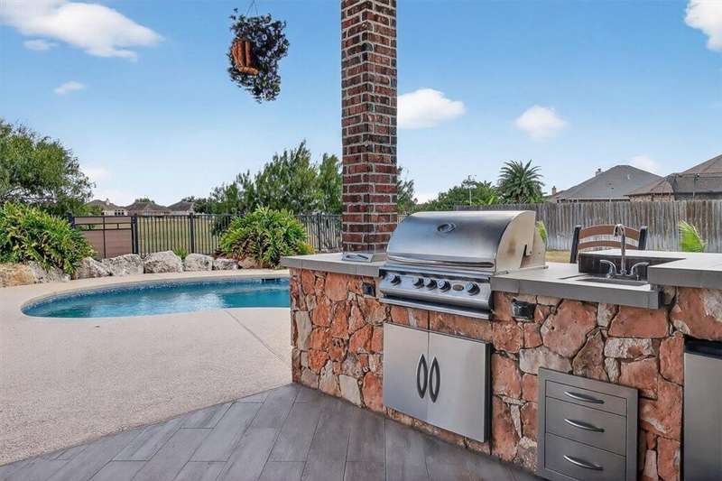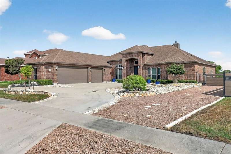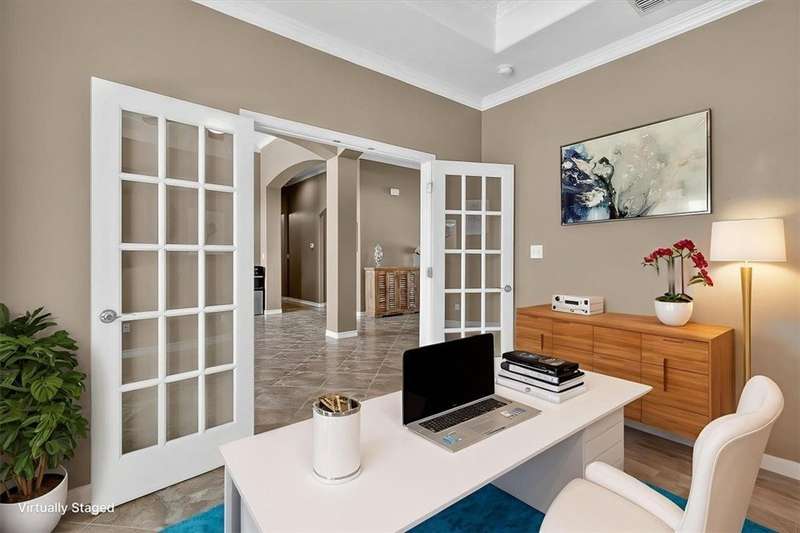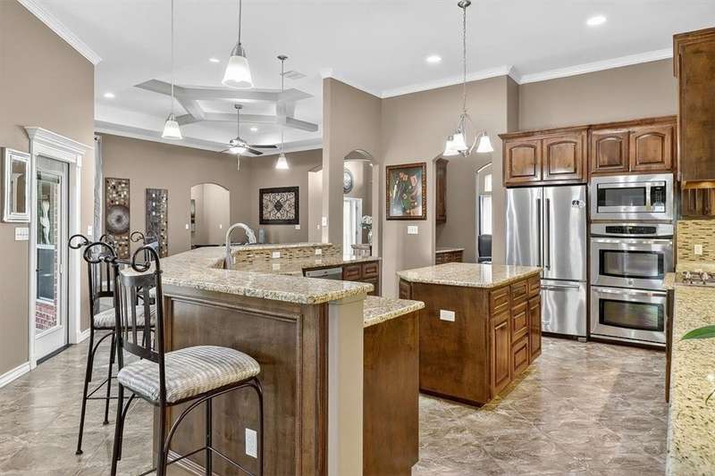 Luxury awaits in this meticulously maintained 4-bedroom, 3-bath, 3-car garage home with a desirable 3-way split floorplan. The elegant entry opens to a formal dining room and French-door office. The inviting living area features a cozy fireplace, recessed lighting, and expansive windows that bathe the home in natural light. A chef's kitchen showcases custom cabinetry, glass-tile backsplash, center island, walk-in pantry, stainless steel double ovens, professional gas cooktop, and a sunlit breakfast nook overlooking the covered patio. The private owner's suite boasts trayed ceilings, a spa-inspired jetted tub and custom shower, dual vanities, an oversized walk-in closet with built-ins, and private access to the patio and pool. Two large secondary bedrooms share a beautifully designed Jack & Jill bath, while a spacious guest suite enjoys its own full bath. A generous game room provides flexible space for recreation, media, or entertaining. Step outside to a private retreat with covered patio, custom outdoor kitchen with bar seating, sparkling pool, lush landscaping, and sweeping views. Architectural details such as arched entries, crown molding, premium flooring, vaulted ceilings, and custom lighting enhance the home's timeless appeal. A 3-car garage, circular driveway, and custom gated fencing complete this remarkable property.