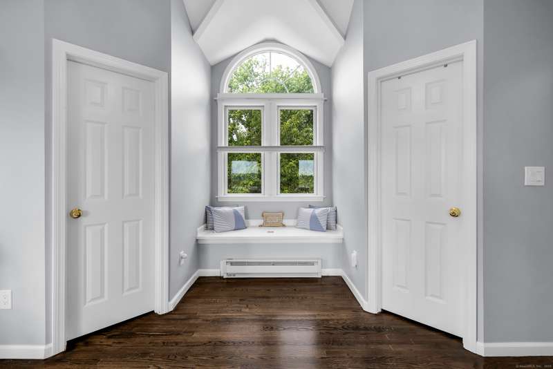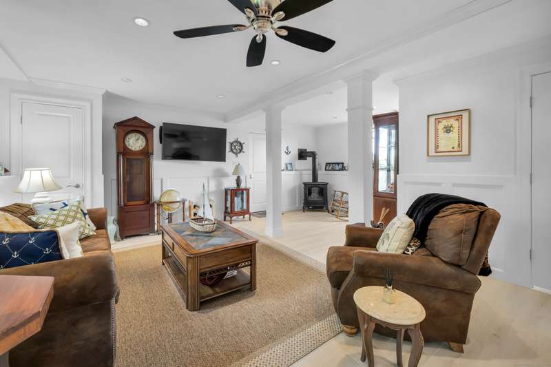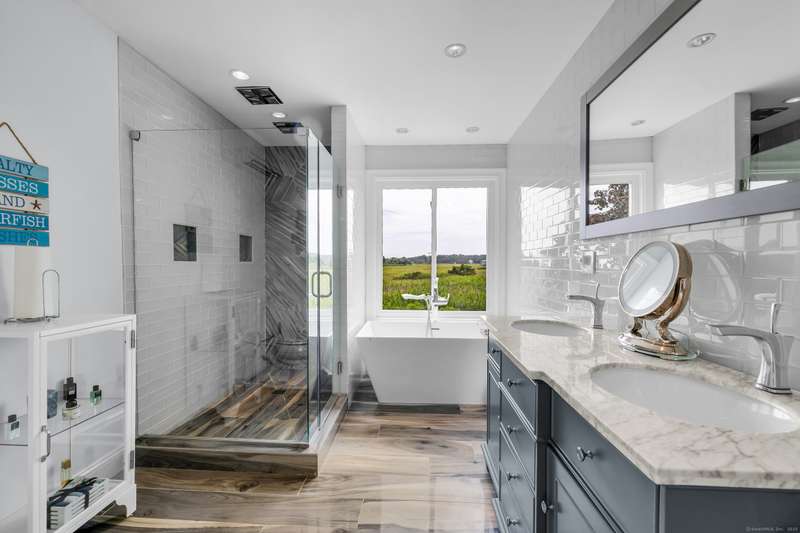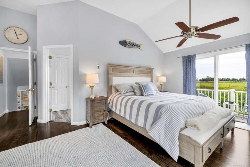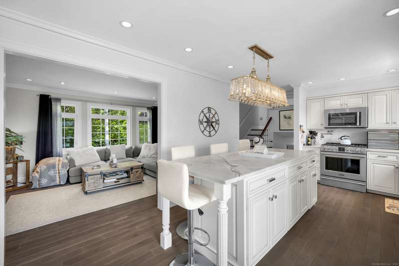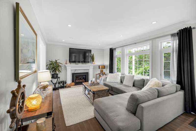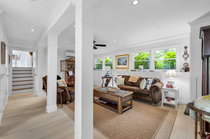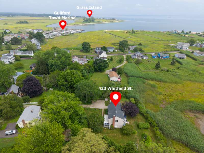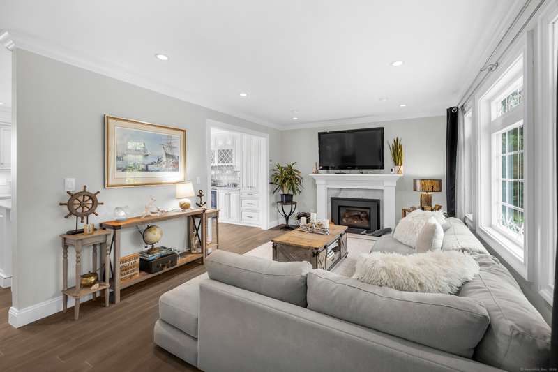 Truly exceptional turnkey property sits on a peaceful 1-acre lot along the desirable, sidewalk-lined Whitfield Street. This fully renovated and thoughtfully reimagined home offers light-filled living spaces, beautiful hardwood flooring, and crown molding throughout. Charming curb appeal welcomes you with an inviting front porch that leads into a living room with a gas fireplace. The open-concept layout flows seamlessly into a stunning kitchen, featuring custom cabinetry, a large center island, stainless steel appliances, and a breakfast/dry bar with wine fridge. The luxurious primary suite occupies the entire upper level and offers two walk-in closets with built-ins, a cathedral ceiling, private balcony with fabulous water views, and a spa-inspired bath complete with a soaking tub, walk-in shower with designer tile and glass enclosure, and a dual-sink vanity. The second floor offers two additional bedrooms, a beautifully remodeled full bath, and an open style office; perfect for remote